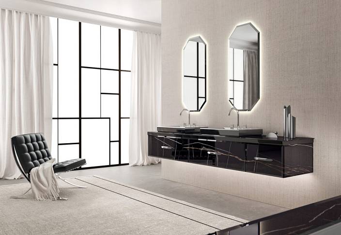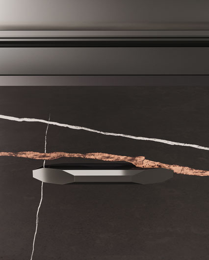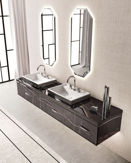 Cтолешница из сверхапрозрачного стекла Sahara Noir со скошенным краем, профиль из черной хромированной стали (Ш 225 cm Г 54,9 cm B 4,8 cm)