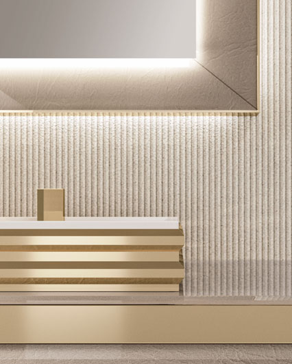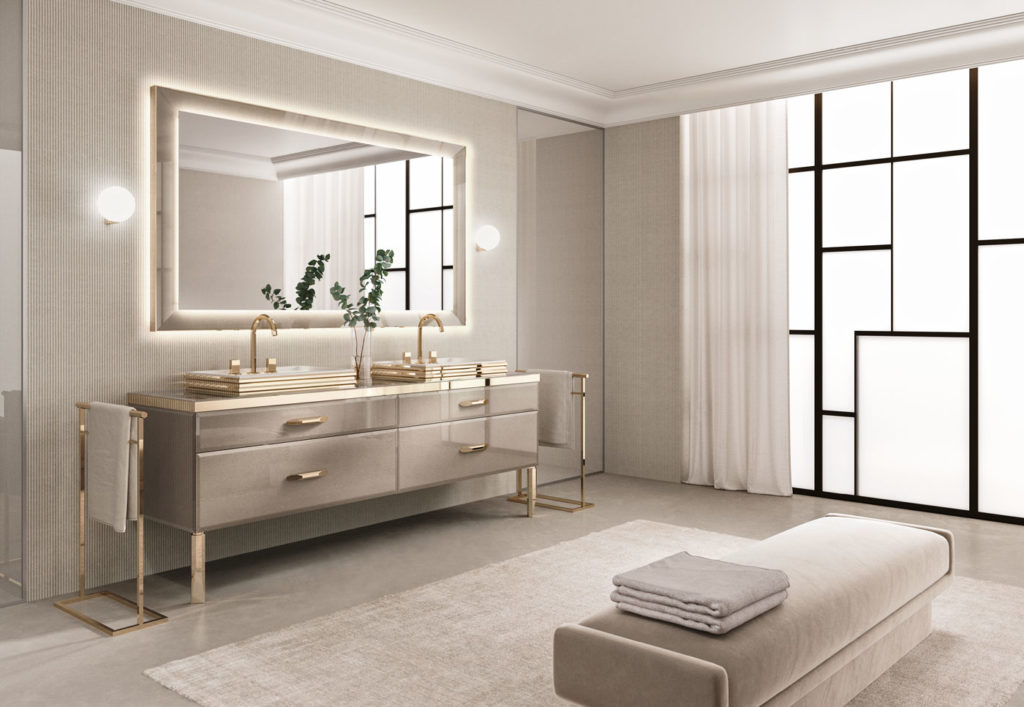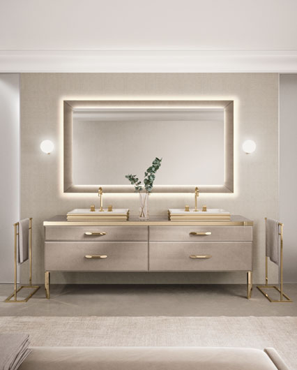 Тумбы для раковины из прозрачного стекла elephant gold со скошенным краем. Pучки и ножки из хромированной стали золотистого цвета (Ш 216 cm Г 54,9 cm B 48 cm)