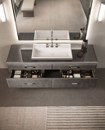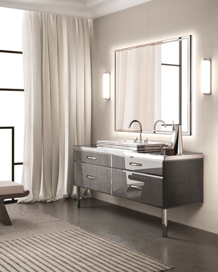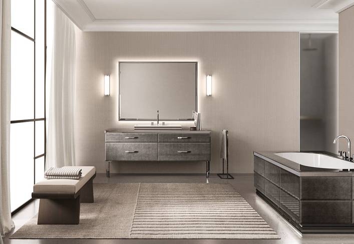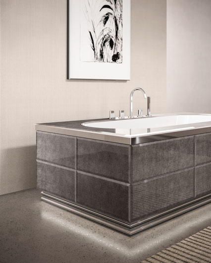 Ванна Zurigo 200 с отделкой из сверхпрозрачного стекла alligator silver со скошенным краем, кромка столешницы из полированной стали и цоколем со светодиодной подсветкой (Ш 200,5 cm Г 100,5 cm B 58 cm)