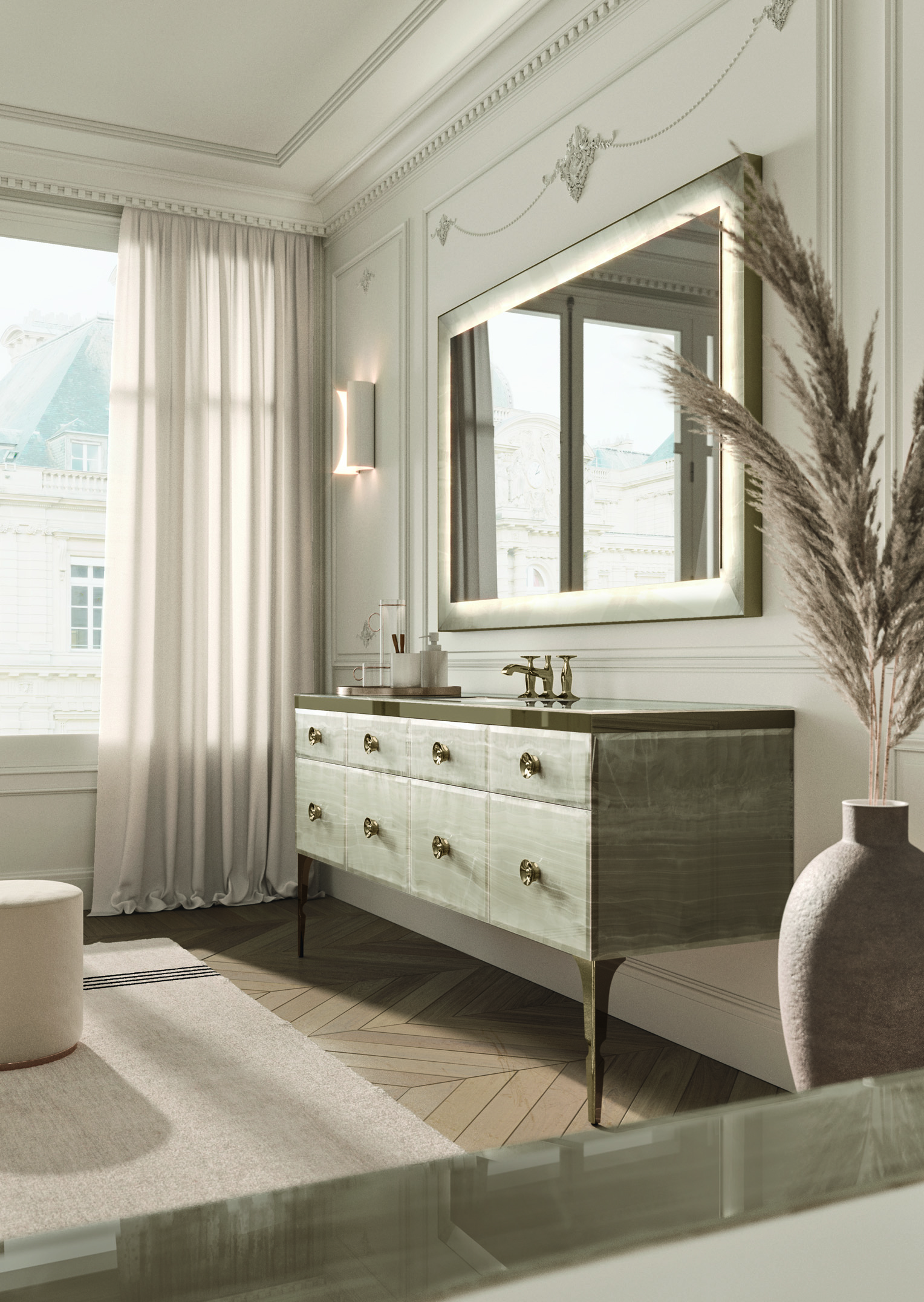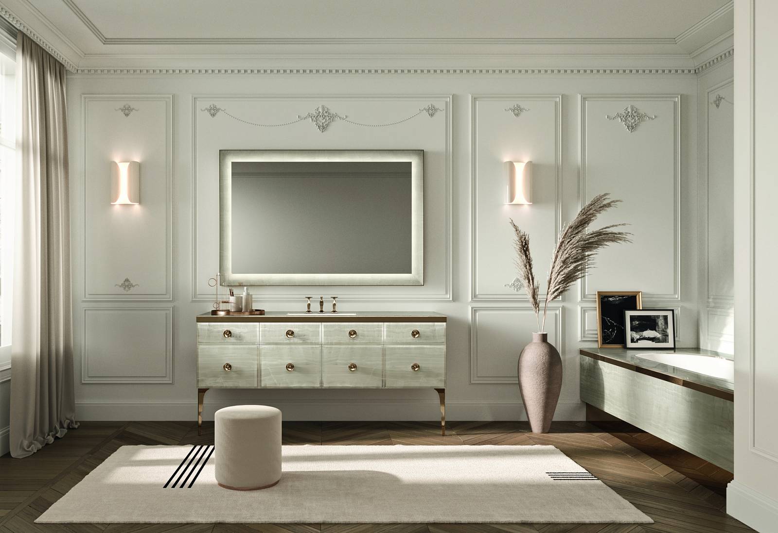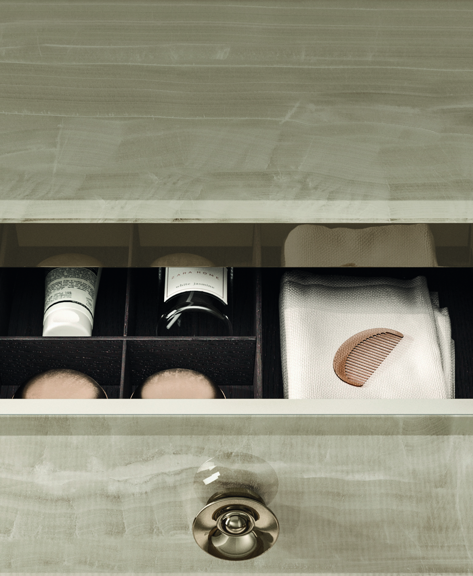 Последние новости: металлические ножки, знаковый элемент коллекции Majestic, теперь имеют более ажурный дизайн в сочетании с ручкой, отличающейся лёгким и изящным дизайном. Ещё одной новинкой коллекции является отделка под драгоценный мрамор в сочетании со стеклом: уникальное решение, вошедшее в обширную коллекцию доступных отделок.