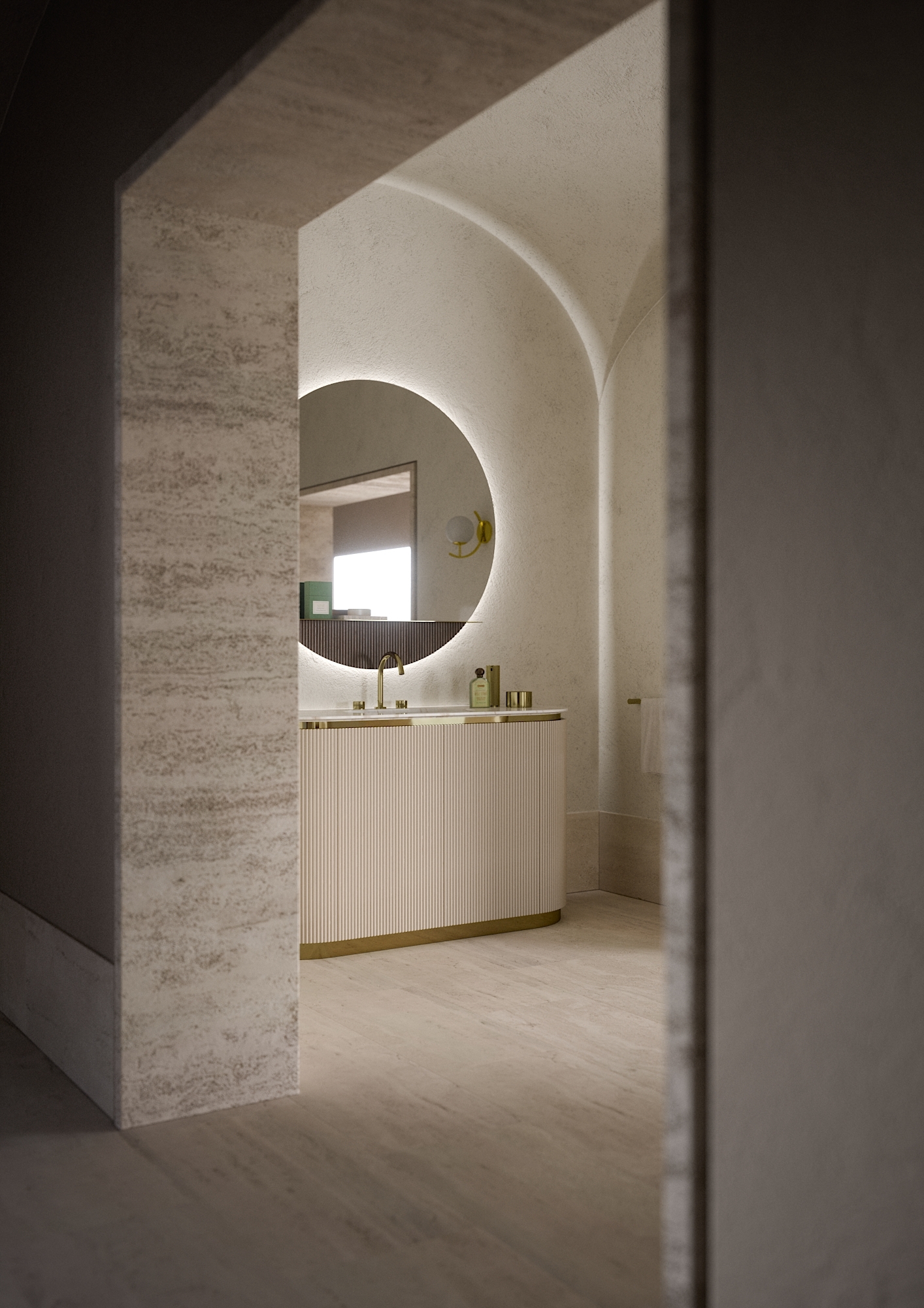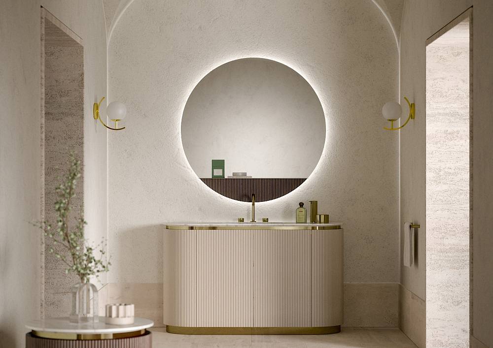 Зеркало: круглая модель Arko Round, оснащенная встроенной светодиодной подсветкой и удобной полкой.