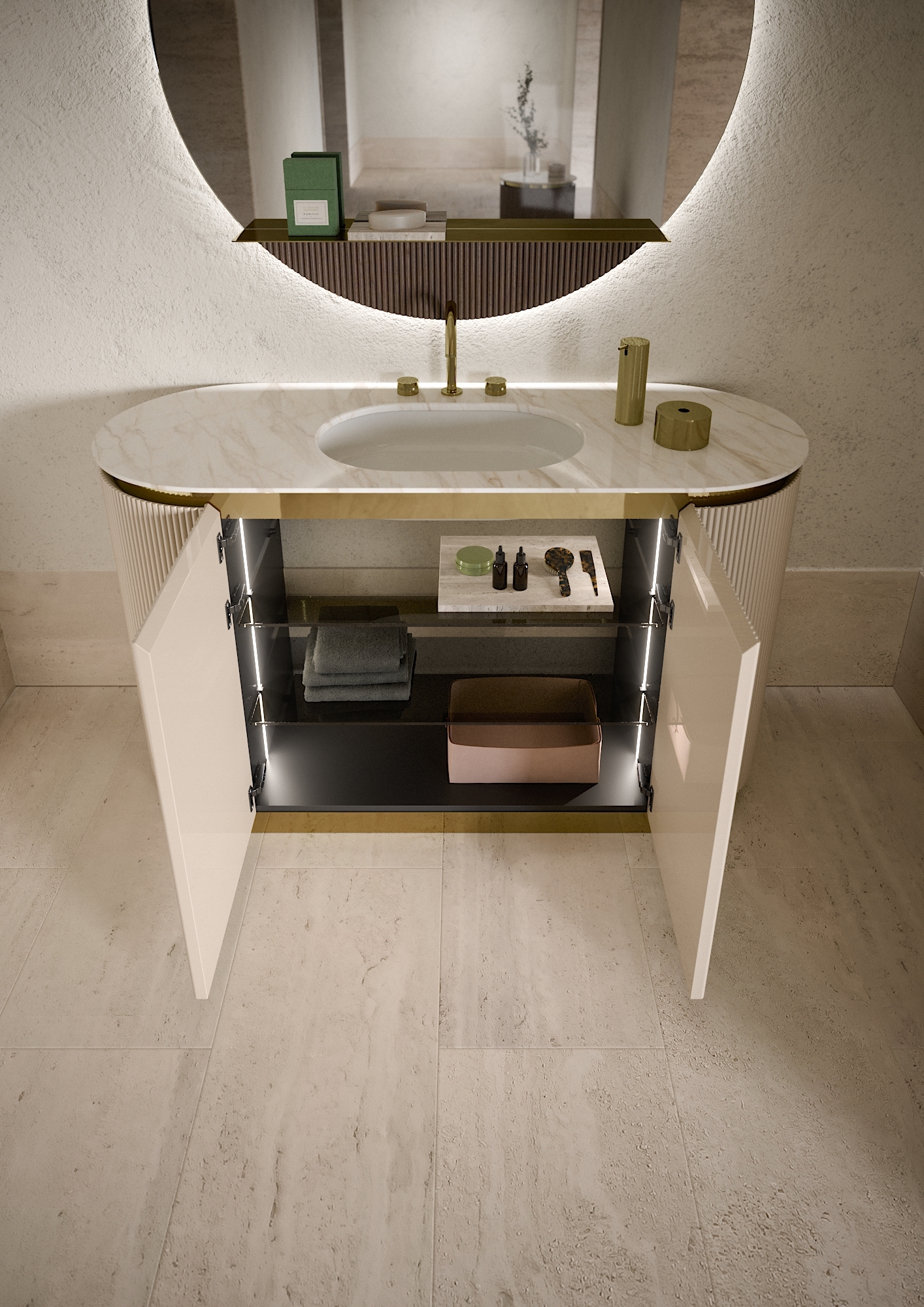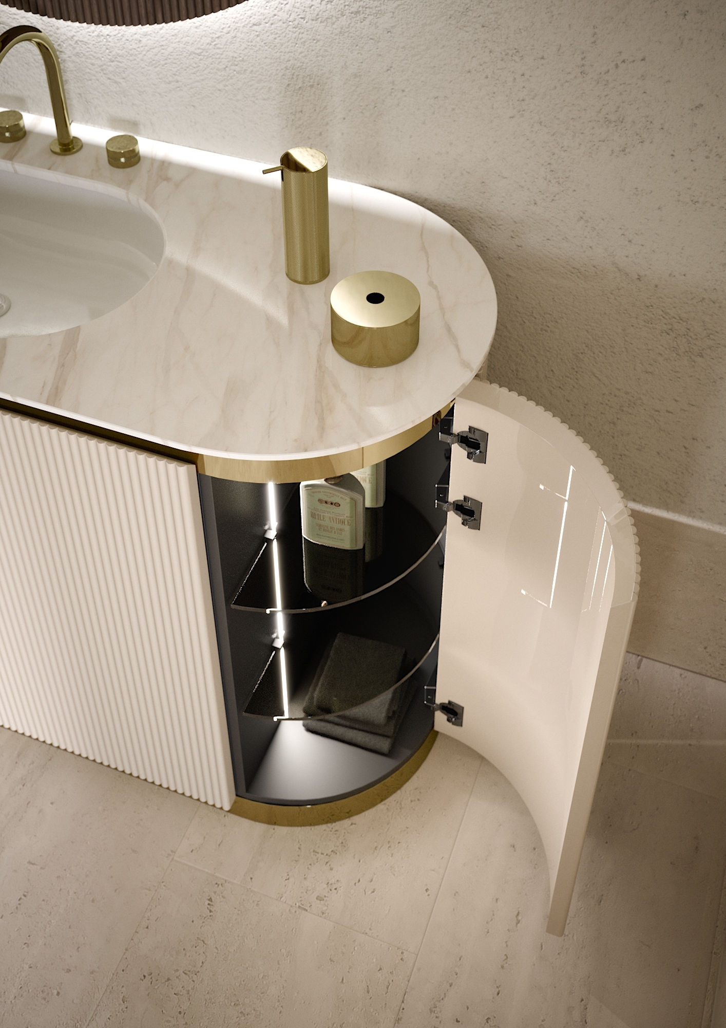 Гибкость композиций: коллекция позволяет выбирать между боковыми изогнутыми элементами с одной дверцей или прямыми модулями с боковой панелью – для создания линейных или плавных изогнутых композиций.