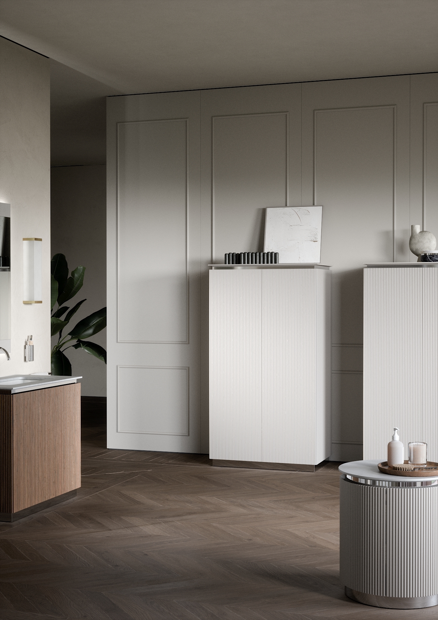 Гибкость конфигурации: возможность комбинировать изогнутые модули с дверцей или прямые элементы с боковиной для создания линейных или плавных композиций.