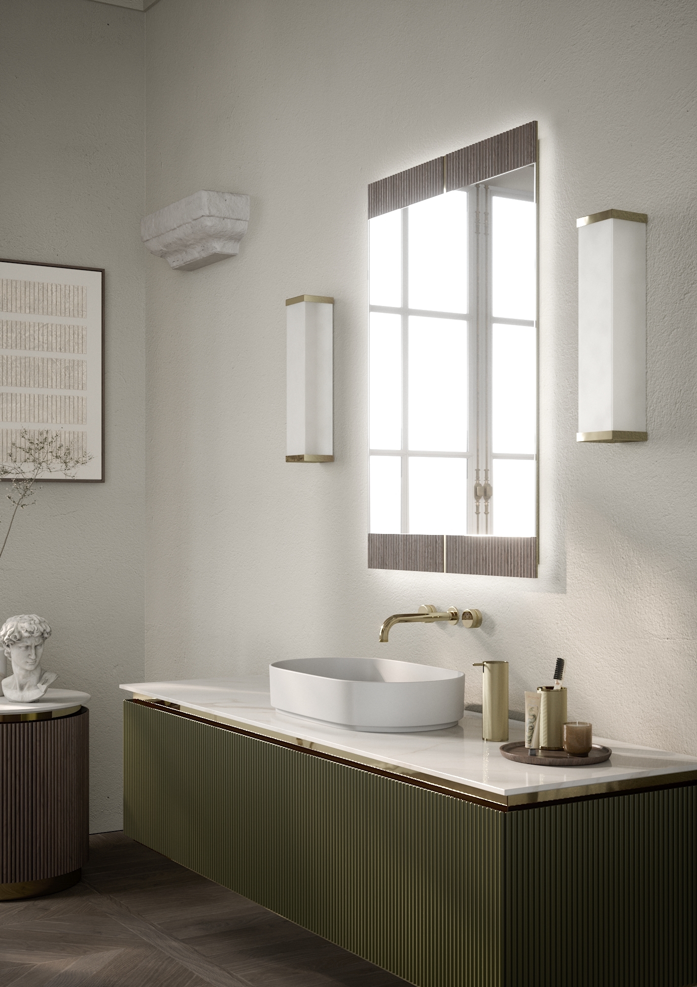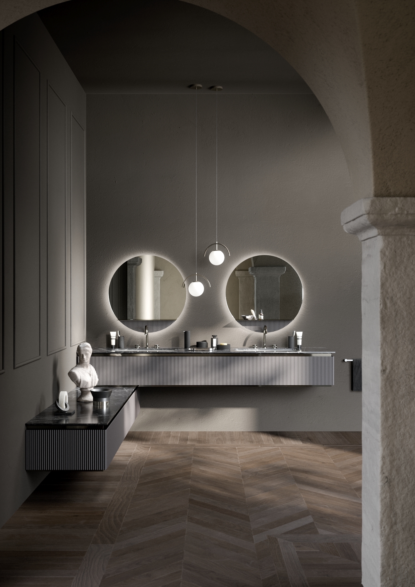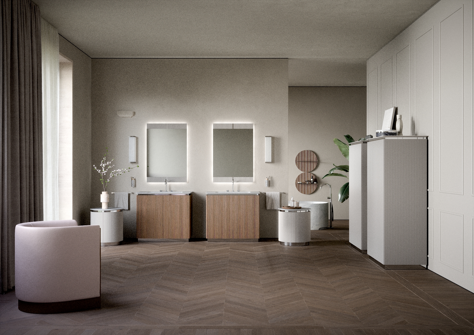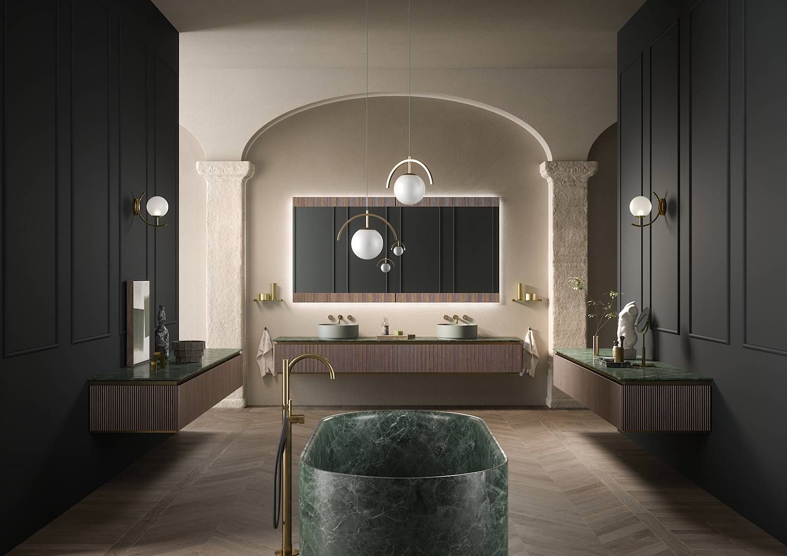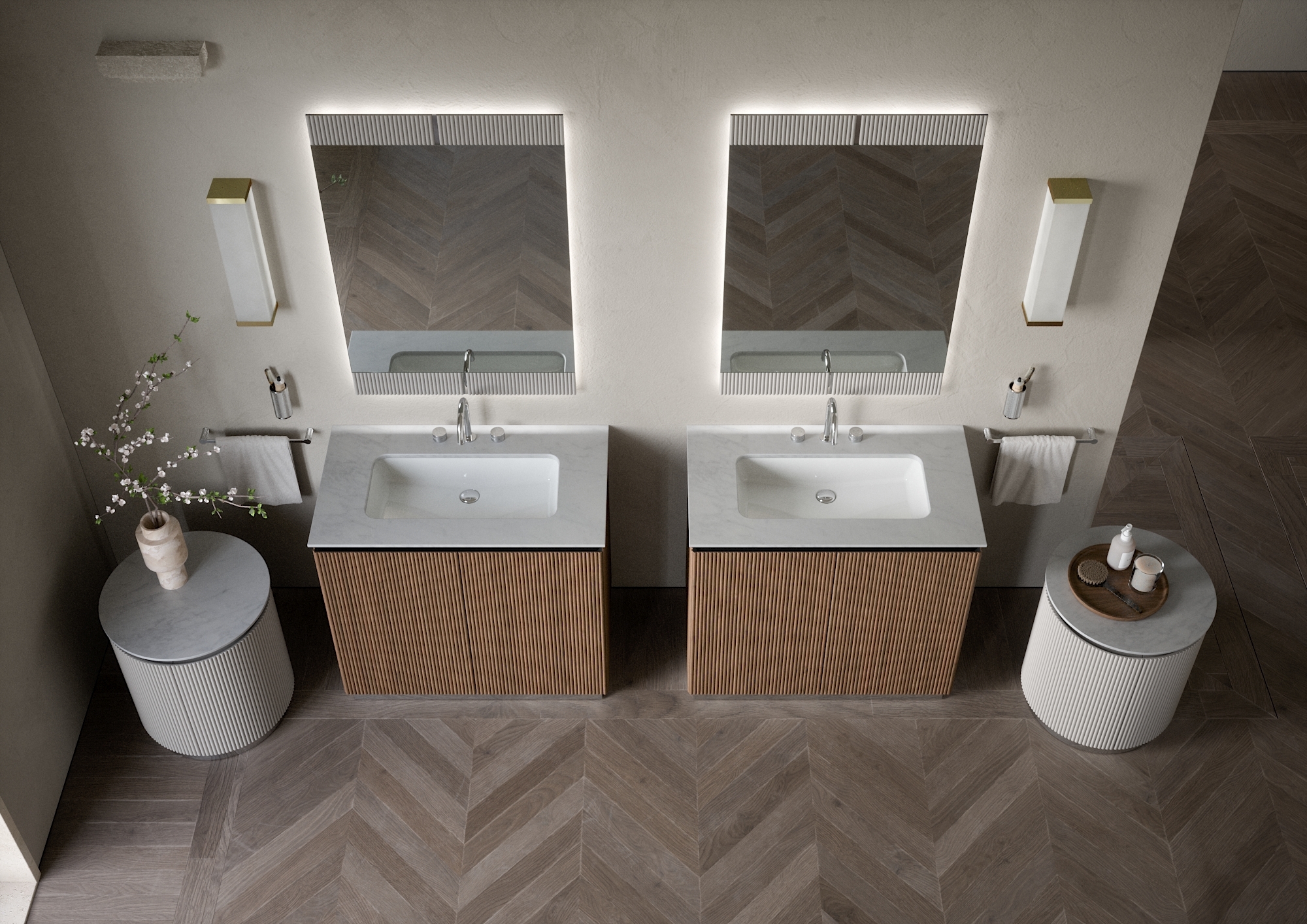 Мебель для ванной комнаты Naos сочетает утонченную эстетику и практичность. Ее мягкие, изогнутые формы создают ощущение уюта, а отделка из натурального ореха добавляет тепла и естественности. Роскошные мраморные столешницы придают коллекции эксклюзивность, напоминая об искусстве древних цивилизаций. Каждая деталь выполнена с безупречным мастерством.