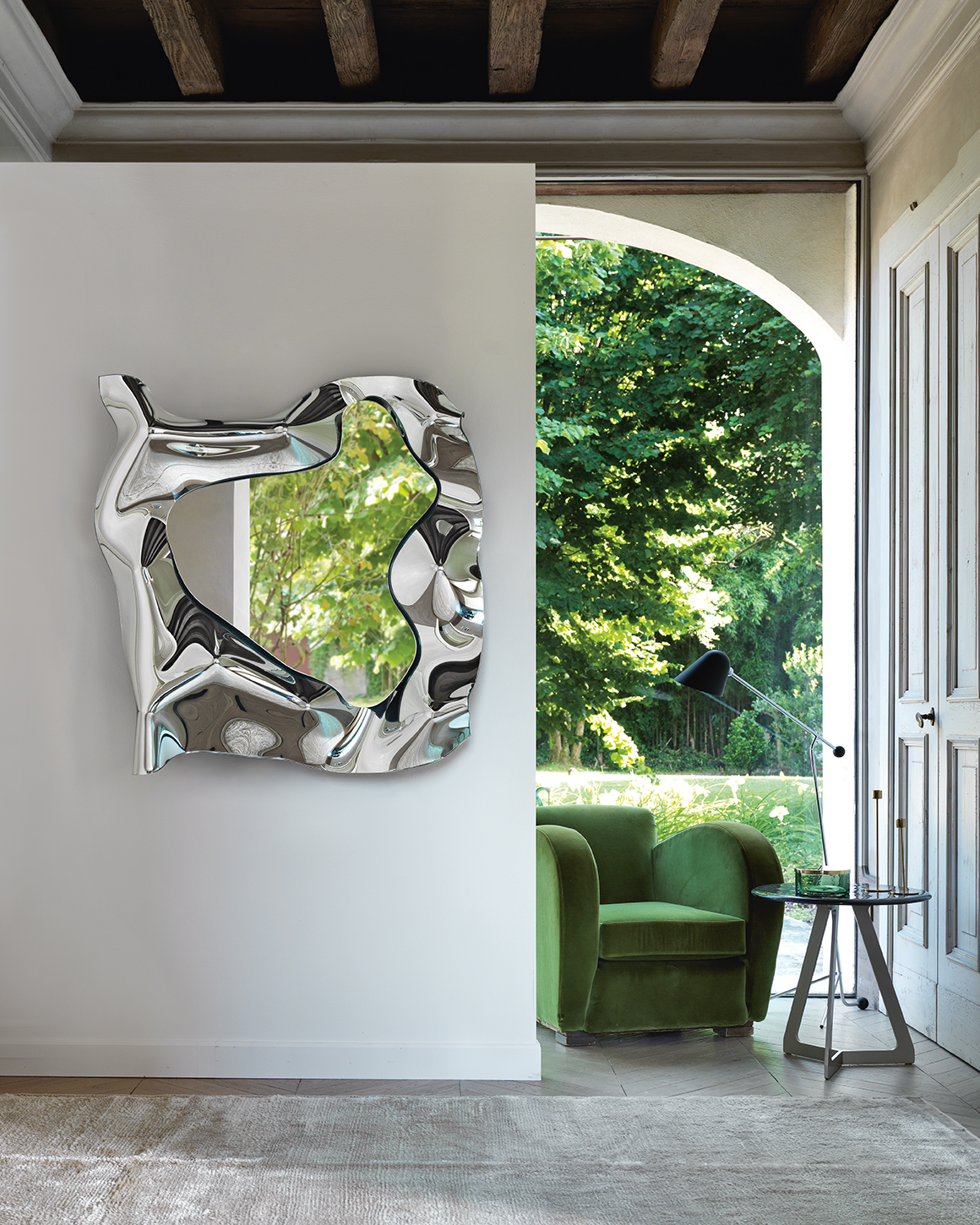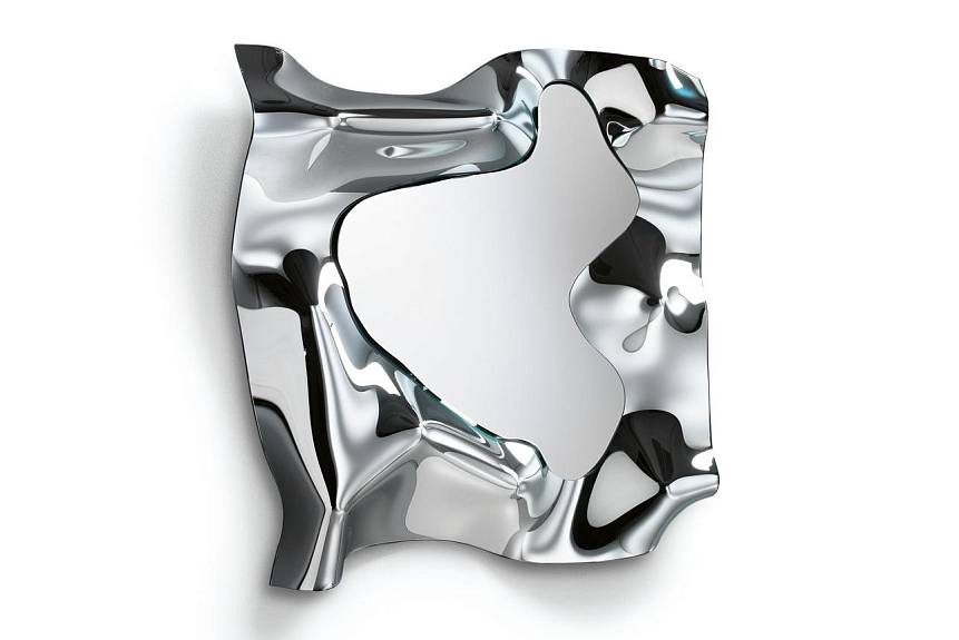 Минималистичный объект с идеальной геометрией. Плавный изгиб цельного стекла (6 мм), выполненный в печи при высоких температурах, создает мягкий объем. Чистое серебряное покрытие и скрытая металлическая рама делают акцент на безупречной форме..