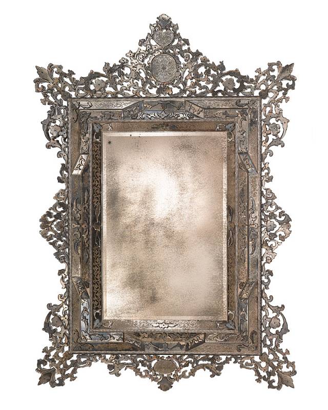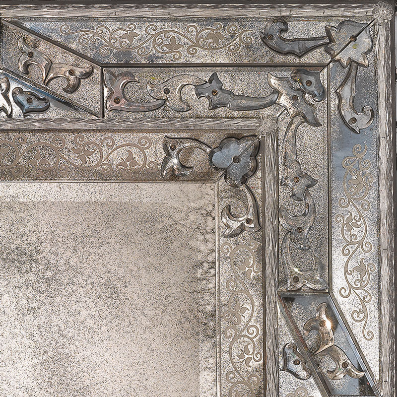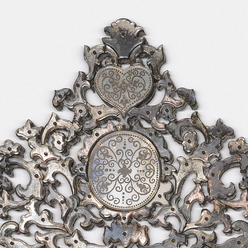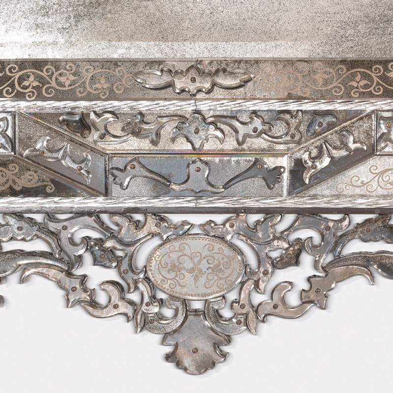 Центральное скошенное стекло с античной зеркальной отделкой.Рамы и герб из стекла с фацетом и гравировкой с антикварным зеркальным покрытием.