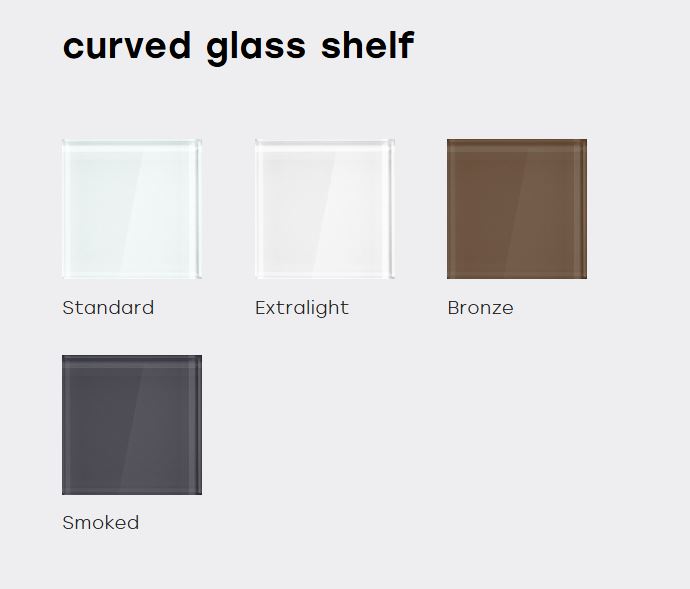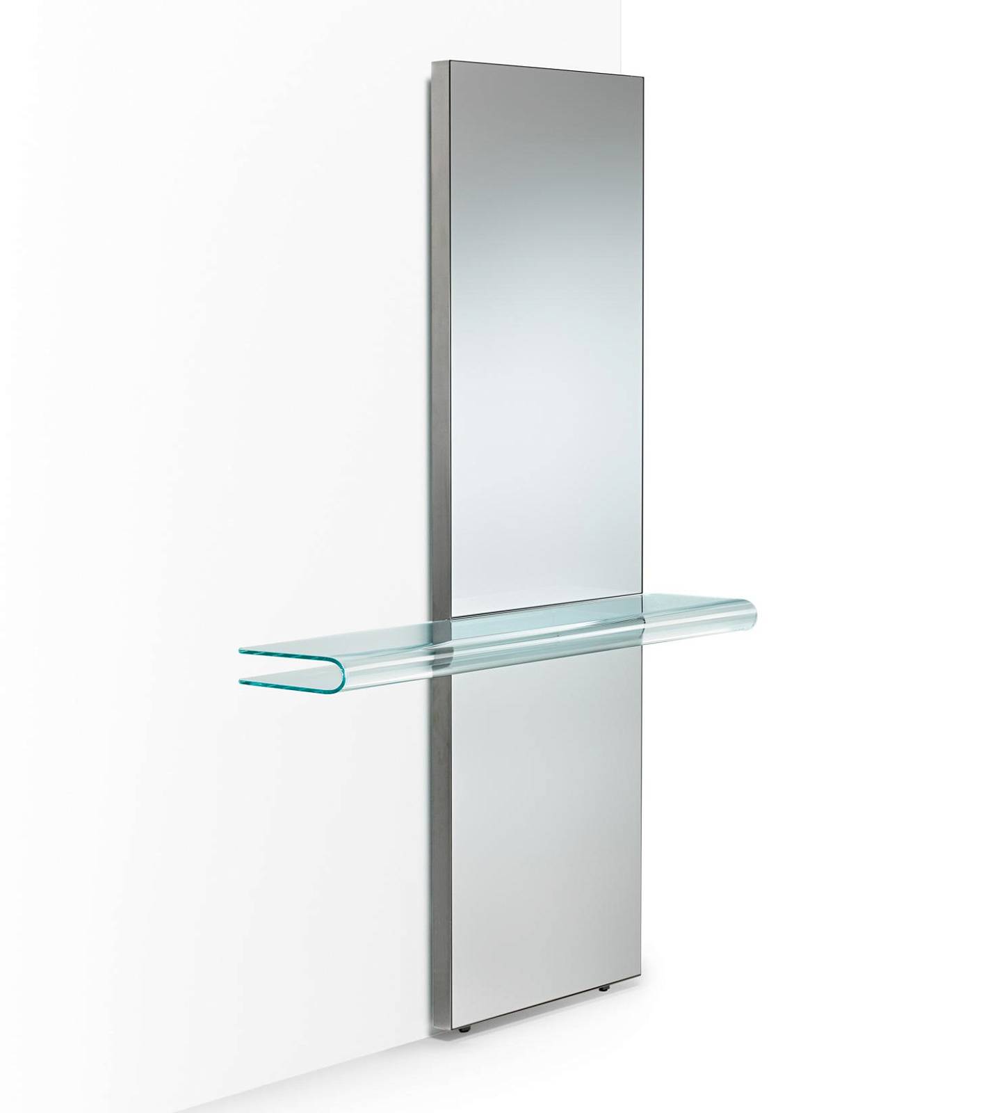 Зеркало в пол дополнено столешницей из гнутого стекла толщиной 8 мм. Консоль можно смонтировать как с полкой слева, так и справа. Прочный каркас из глянцевой нержавеющей стали завершает современный образ.
