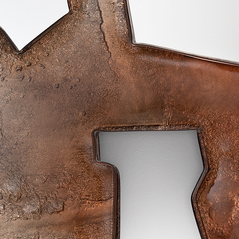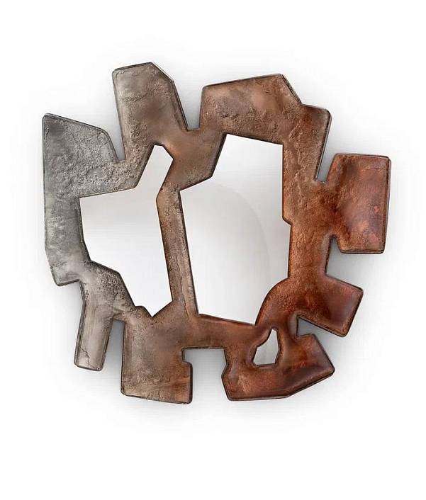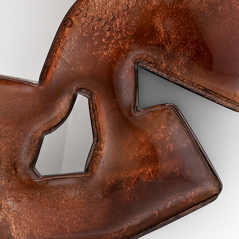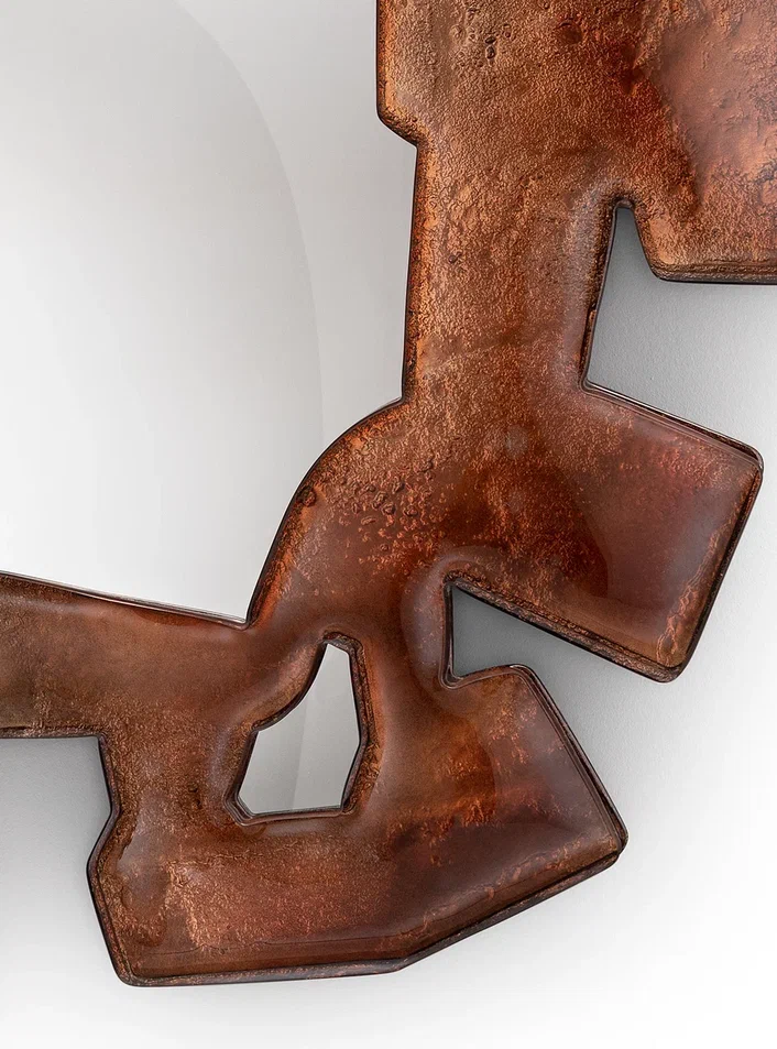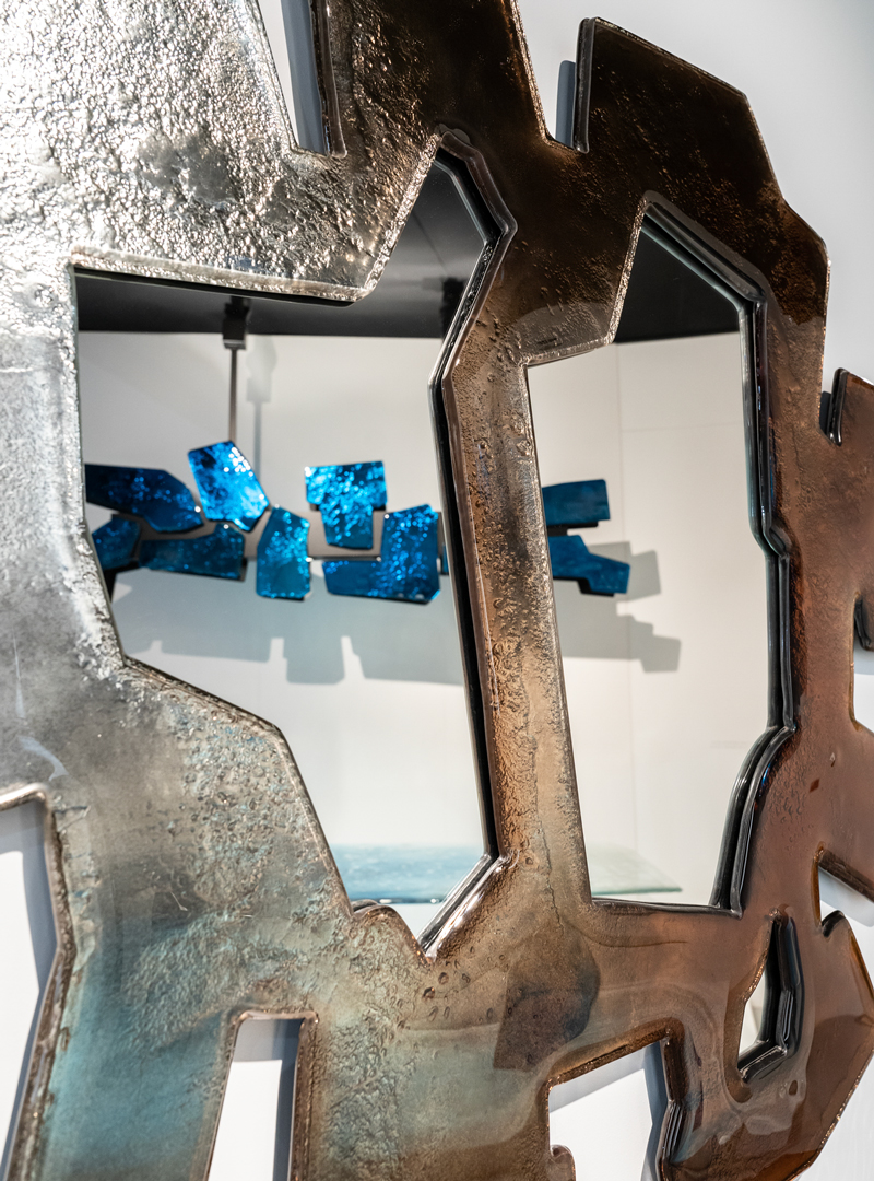 Цветное зеркало индивидуального дизайна. Рама выполнена по уникальной технологии из двух слоев стекла, запеченных вместе, покрыта лаком градации от бронзового до прозрачного. Все изделие посеребрено (среднее старение). Центральная часть - обычное зеркало (без старения). Деревянное основание, покрытое черным лаком.