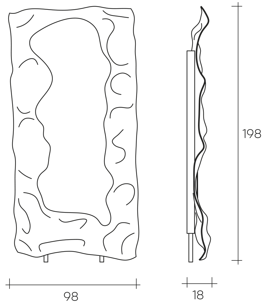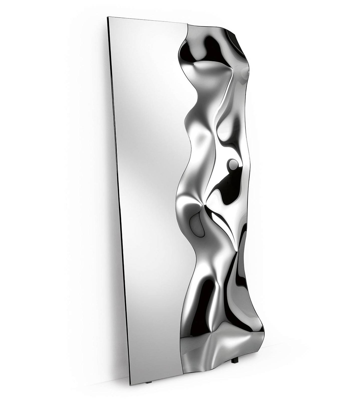 Минималистичный объект с идеальной геометрией. Плавный изгиб цельного стекла (6 мм), выполненный в печи при высоких температурах, создает мягкий объем. Чистое серебряное покрытие и скрытая металлическая рама делают акцент на безупречной форме..