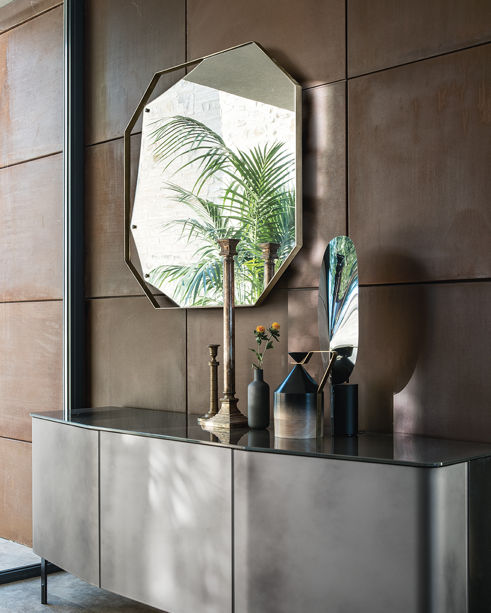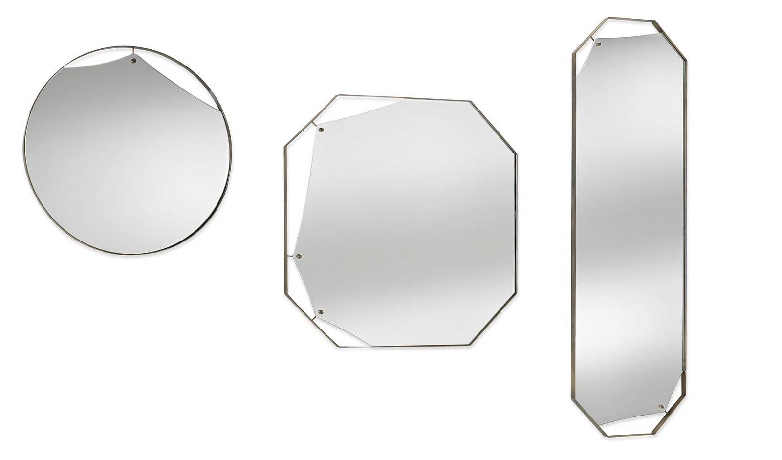 Коллекция зеркал, объединяющая напольные и настенные модели. Тонкая металлическая рама с благородной отделкой под полированную латунь обрамляет плоское зеркальное полотно толщиной 5 мм. Теплый блеск металла придает зеркалам сдержанную роскошь.