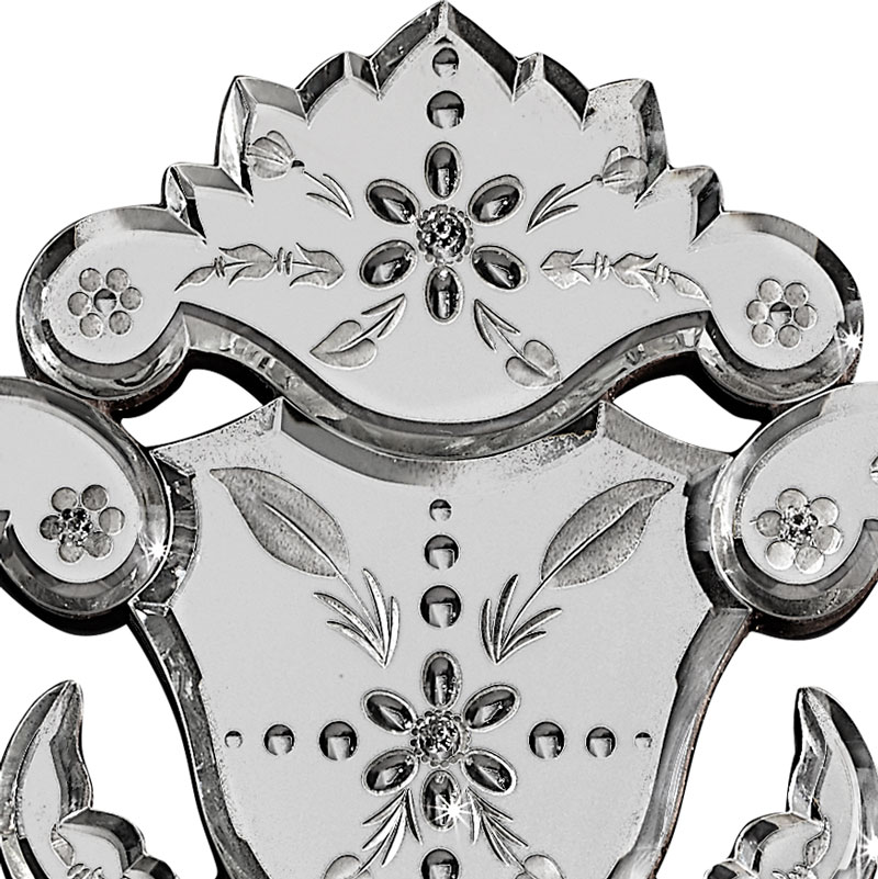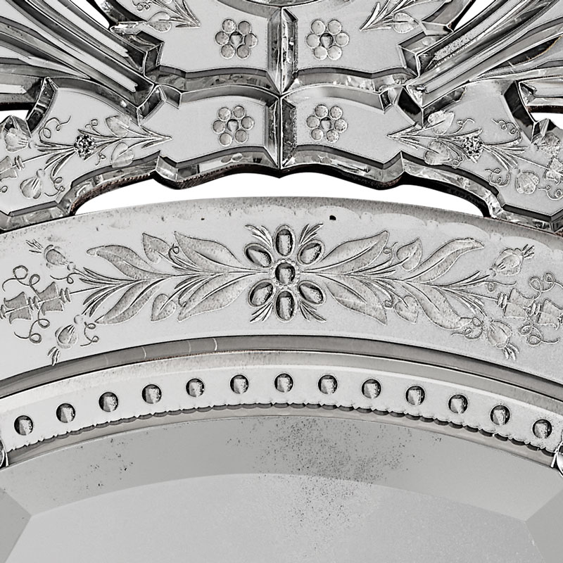 Центральная часть из фацетированного стекла с зеркальным покрытием под старину.Рамы с гравюрами и гербом из скошенного и гравированного стекла с отделкой под старину.
