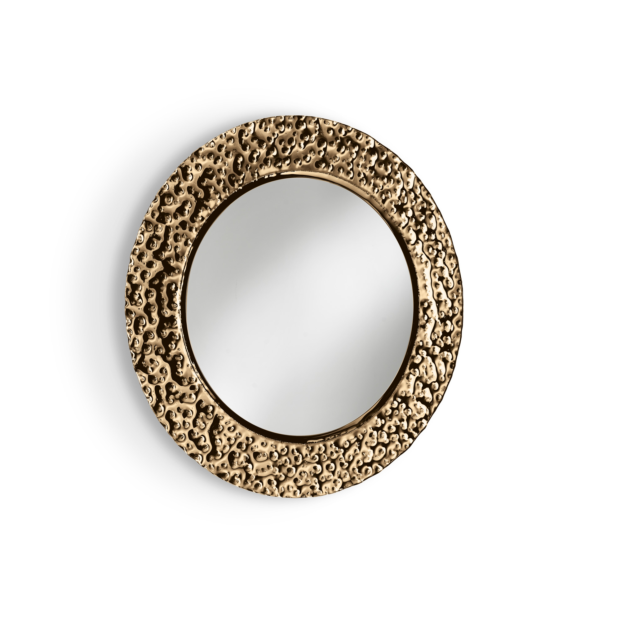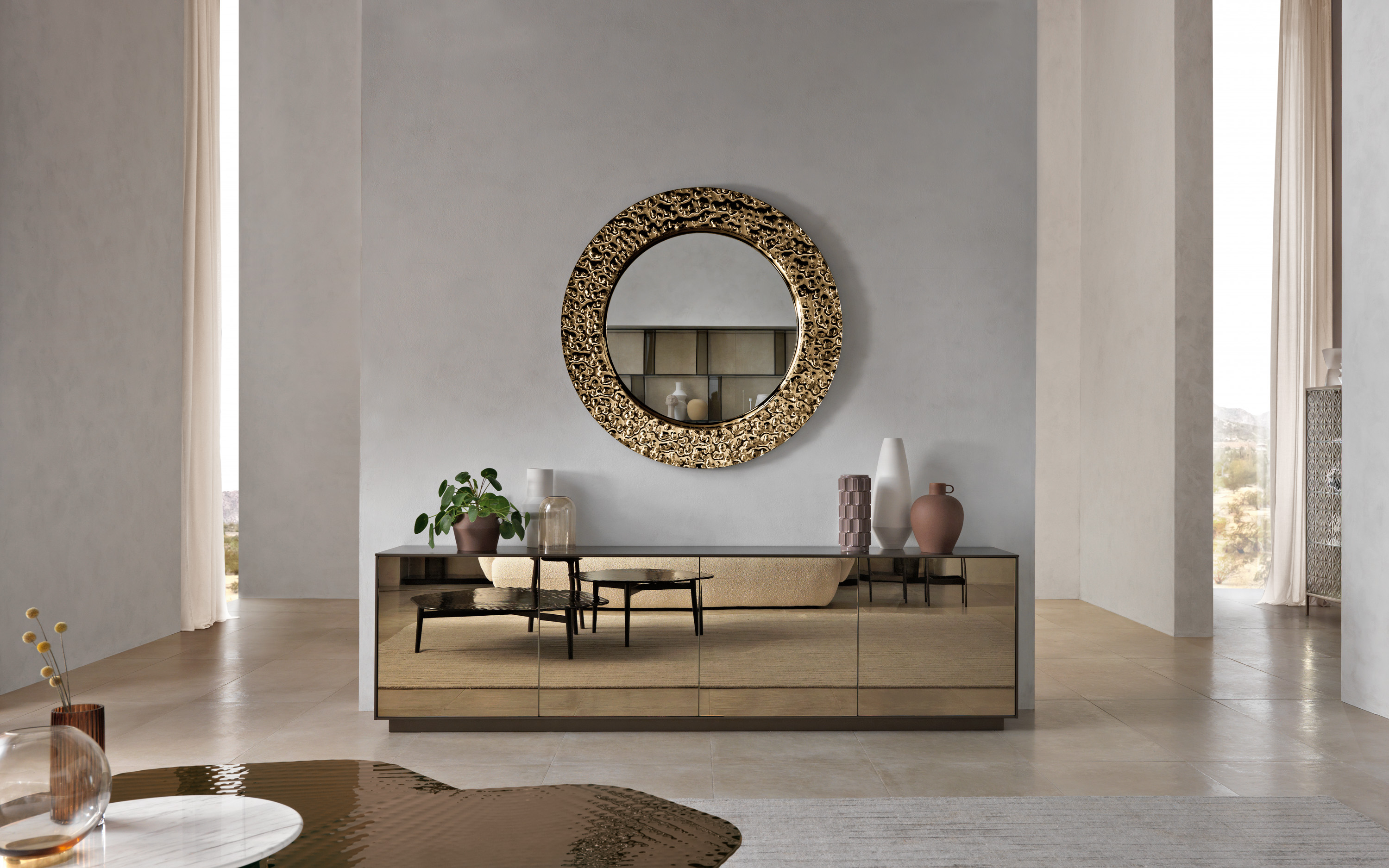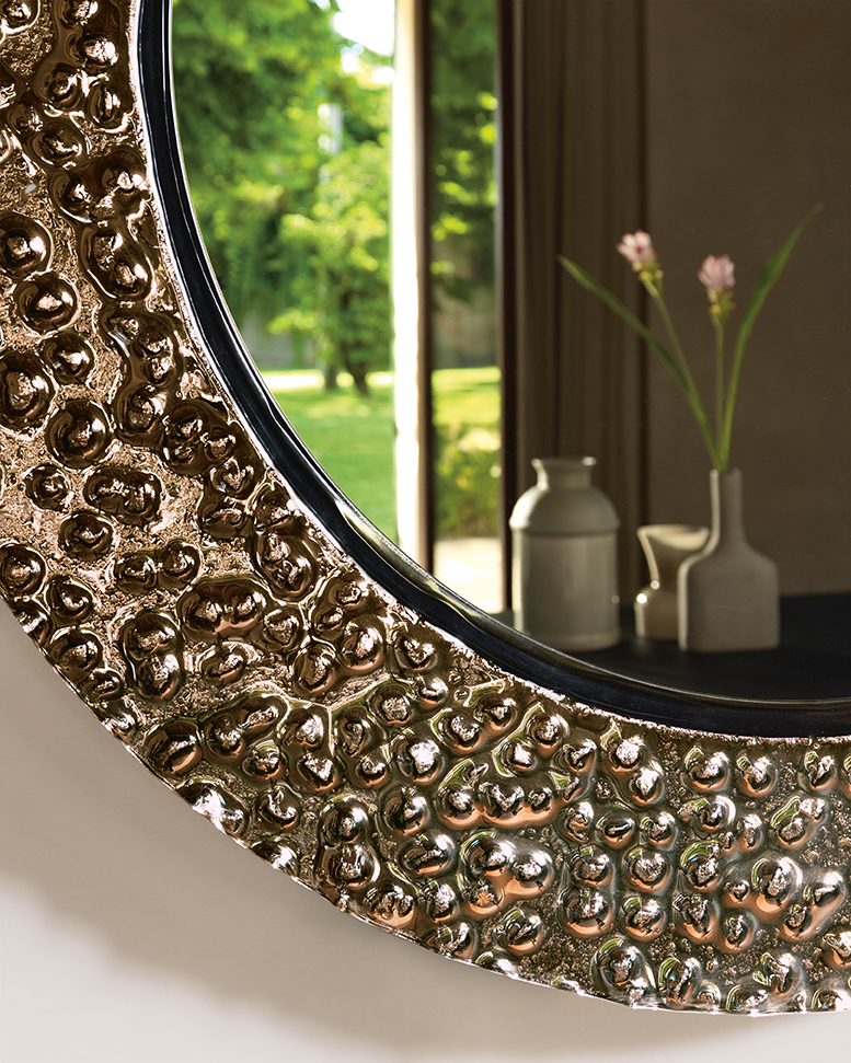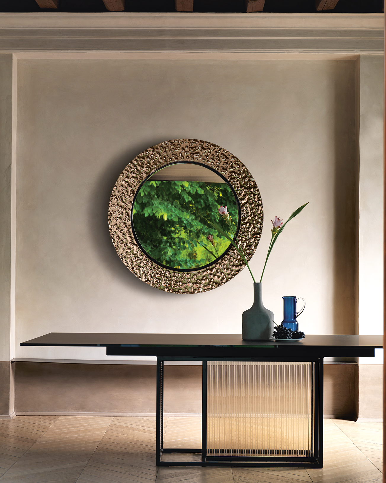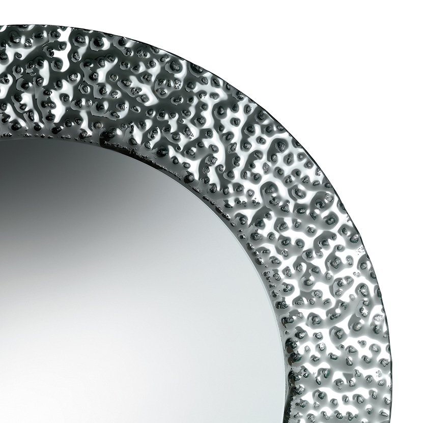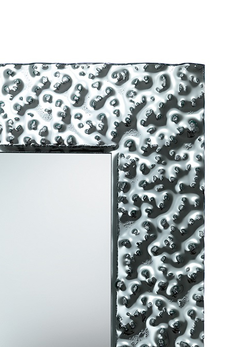В основе коллекции — инновационная технология фабрики Fiam: гнутое стекло толщиной 8 мм, созданное методом высокотемпературного спекания, с зеркальным напылением на обратную сторону. Это гарантирует прочность и чистоту отражения. В результате рождается уникальная рама с объемным узором, которая обрамляет зеркальное полотно (5 мм). Универсальная система крепления позволяет вешать зеркала как горизонтально, так и вертикально.