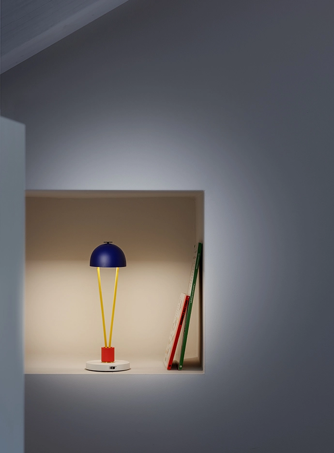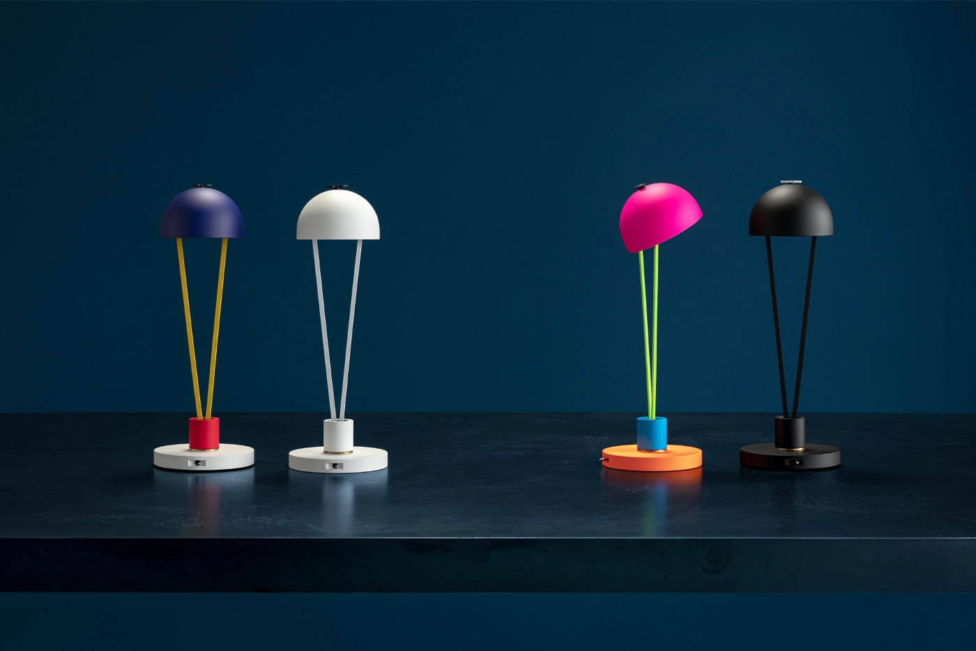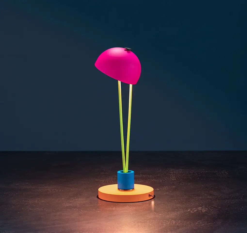 белое основание с красным цилиндром / желтые трубки / синий куполовидный абажур / черная «мушка» ярко-оранжевое основание с ярко-голубым цилиндром / ярко-желтые трубки / ярко-пурпурный куполовидный абажур / черная «мушка» черные основание, цилиндр, трубки и куполовидный абажур / белая «мушка» белые основание, цилиндр, трубки и куполовидный абажур / черная «мушка»