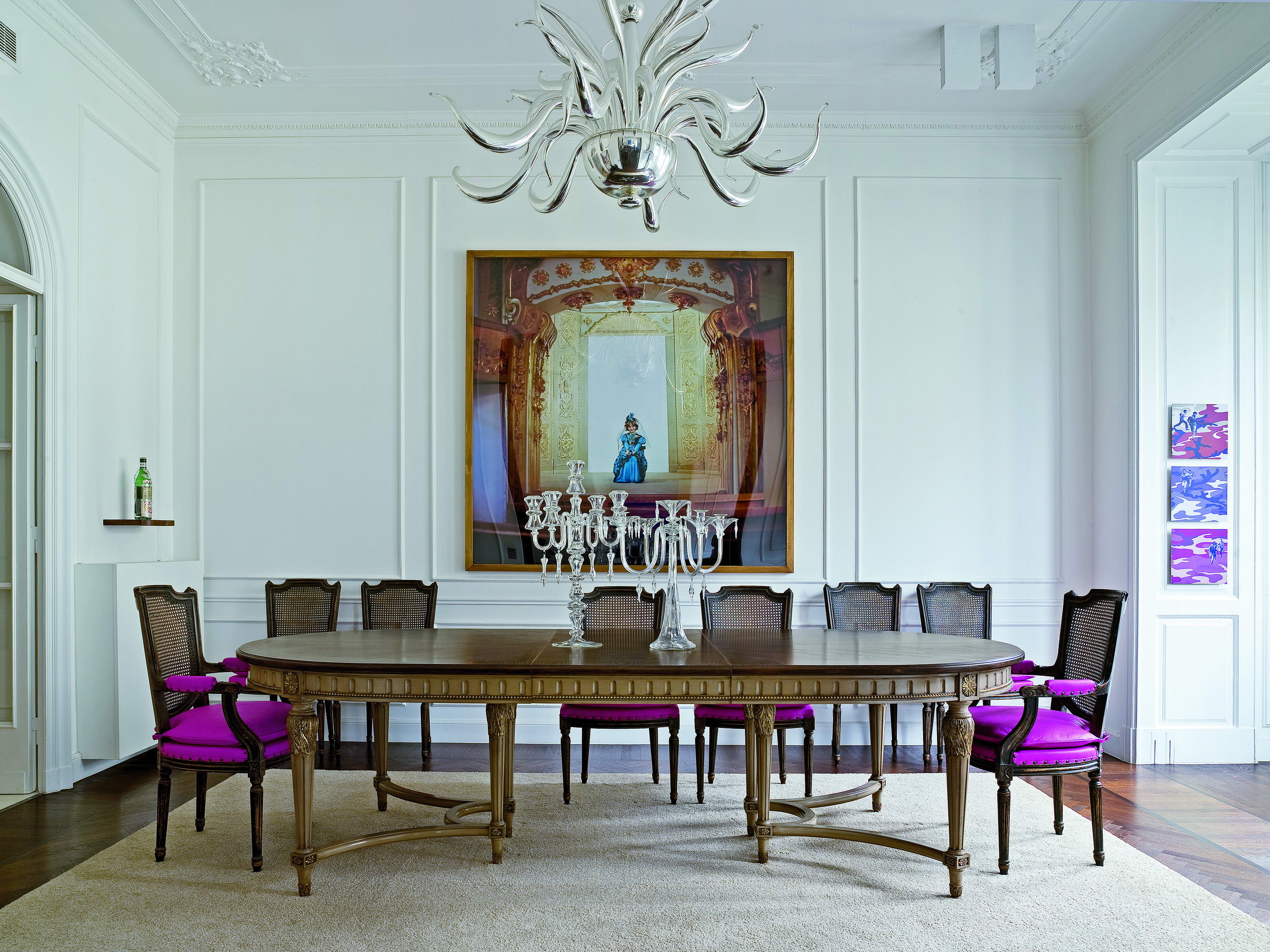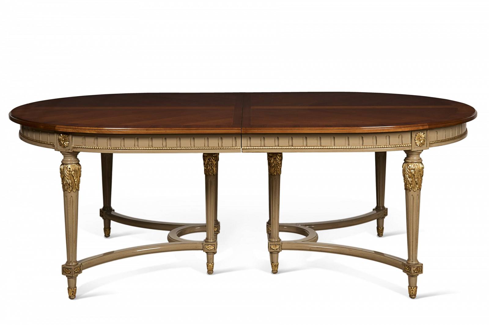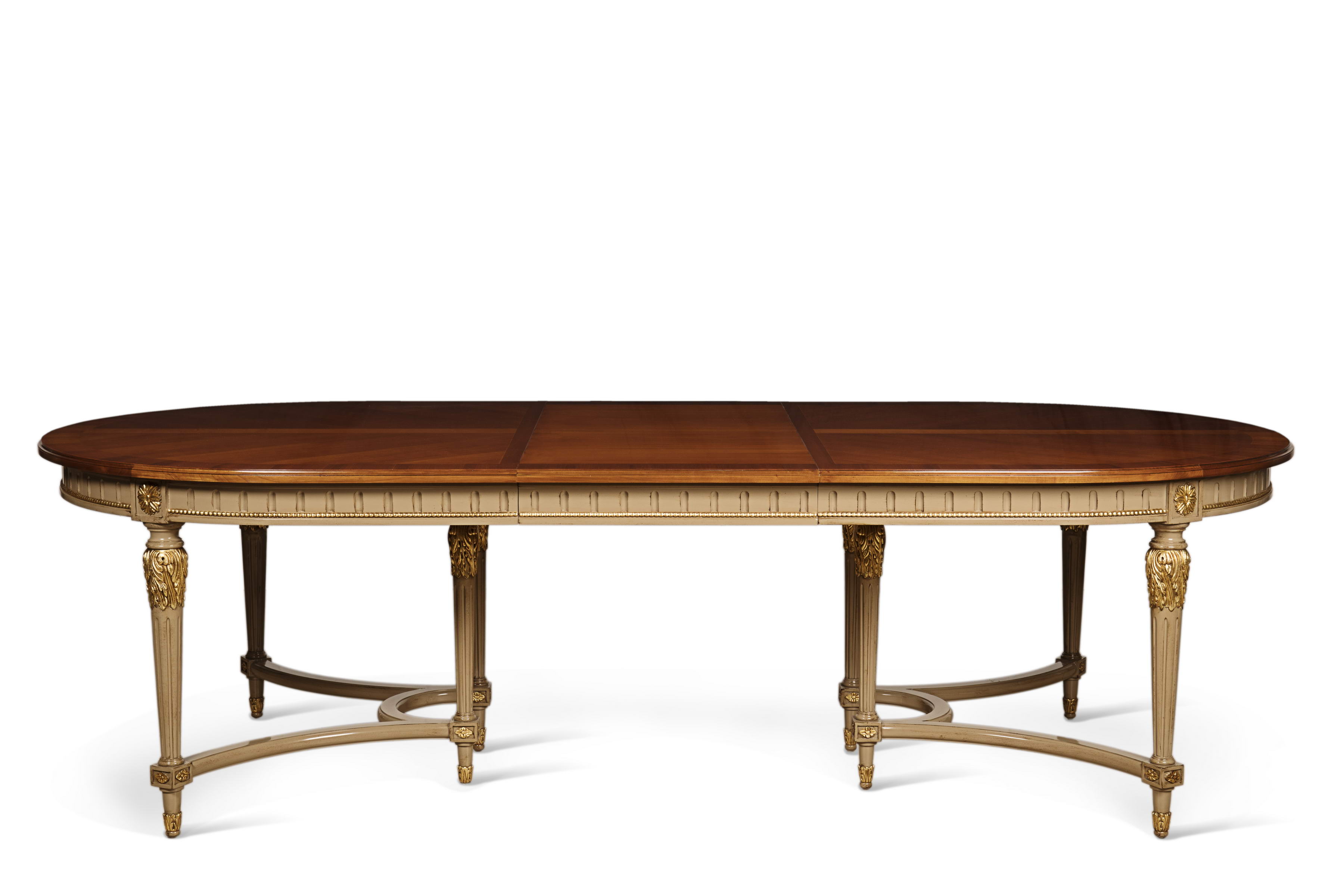 Стол Людовика XVI на 8 ножках, соединенных крестом. 2 центральных удлинителя с балкой см. 60 каждый. Доступен со столешницей из дуба/вишни.ОТДЕЛКА base GL NOCCIOLA antiqued with golden carvings (C*), столешница cherry wood top K1(W)