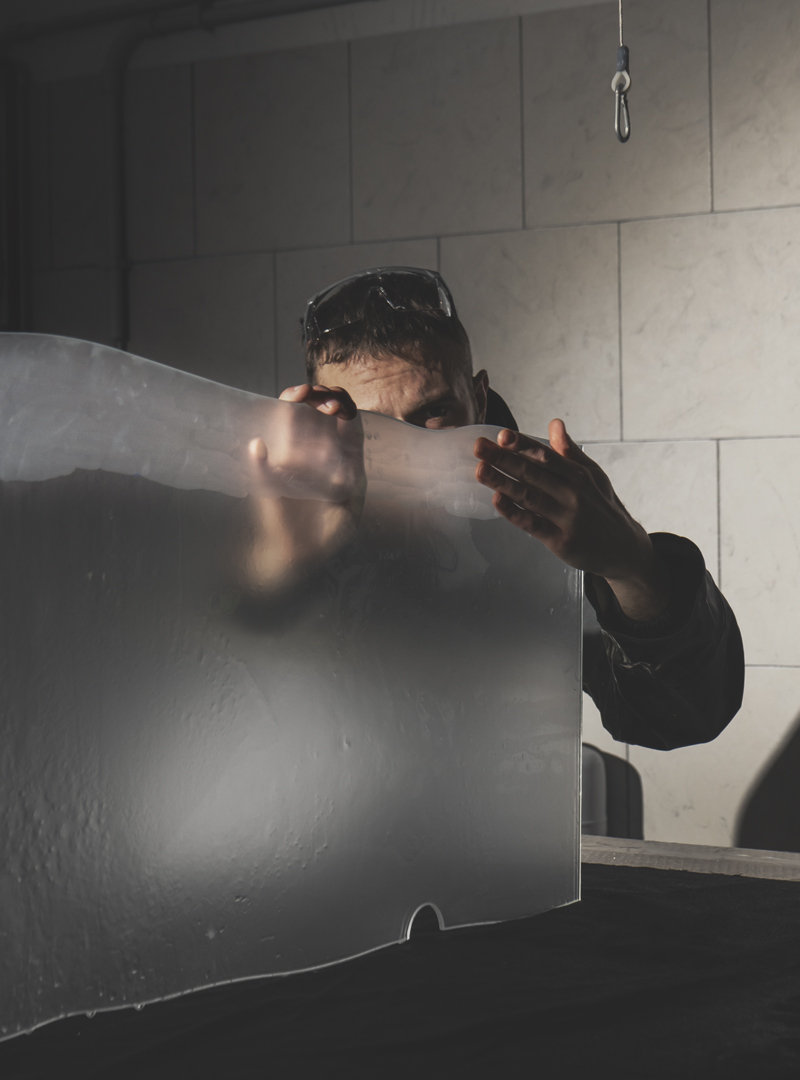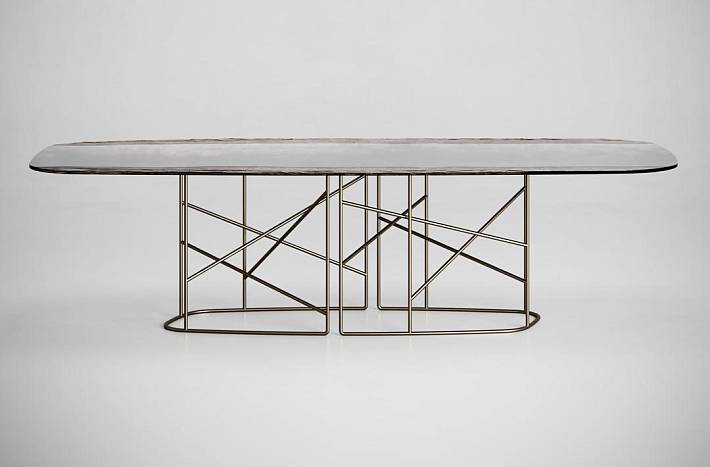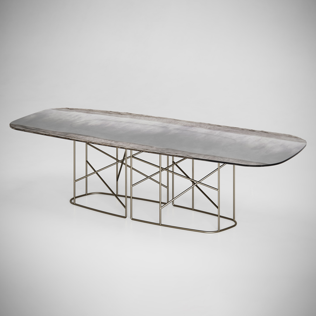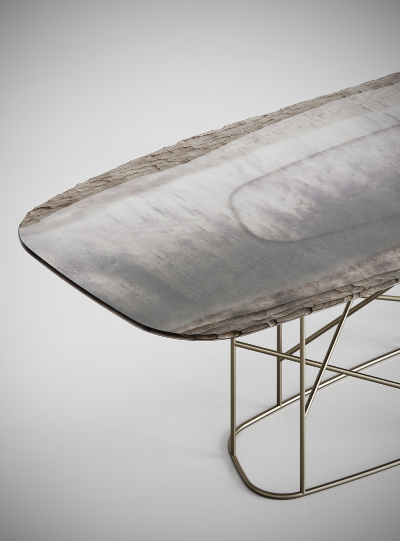 Столешница из стекла толщиной 10 мм украшена декором ручной работы Roddi и Neive, что делает каждый стол уникальным.
