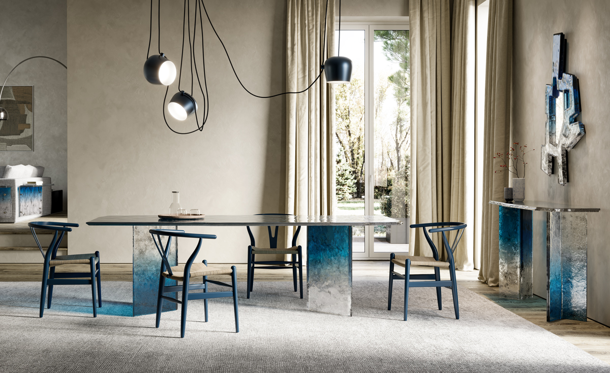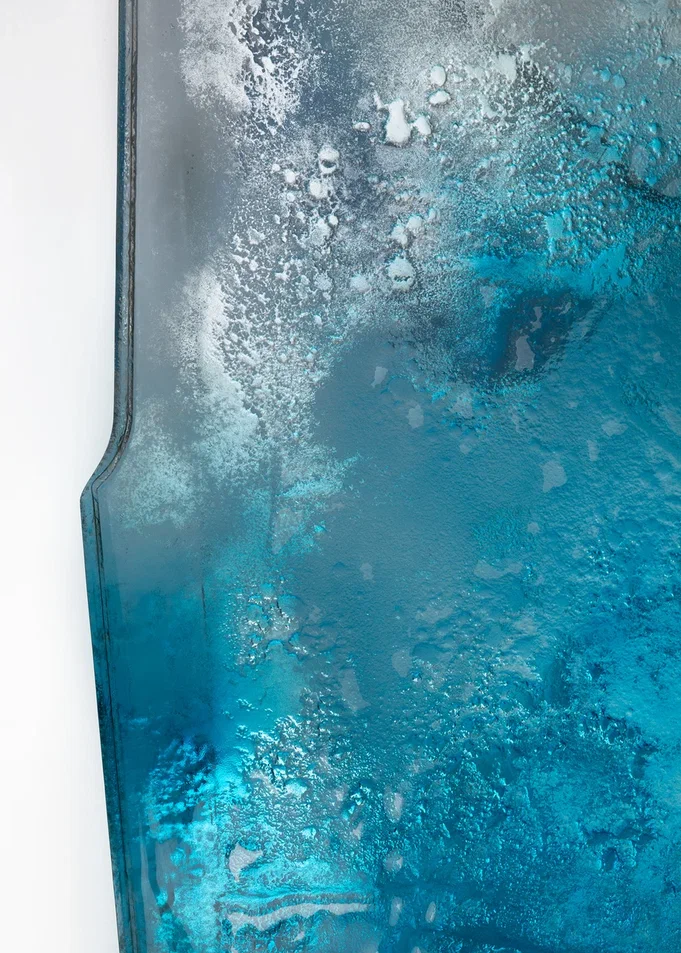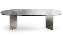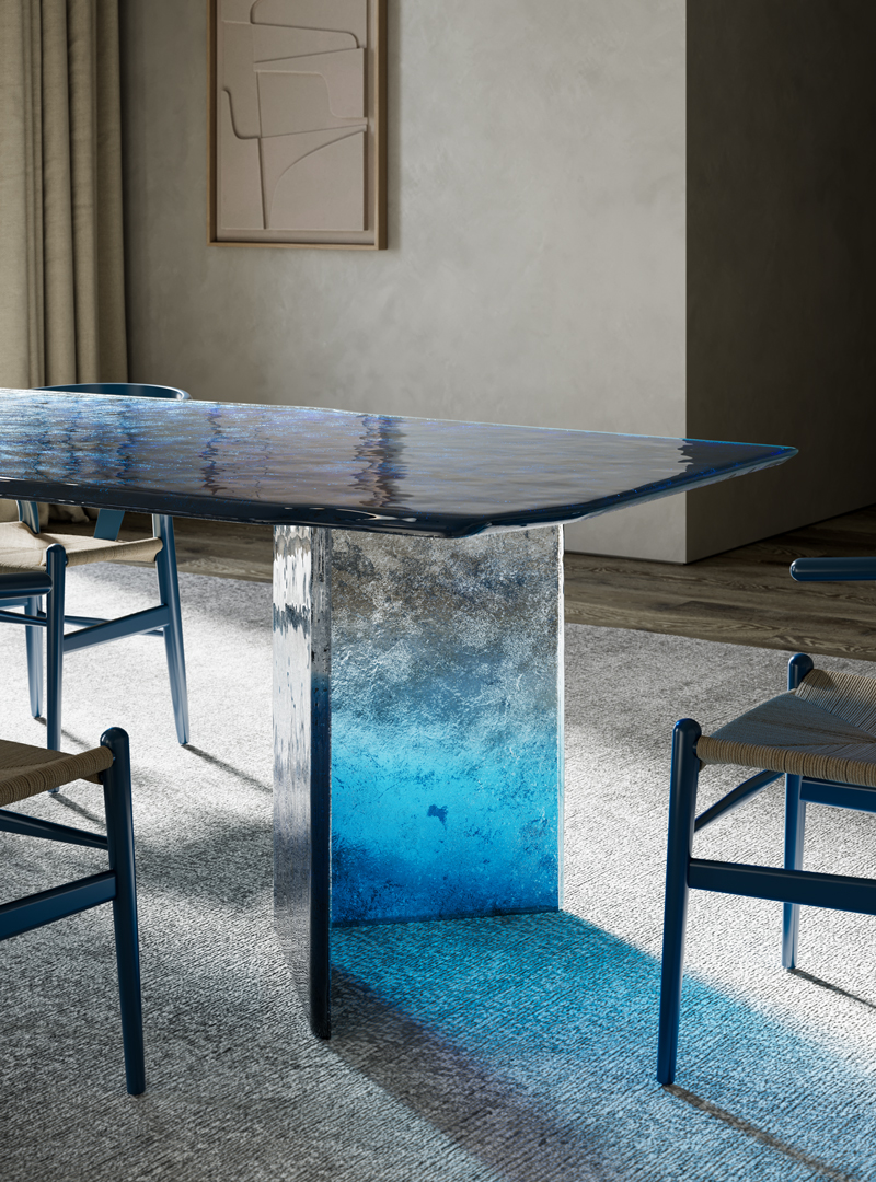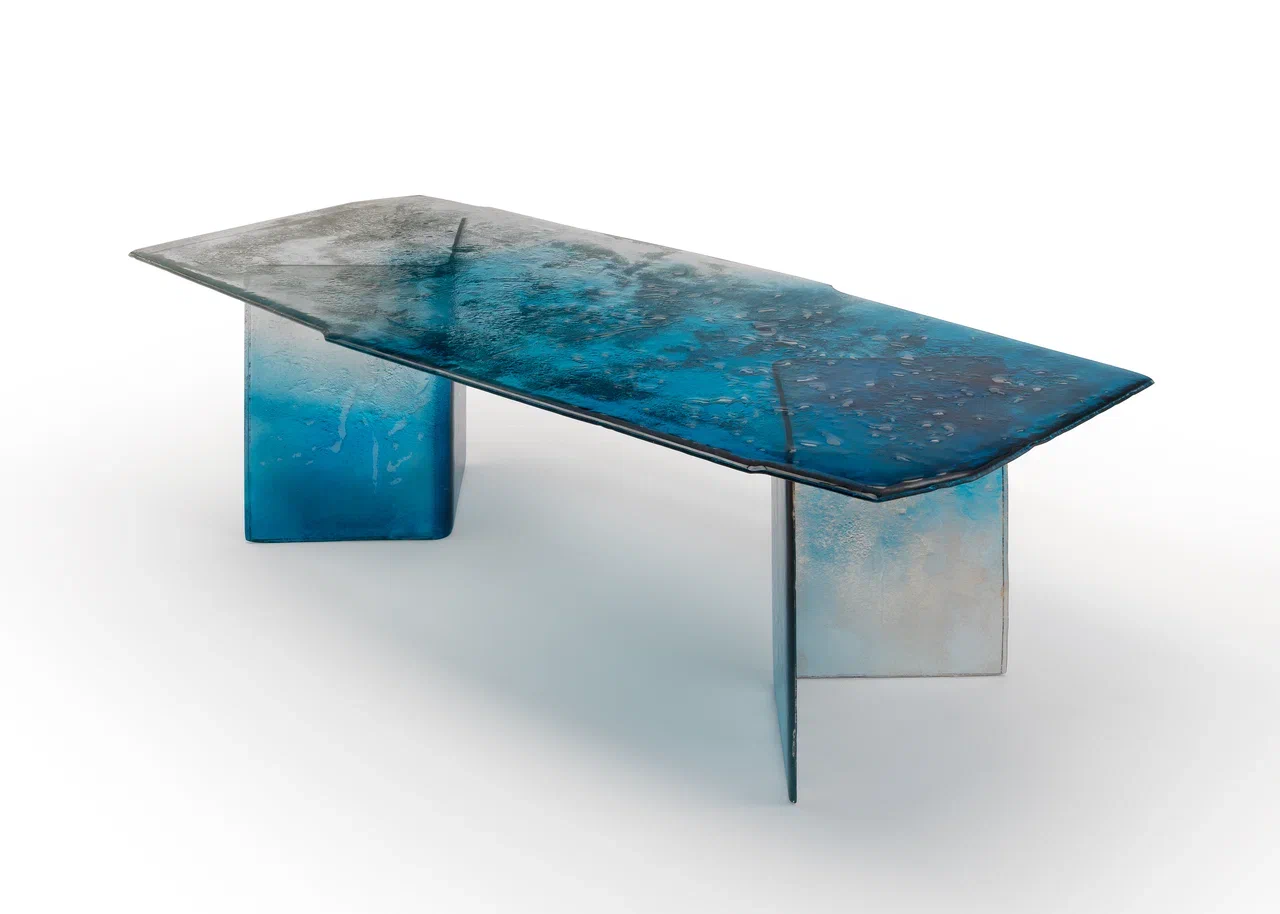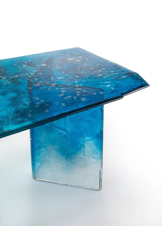 Столешница и ножки выполнены по уникальной технологии из двух слоев стекла, запеченных вместе.Все изделие покрыто лаком градации от синего до прозрачного, с частичным серебрением оборотной стороны.