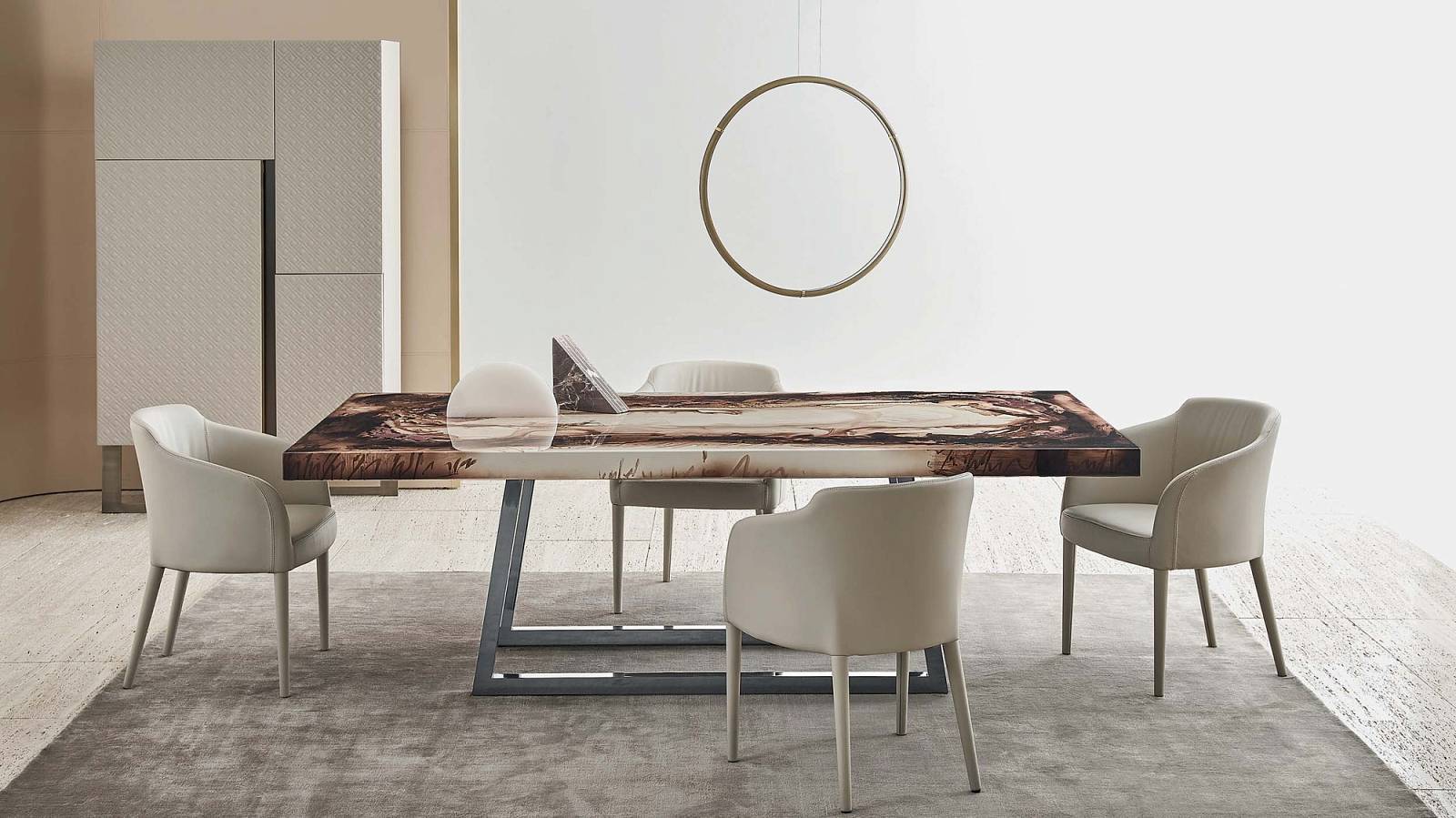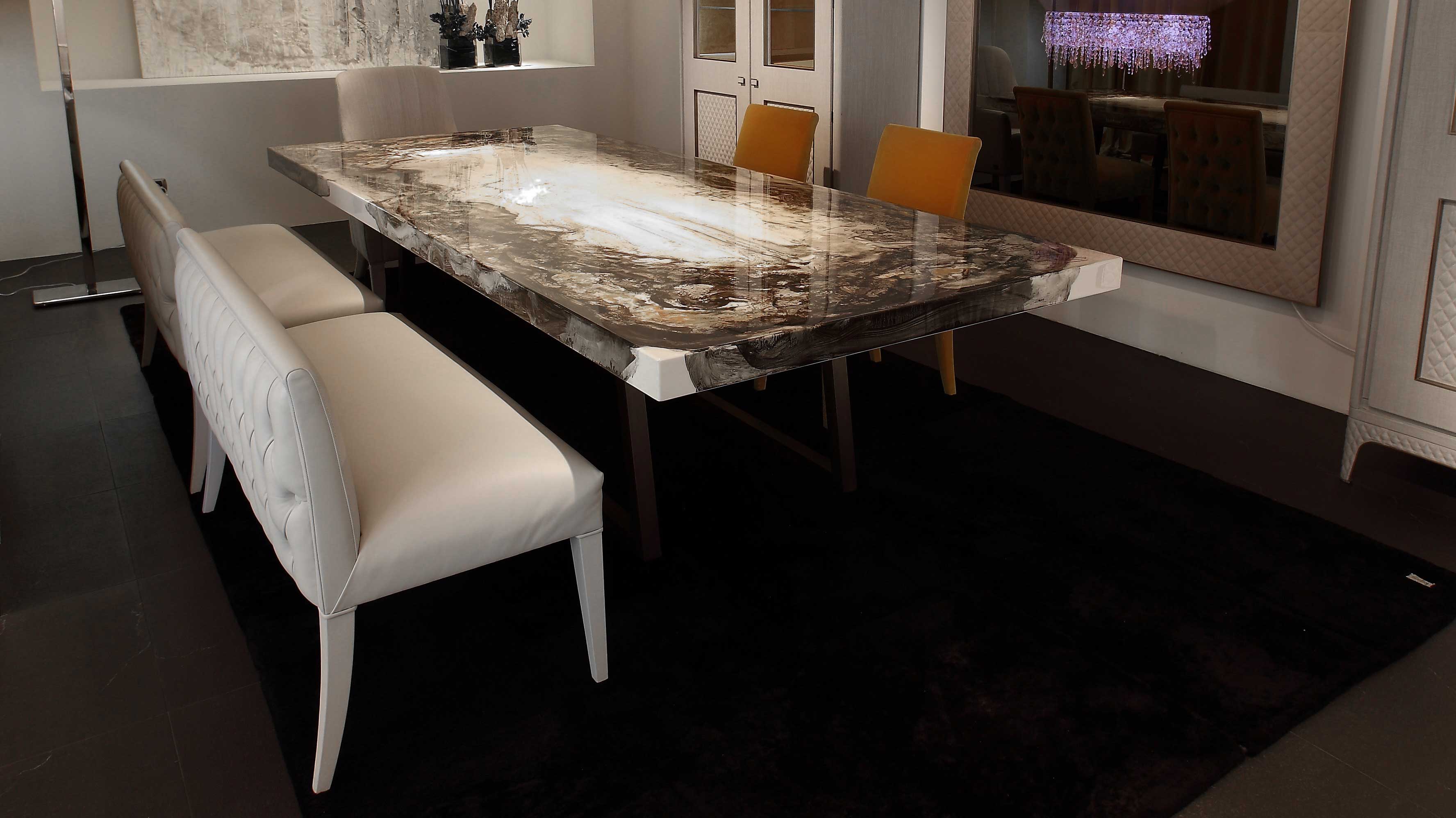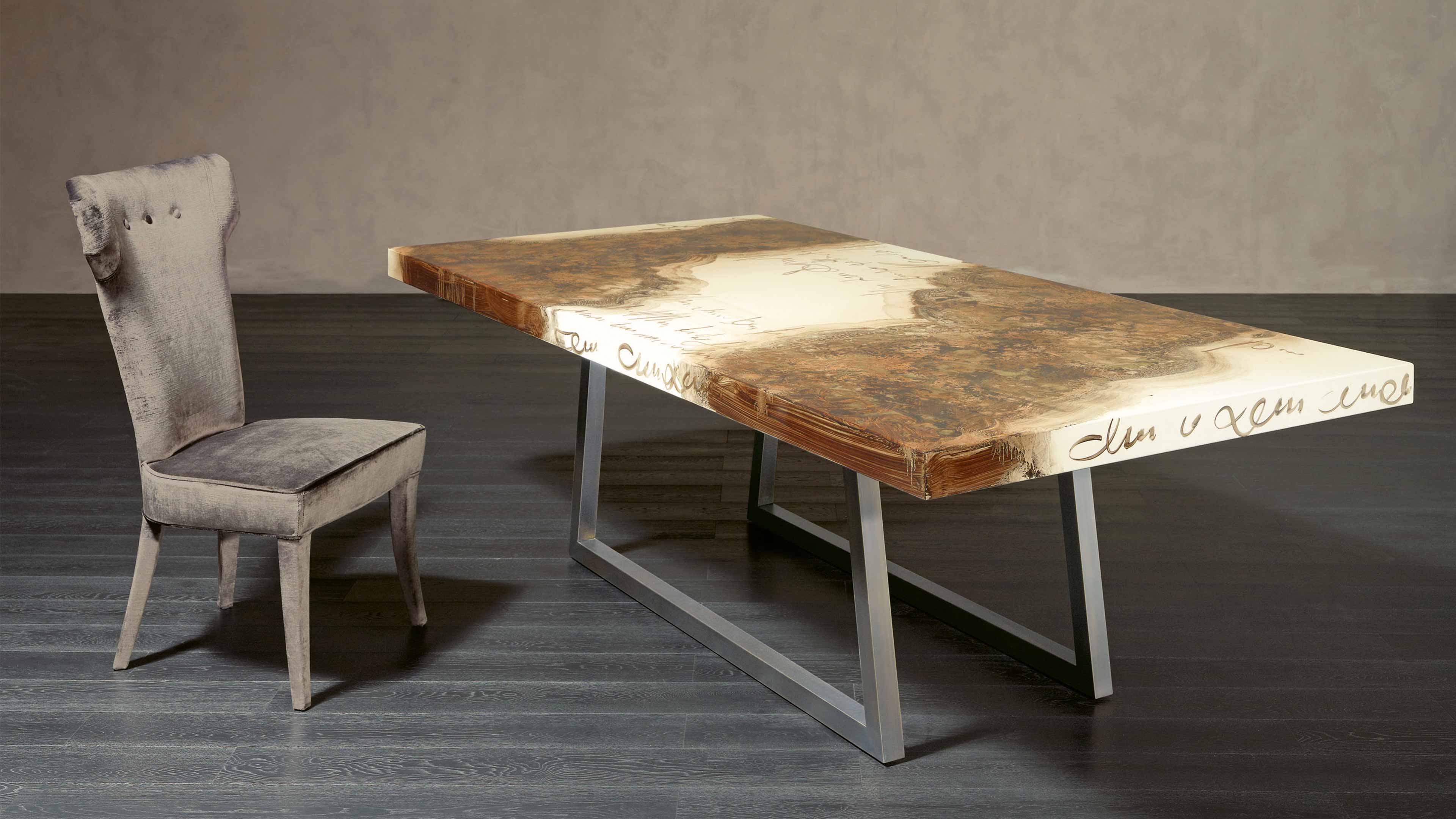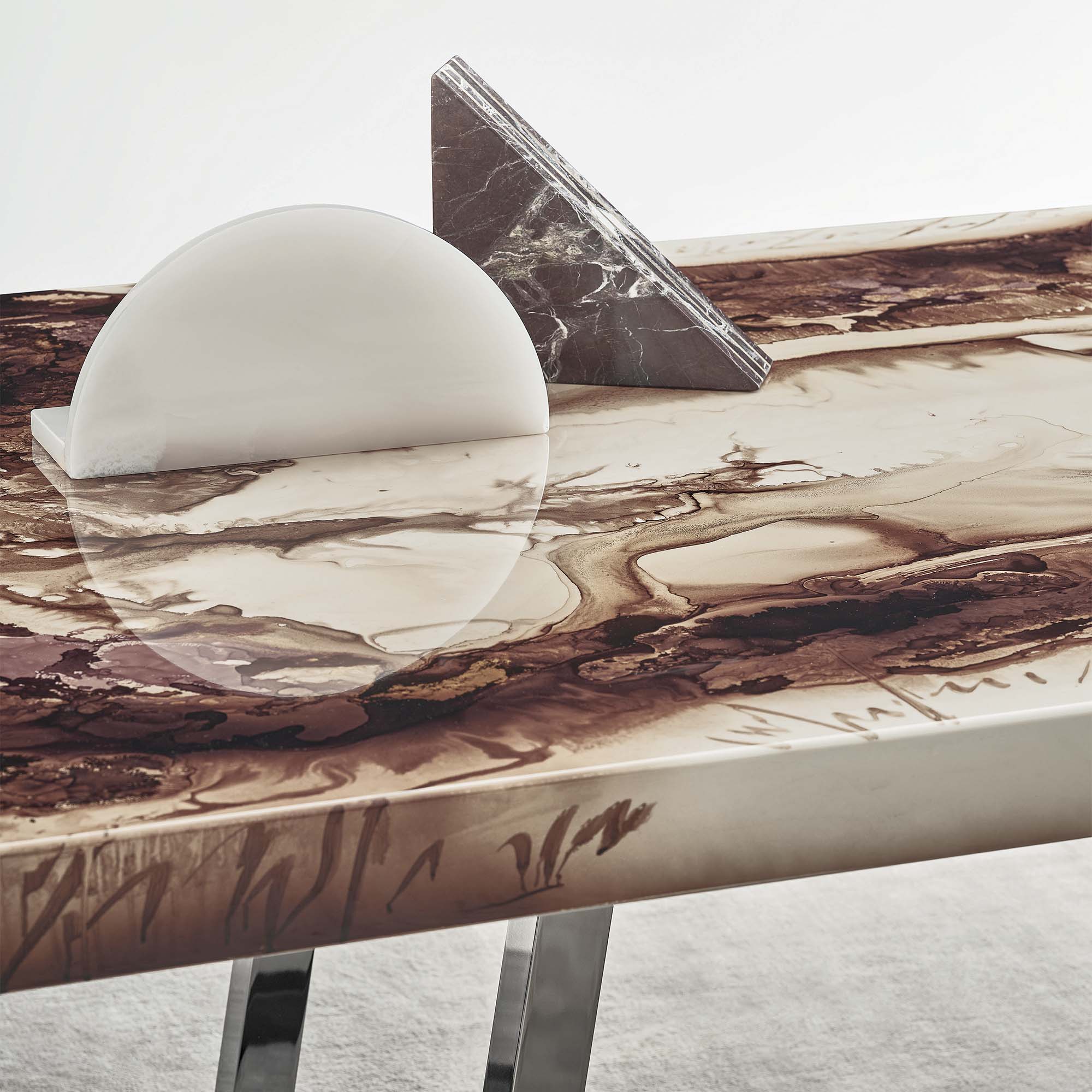 Квадратная или прямоугольная столешница. Металлическое основание в отделке хром, брозовая латунь или золото. Столешница декорирована художественной росписью Decoro вручную, может быть выполнена в коже или окрашена.