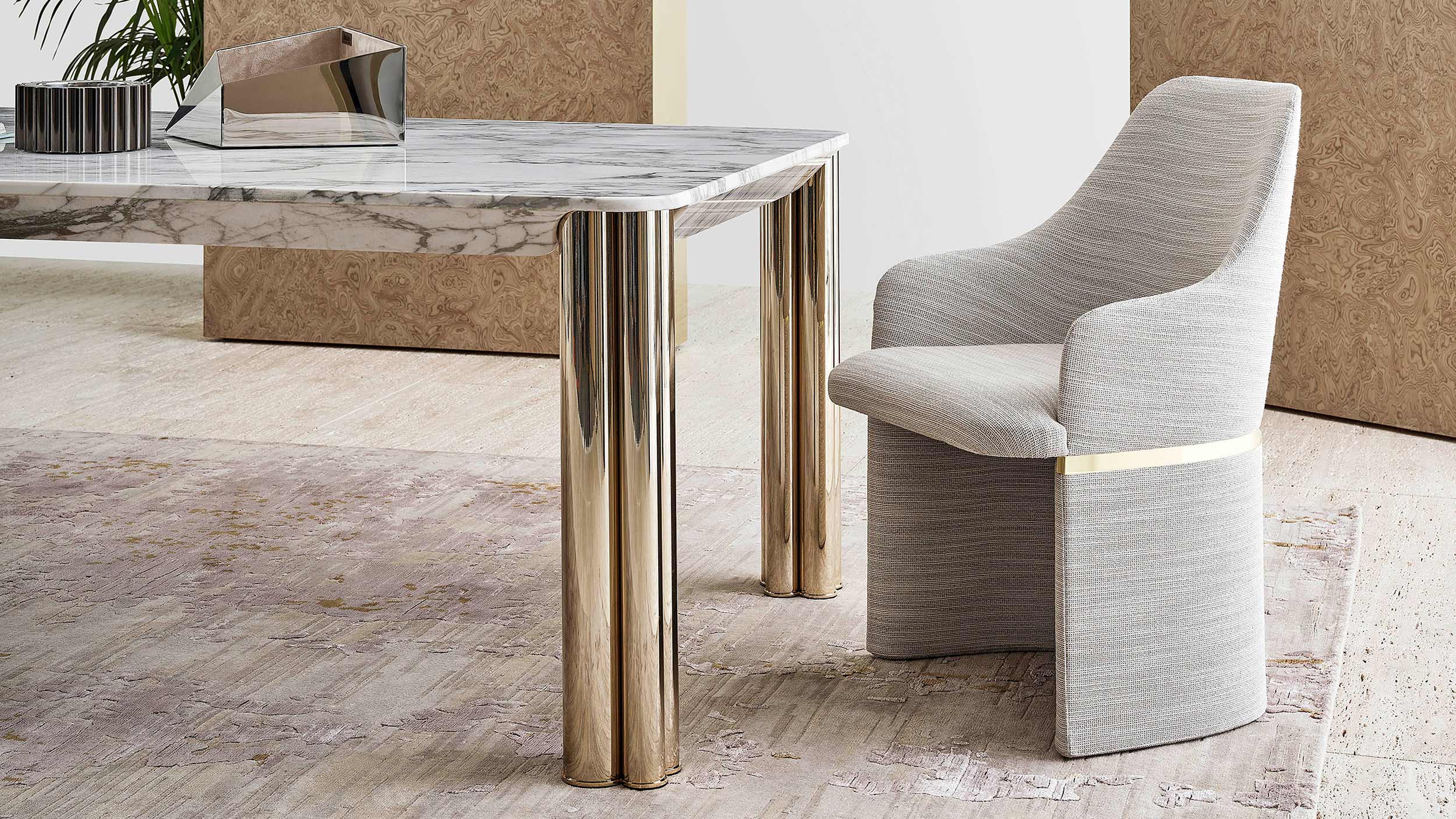 Металлическое основание в отделке черный хром или золото. Столешница декорирована художественной росписью Decoro вручную, может быть отделана кожей, выполнена из дерева Ebony или из мрамора.