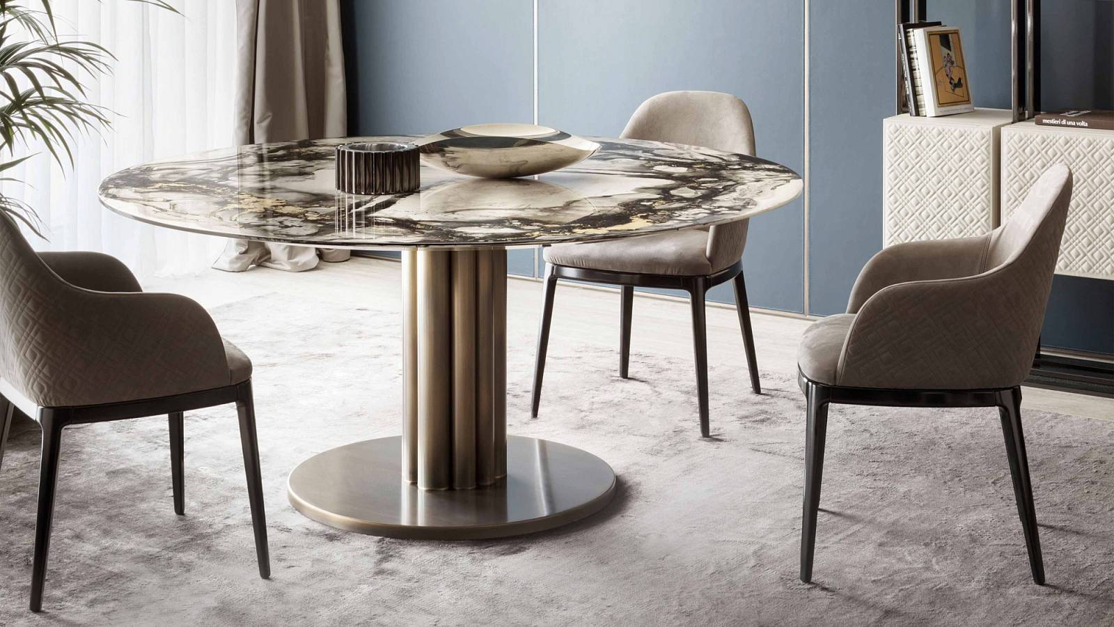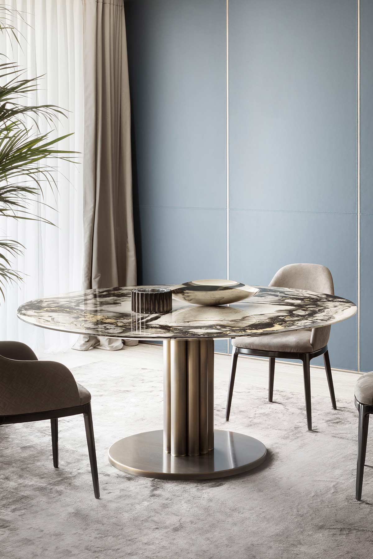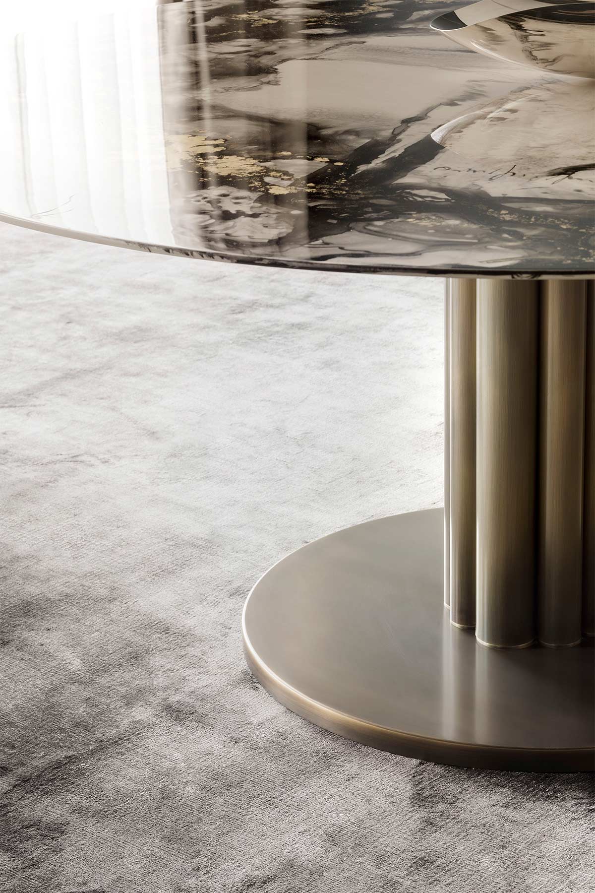 Металлическое основание в отделке черный хром, золото или бронзовая латунь. Столешница декорирована художественной росписью Decoro вручную, может быть выполнена из дерева Ebony или из мрамора.