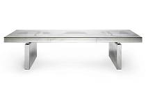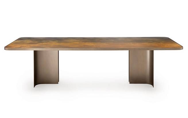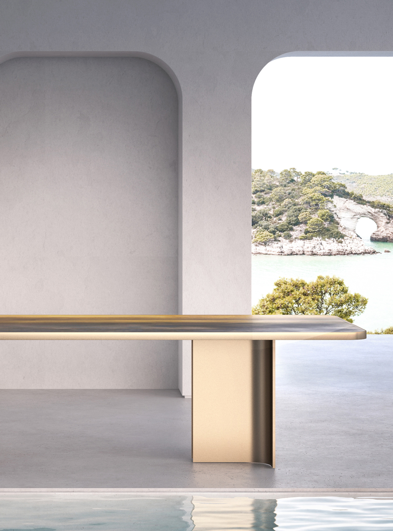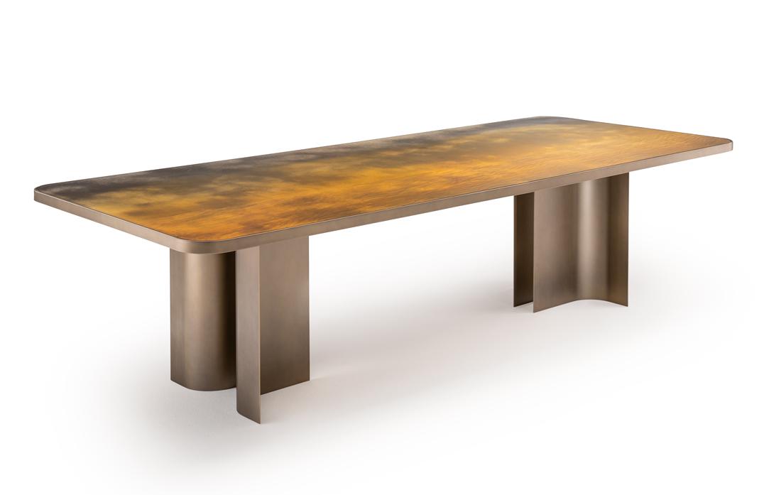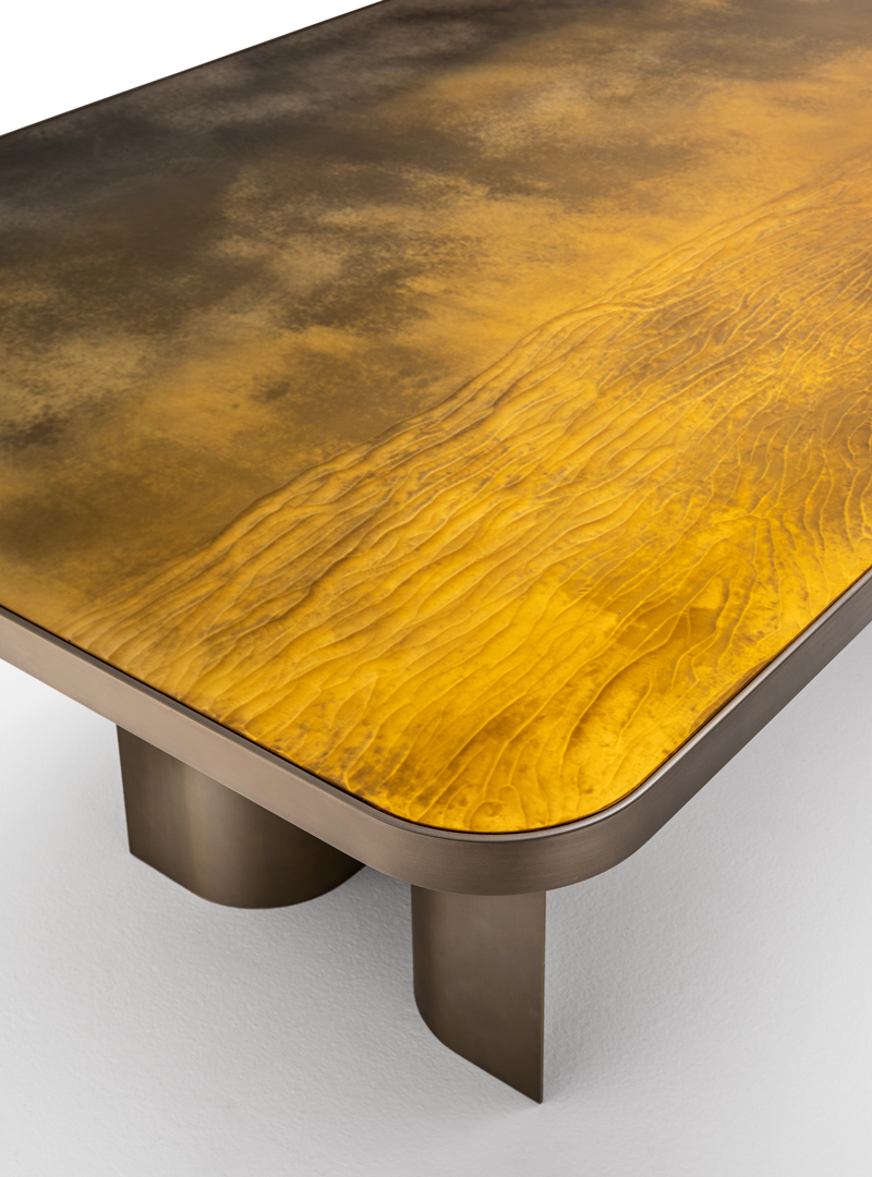 Столешница выполнена из матированного стекла с декором Gargano. Край столешницы отделан деревом с лакировкой под состаренную латунь, а ножки полностью изготовлены из состаренной латуни, что придает изделию благородный, сдержанный блеск.