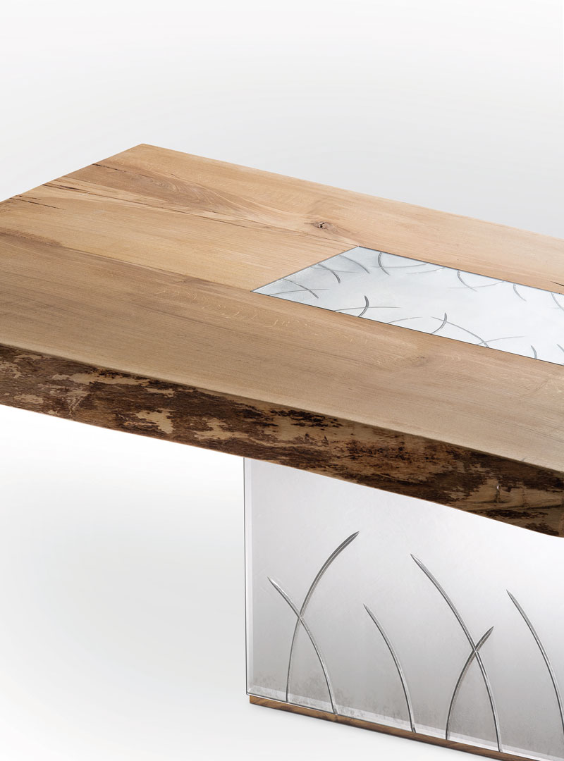 Столешница из массива дуба — теплое природное дополнение холодному блеску зеркала.
