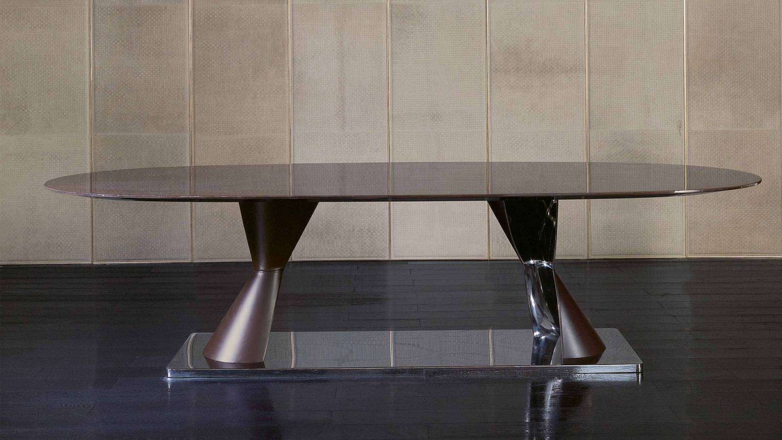 Металлическое основание бронзовая латунь. Отделка столешницы кожа, дерево, художественная роспись Decoro или мрамор.