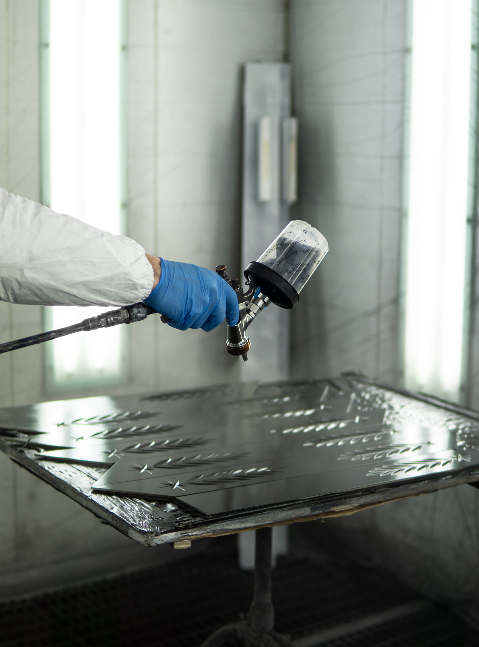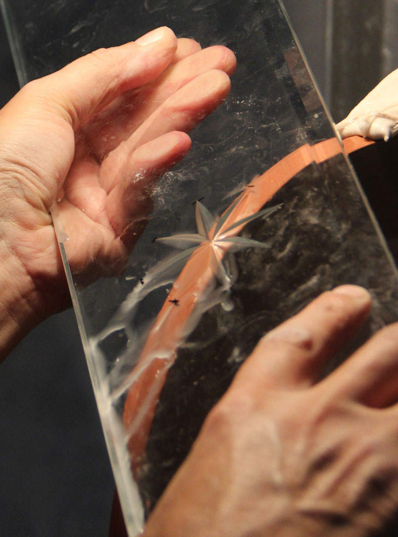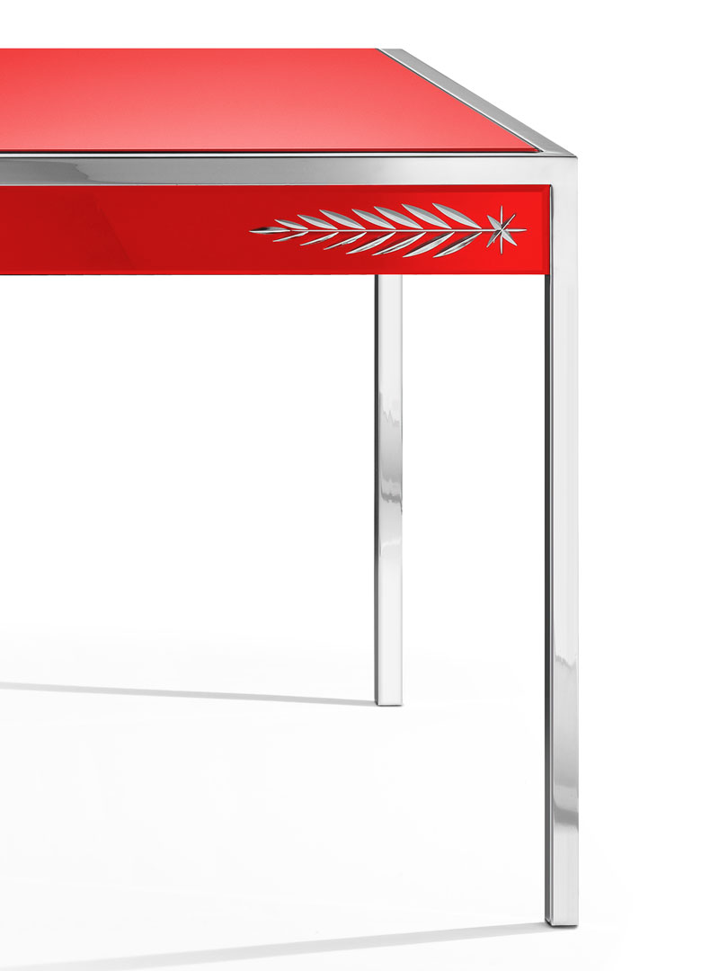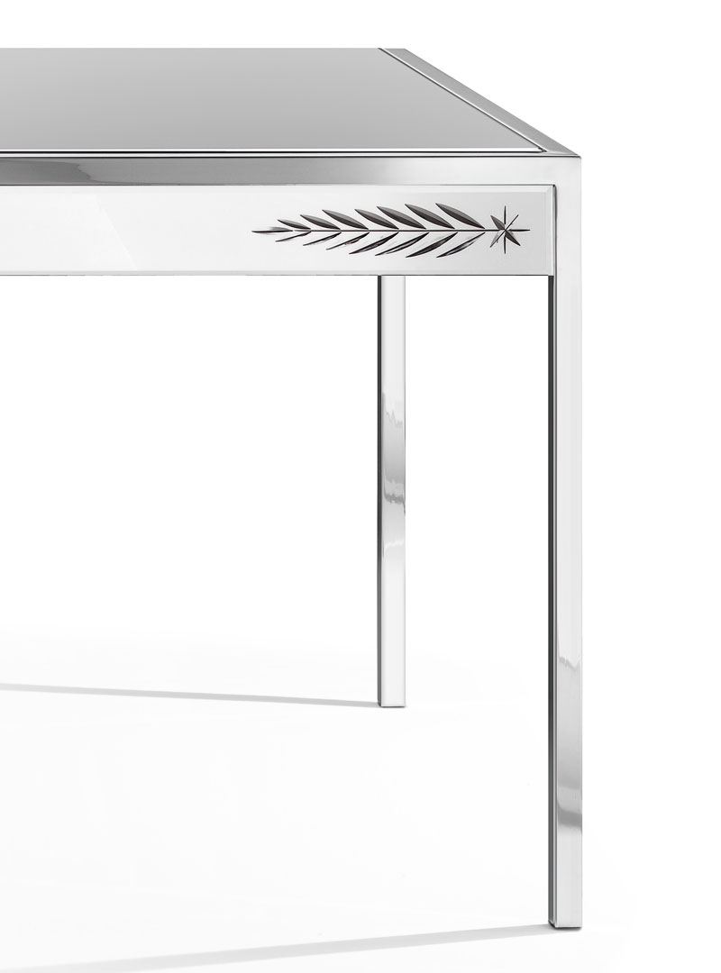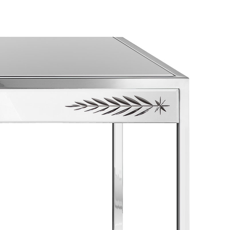 Каркас выполнен из дерева с покрытием матовым черным лаком, на него установлены зеркальные пластины с гравировкой, выполненной вручную.