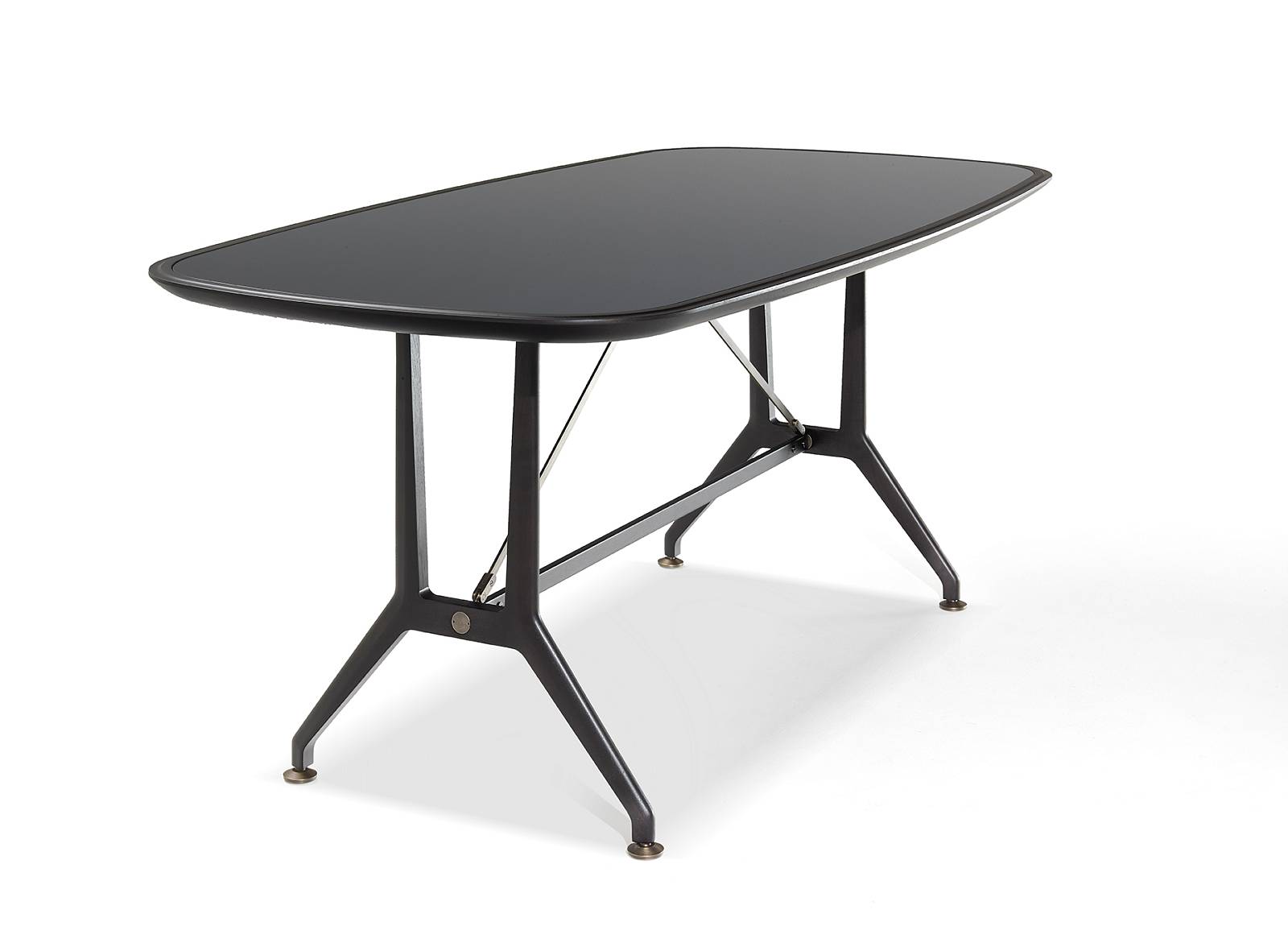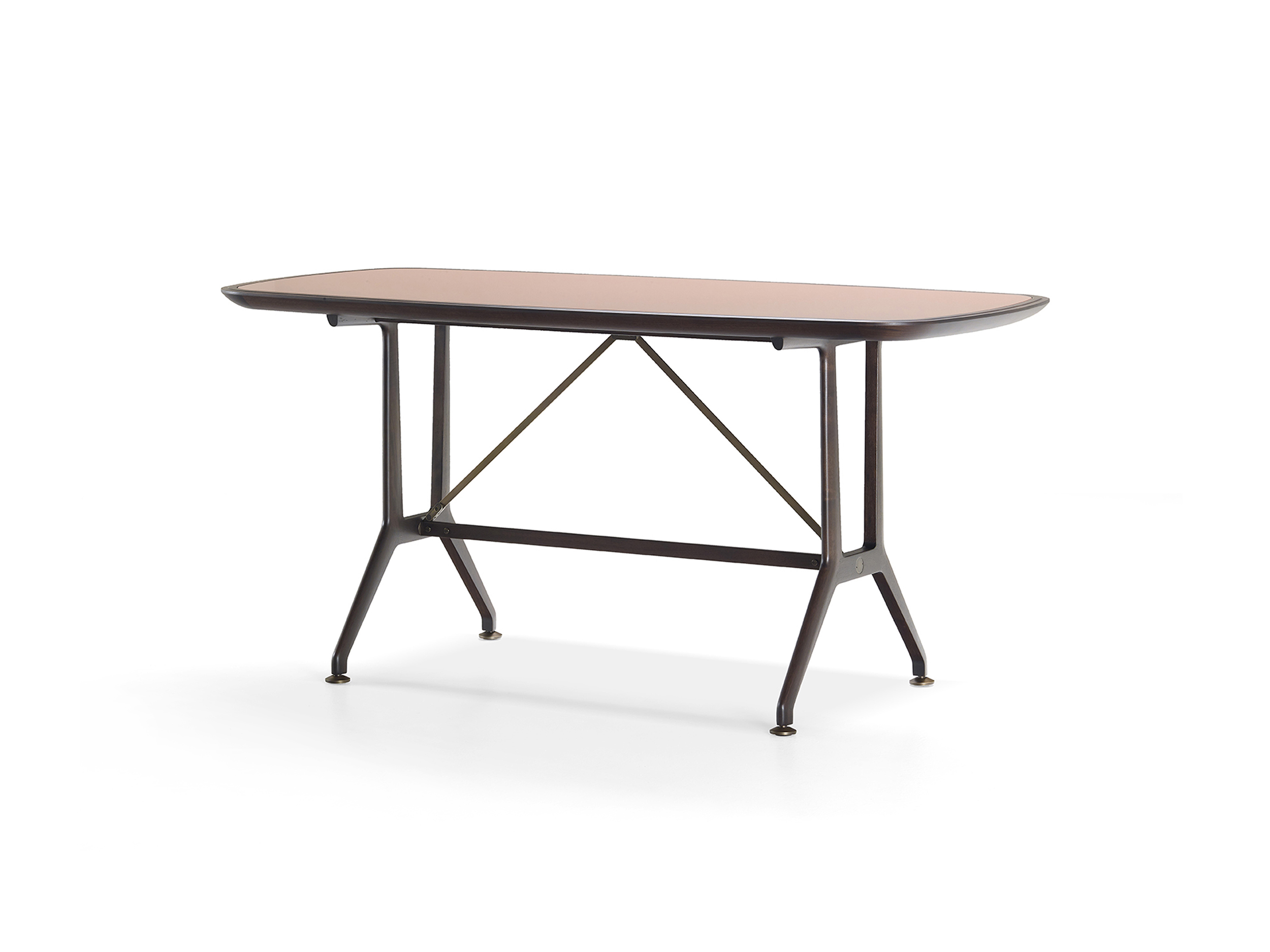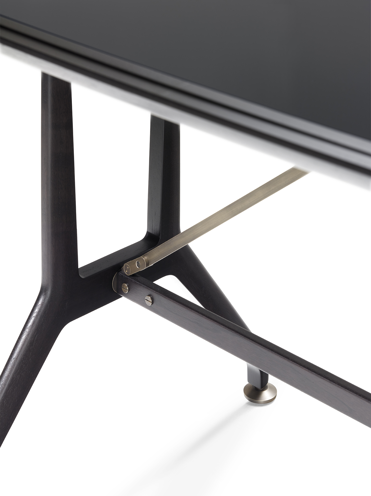 Каркас состоит из двух опор из цельного дерева, через которые проходят две латунные стойки, расположенные по диагонали, напоминающие форму Sopwith Camel, одного из самых важных британских истребителей-бипланов, использовавшихся во время Первой мировой войны. Стол со структурой, изготовленной из массива американского ореха. Тяги из матовой бронзовой латуни. Столешница доступна из фанеры, шпонированной американским орехом,