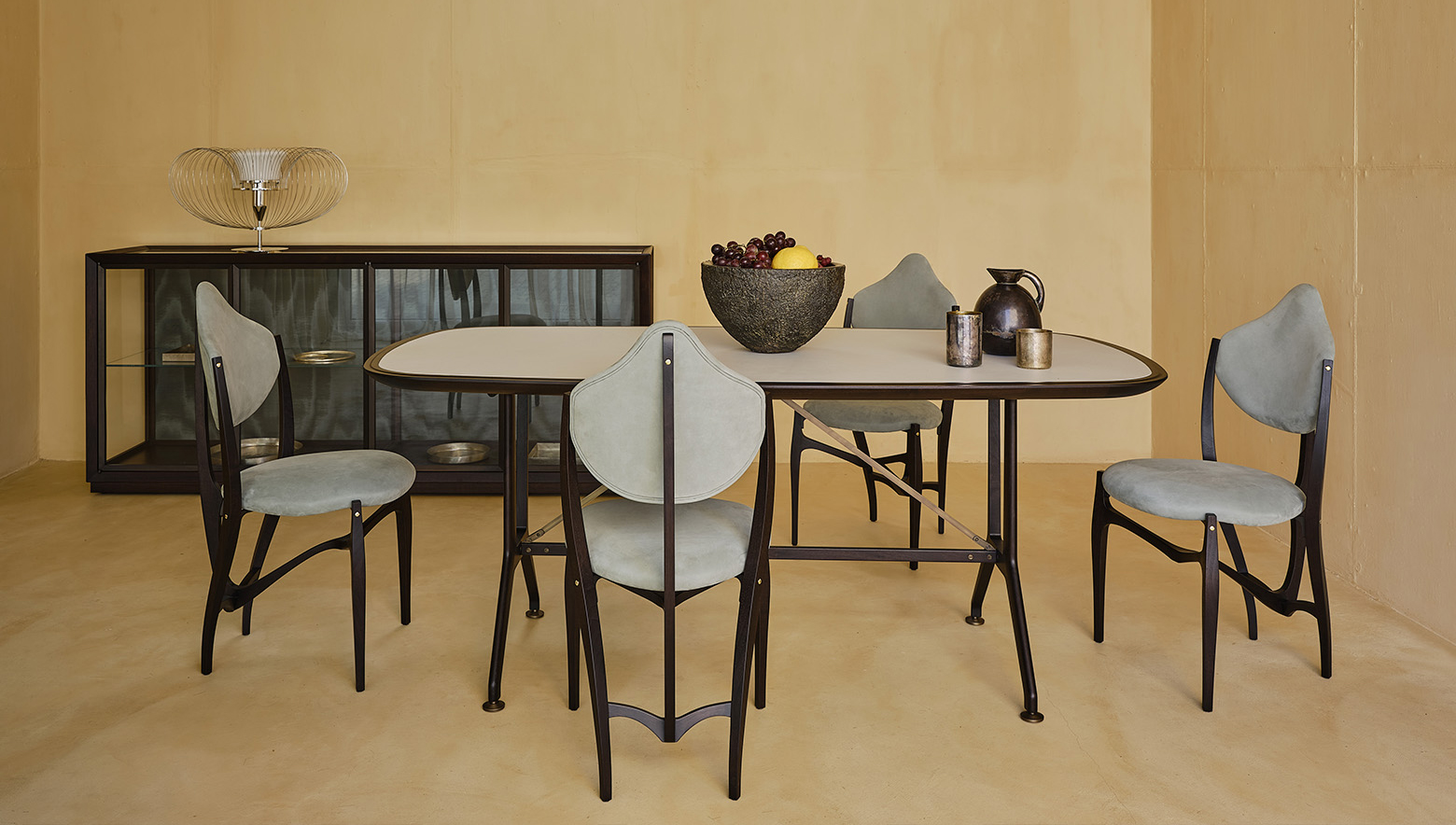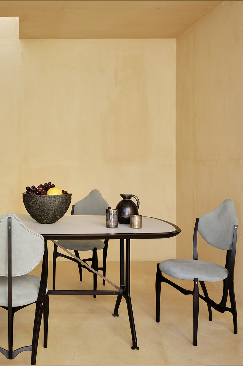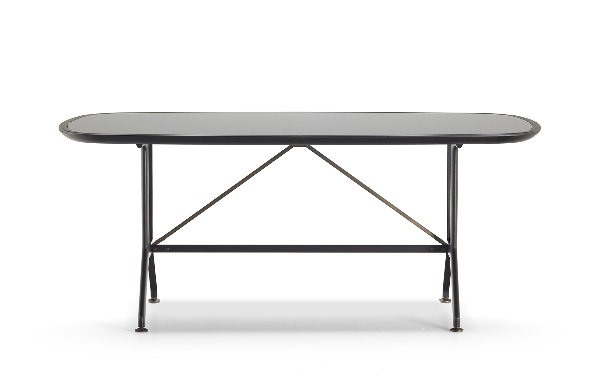 Каркас состоит из двух опор из цельного дерева, через которые проходят две латунные стойки, расположенные по диагонали, напоминающие форму Sopwith Camel, одного из самых важных британских истребителей-бипланов, использовавшихся во время Первой мировой войны. Стол со структурой, изготовленной из массива американского ореха. Тяги из матовой бронзовой латуни. Столешница доступна из фанеры, шпонированной американским орехом,