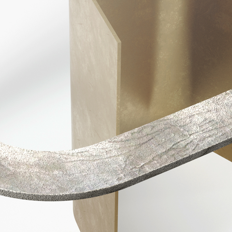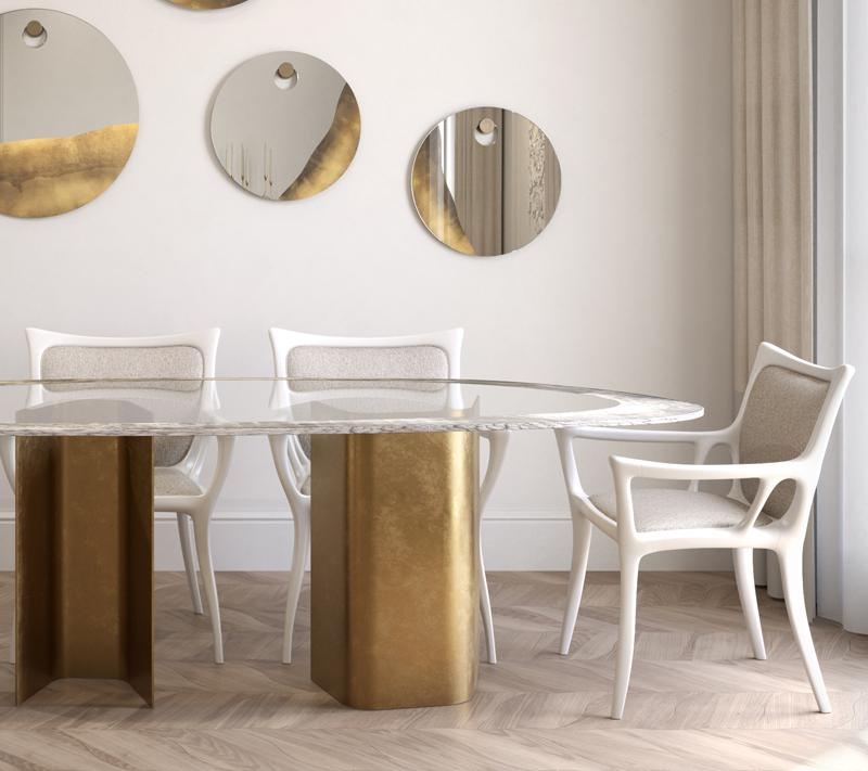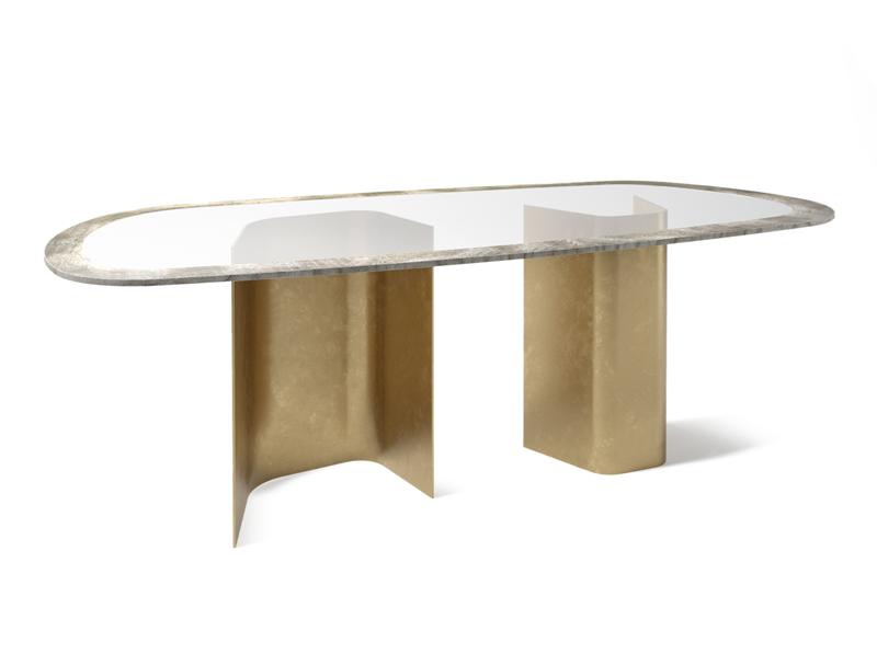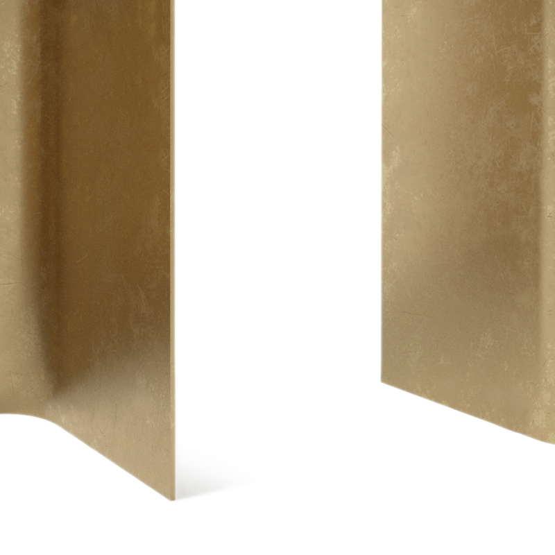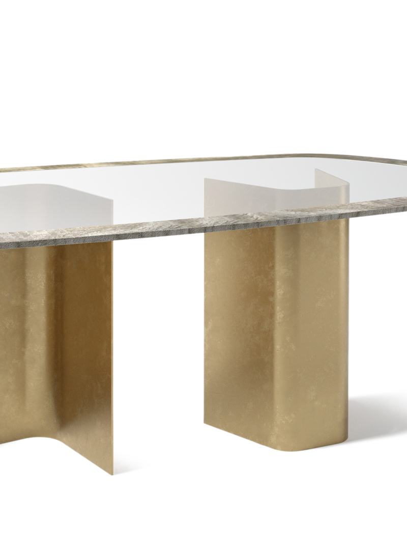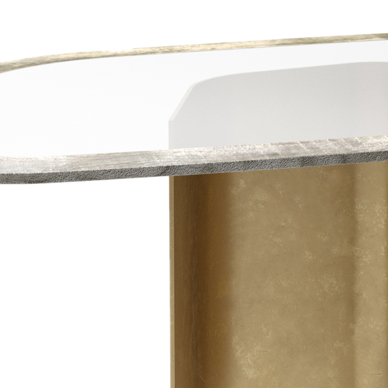 Металлическое основание с отделкой «состаренная латунь» поддерживает столешницу из прозрачного стекла толщиной 15 мм. Особую выразительность придает обработка кромки столешницы — гравировка алмазным и серебряным кругом, подчеркивающая чистоту линий.
