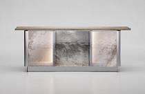 Структура из многослойного дерева с отделкой под дуб и деталями из полированной нержавеющей стали.