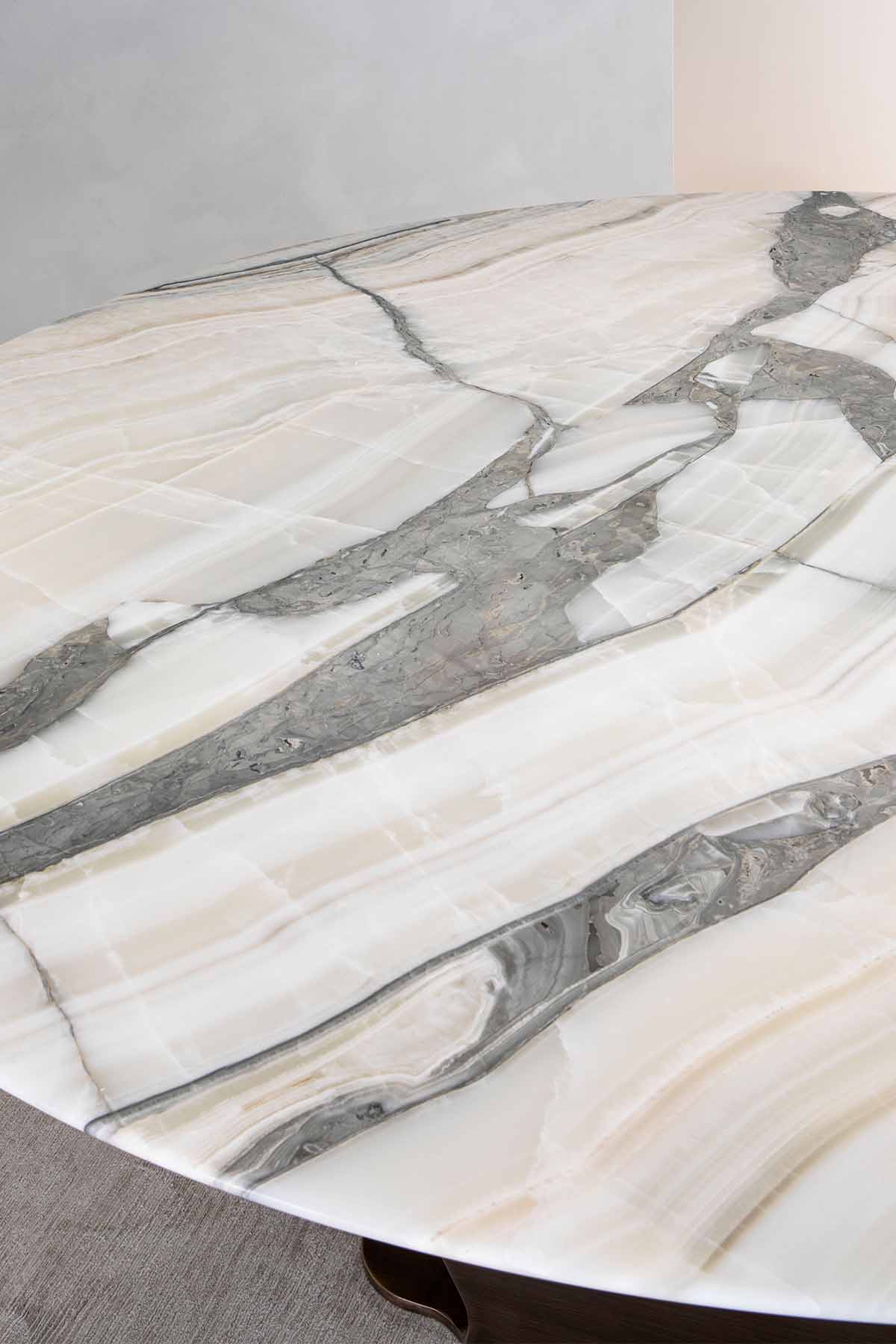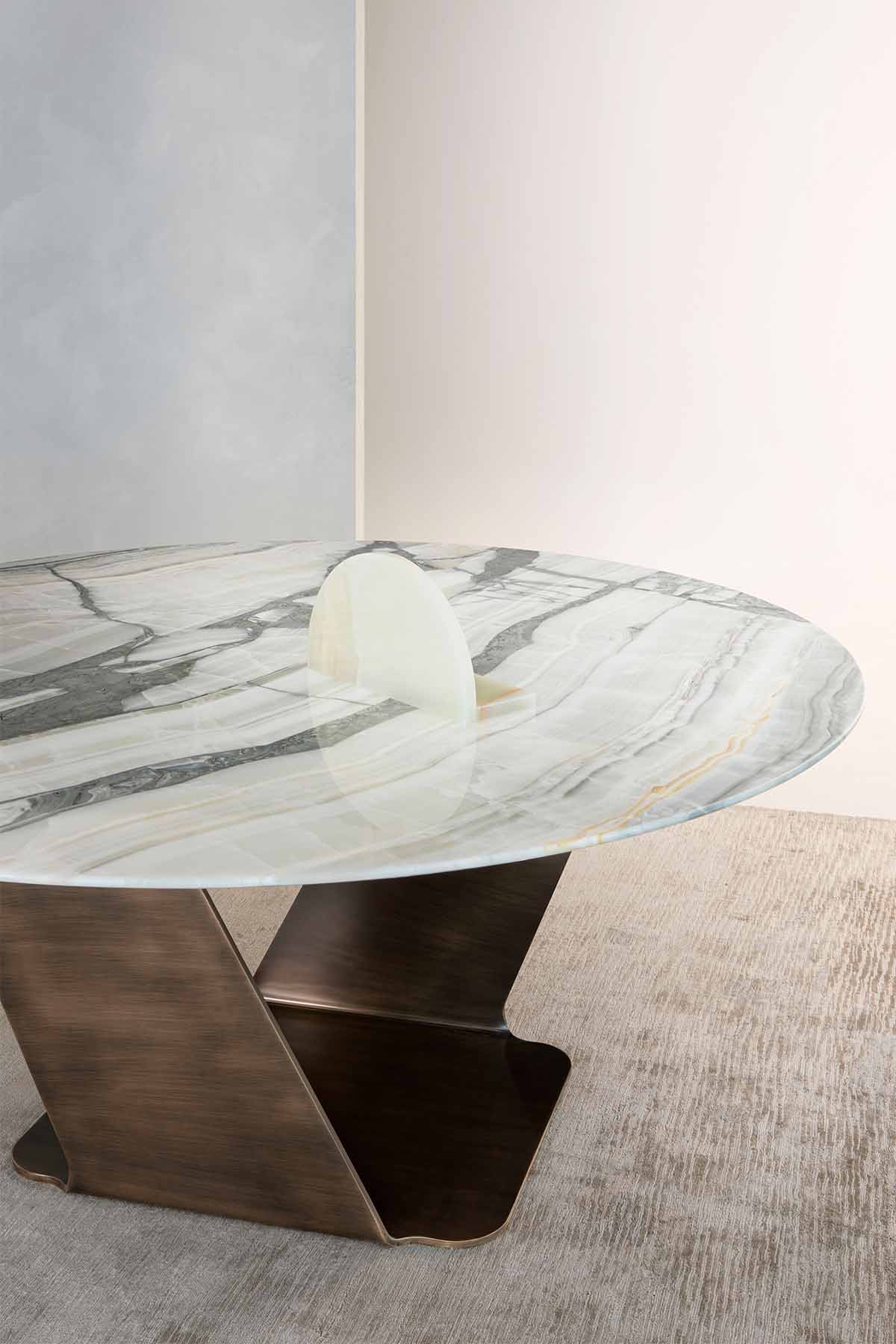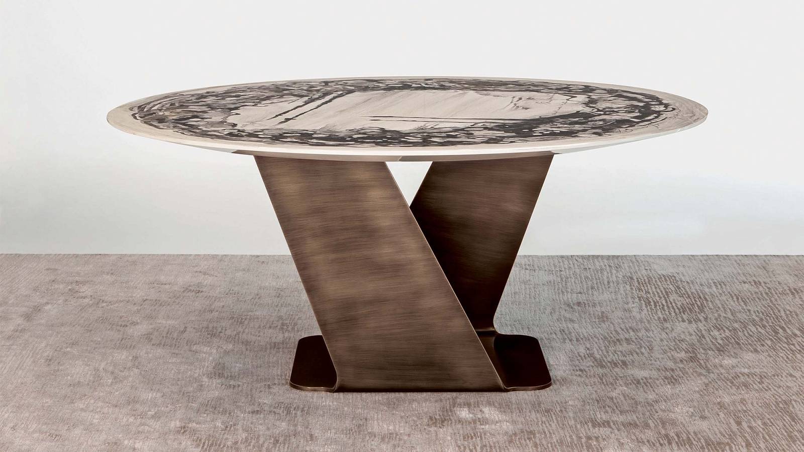 Металлическое основание бронзовая латунь. Отделка столешницы художественная роспись Decoro или мрамор.
