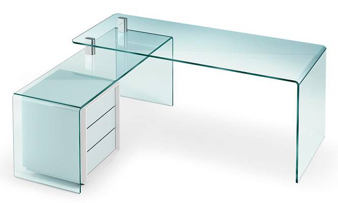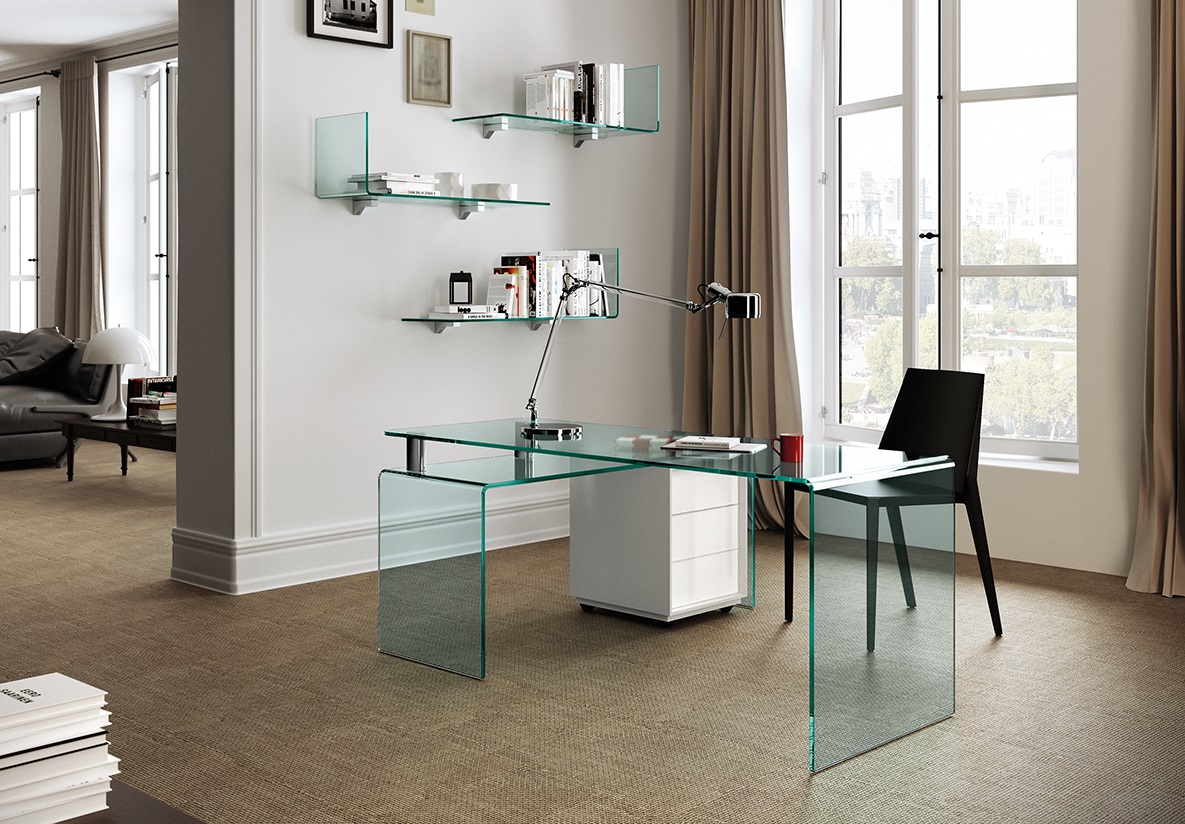 Стол с изогнутой стеклянной столешницей и полкой - легкость и функциональность в каждом элементе. Этот стол не утяжеляет пространство, т.к. сделан из прозрачного стекла.