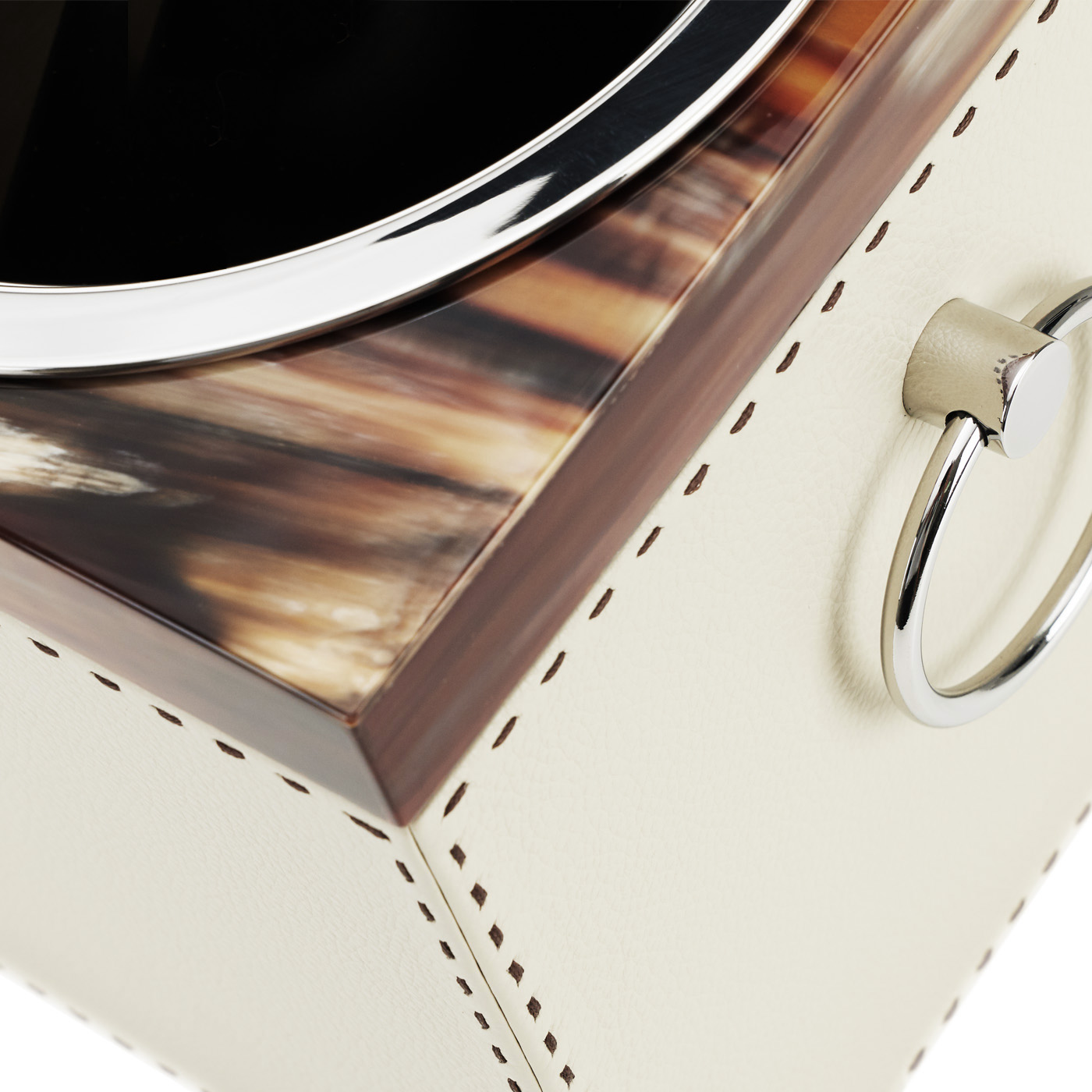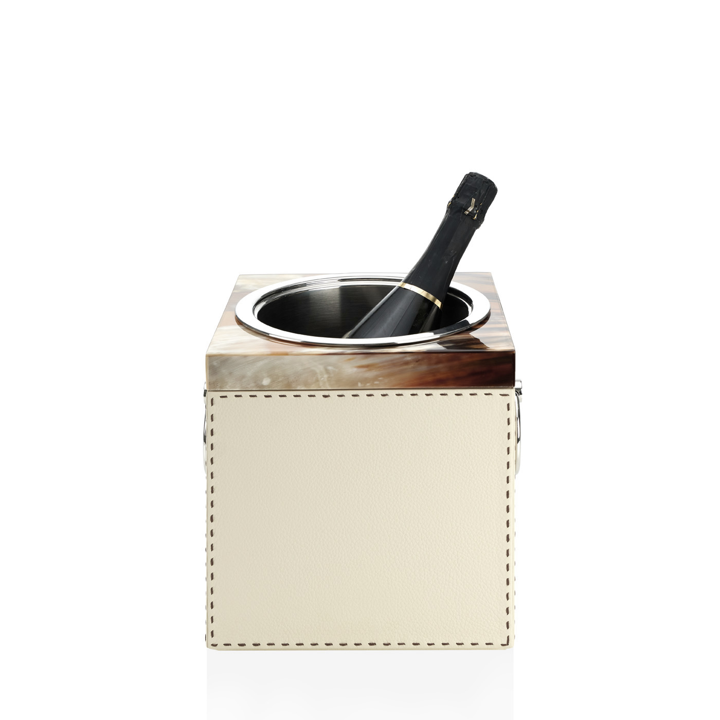 Сочетая изысканные материалы, дизайн ведёрка выделяется уникальным кантом из натурального рога с глянцевым покрытием и ручной седельной прострочкой. Оно обтянуто тиснёной кожей Aida с зернистой текстурой и представлено в цвете Onyx с айвориевой строчкой или в цвете Ice-cream с тёмно-коричневой строчкой.