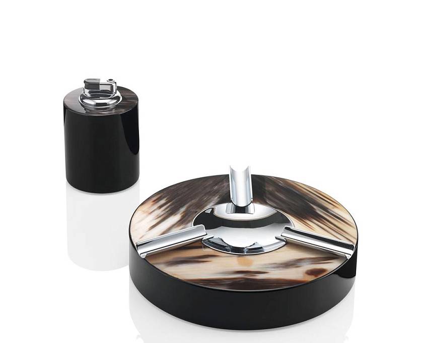 В комплект входят круглая пепельница и зажигалка.