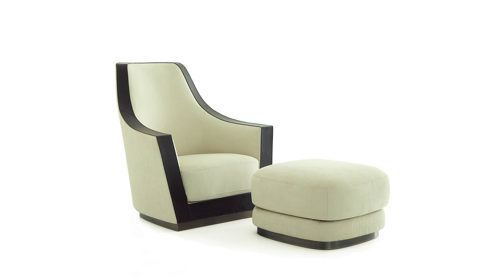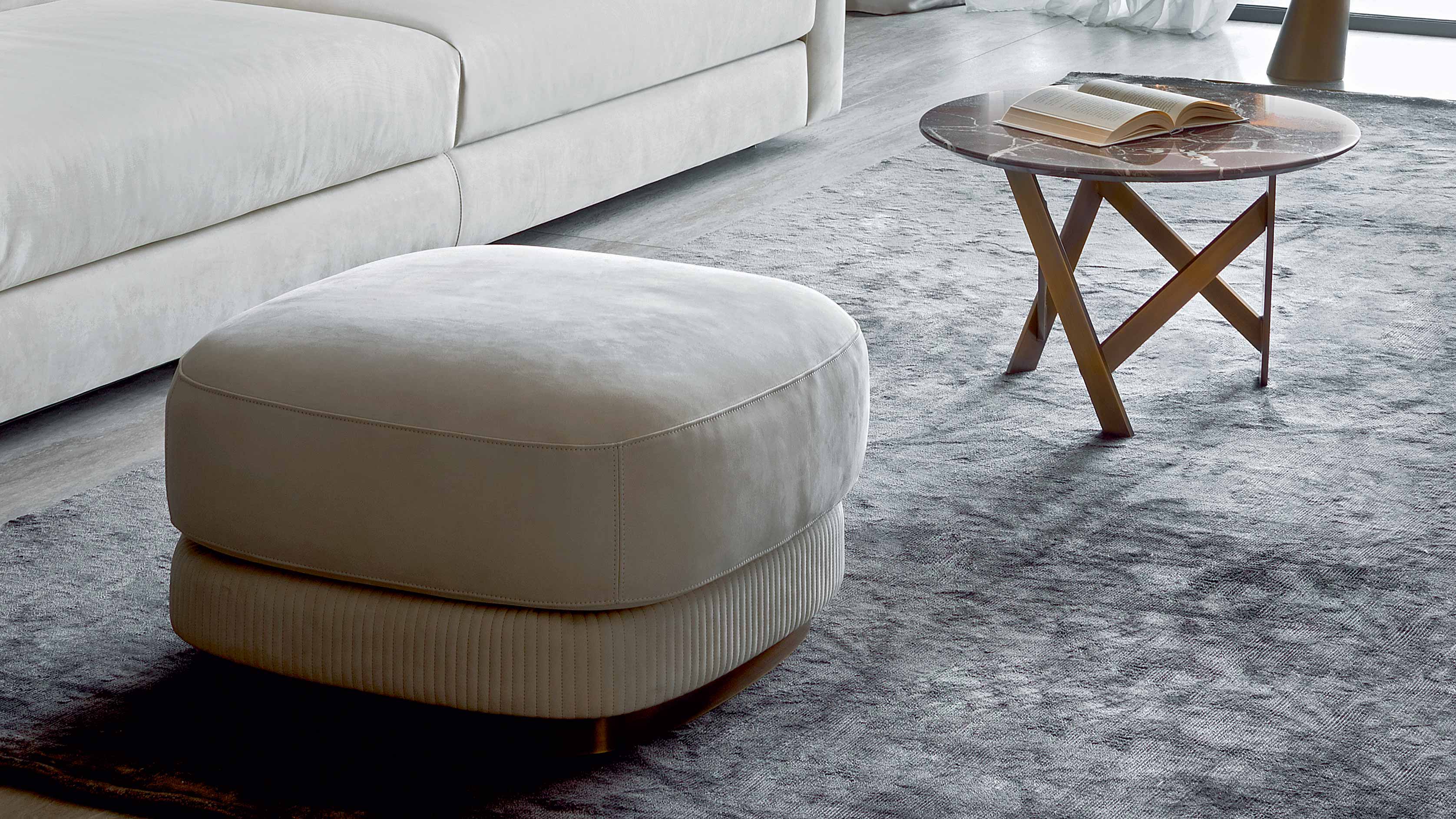Кожа или ткань. Металлические детали в отделке бронзовая латунь. Основание пуфа гладкое или с прострочкой.