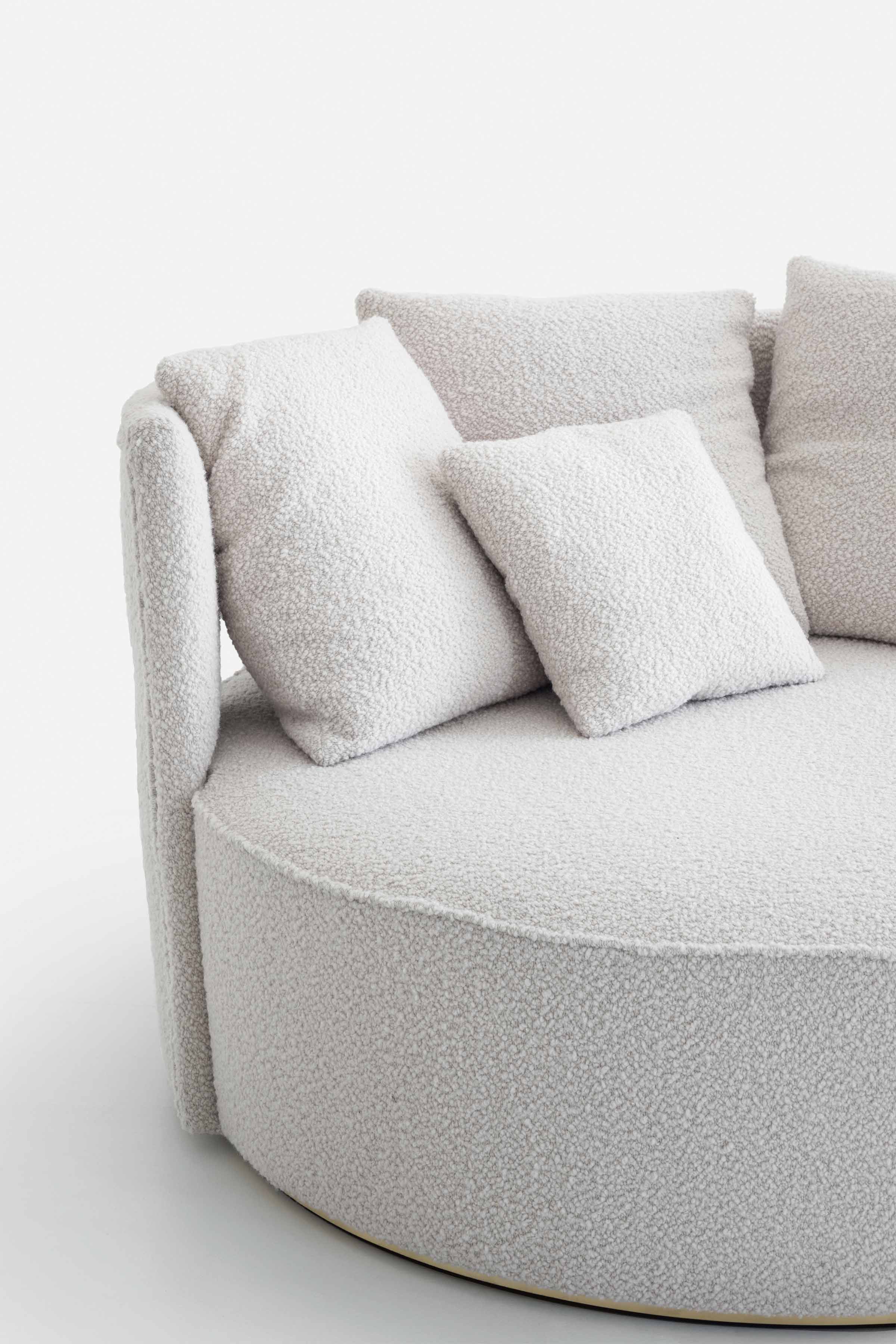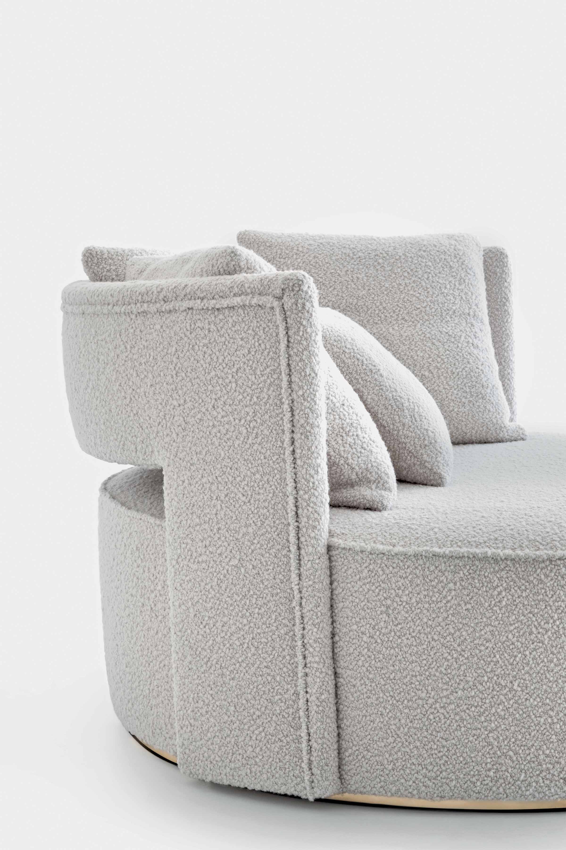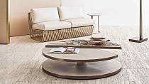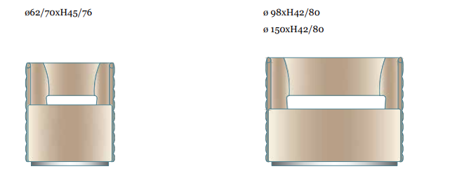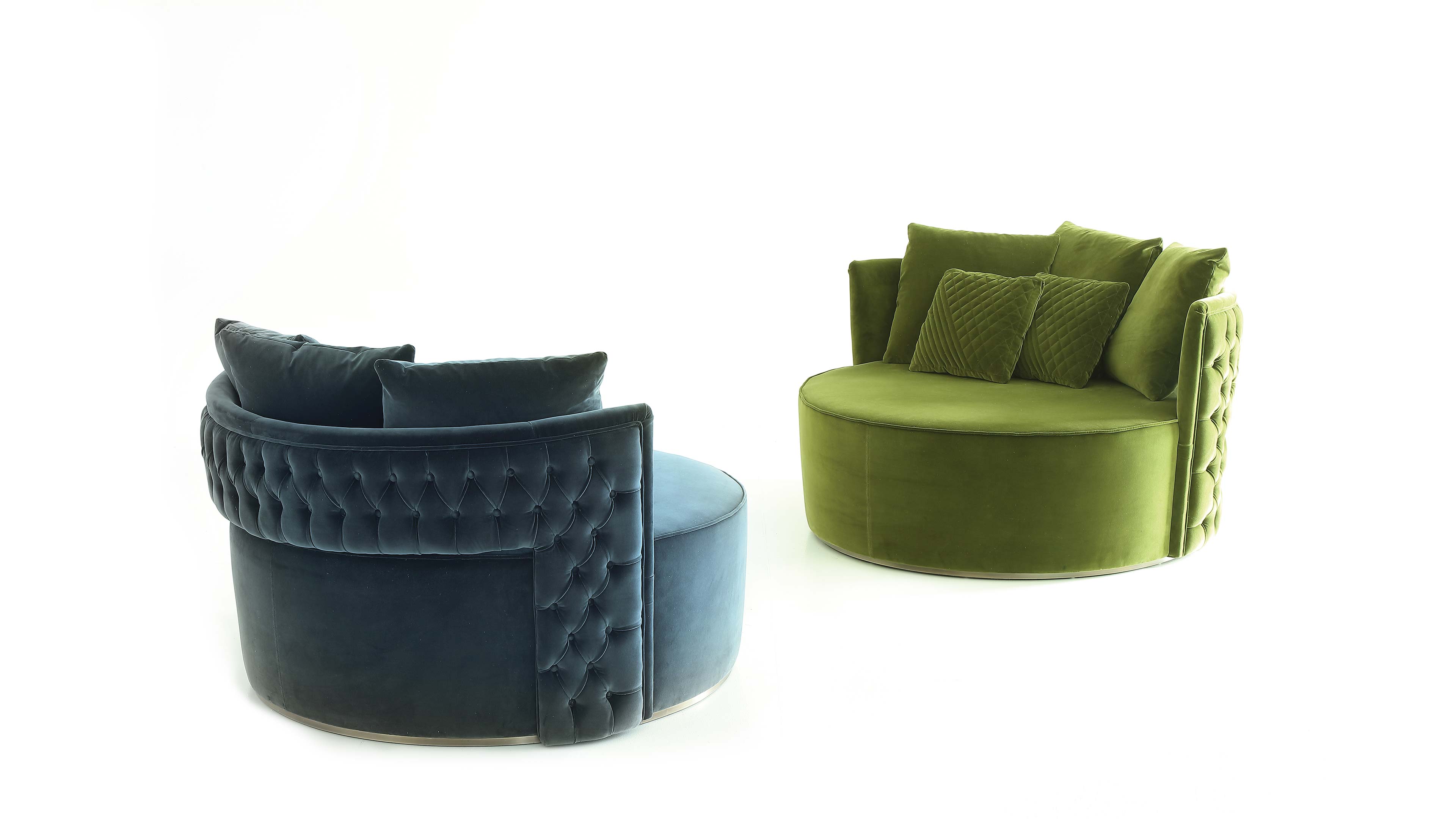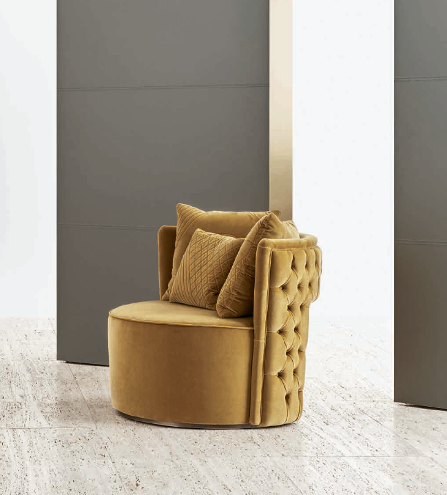 Кожа или ткань. Возможно дополнить поворотным механизмом. Металлические детали в отделке бронзовая латунь. Спинка пуфа гладкая или с прошивкой капитоне.