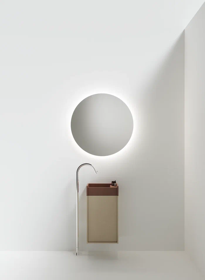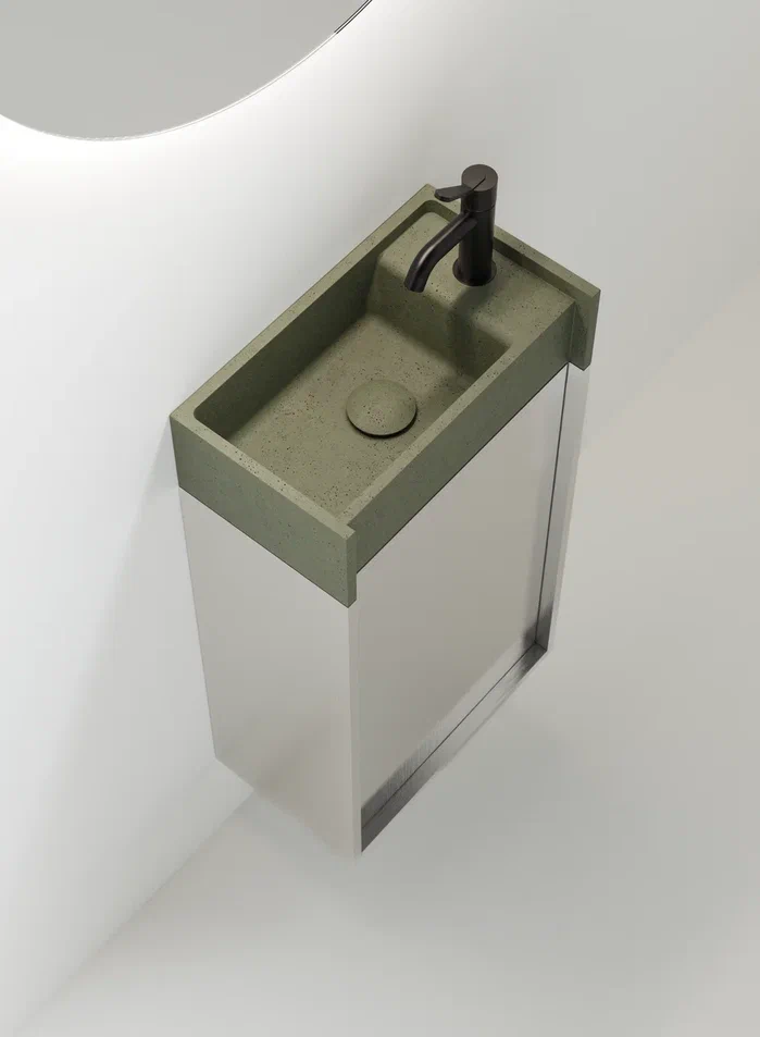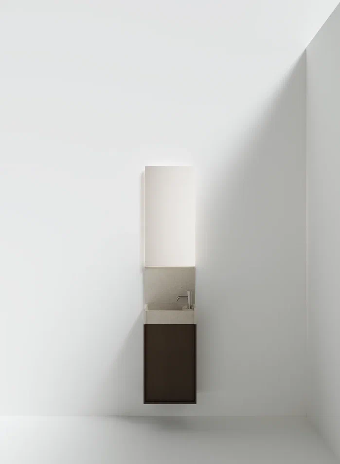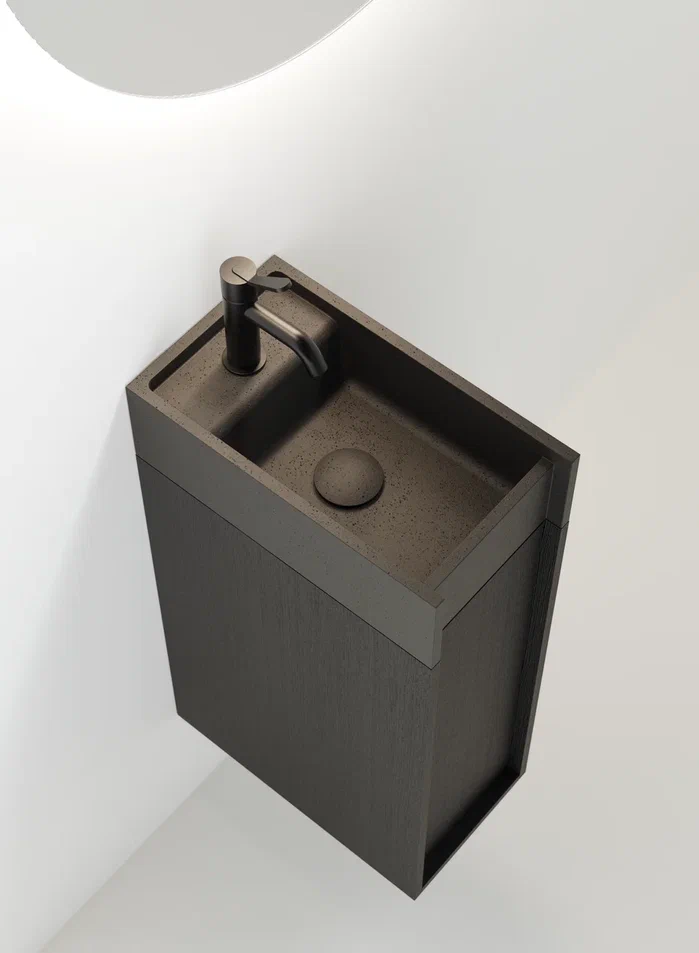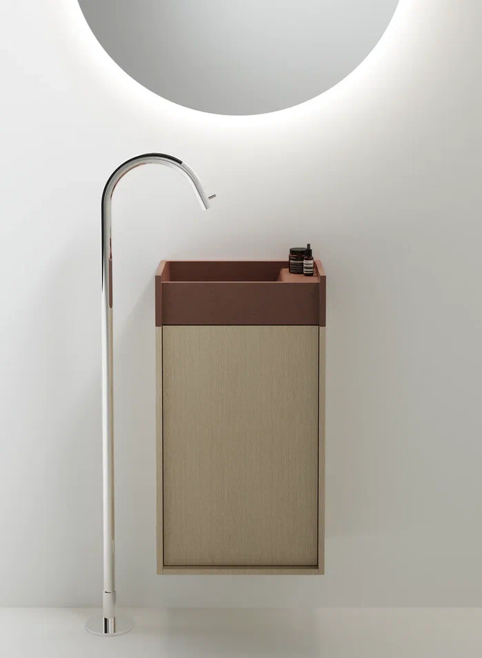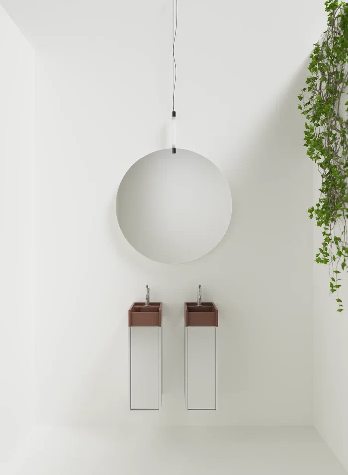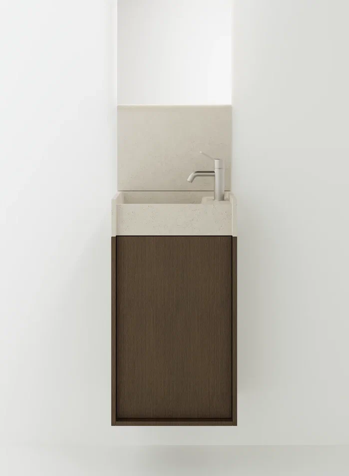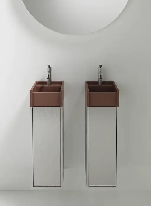 Минимальные размеры и исключительная гибкость для модульного объекта в двух вариантах.В перпендикулярном варианте, крепящемся к стене по короткой стороне, умывальник дополняется контейнером с выдвижным ящиком с двумя полками. Версия, параллельная стене и закрепленная на длинной стороне, интегрирована с контейнером с распашной дверцей и двумя полками или корзиной для полотенец с откидной дверцей.