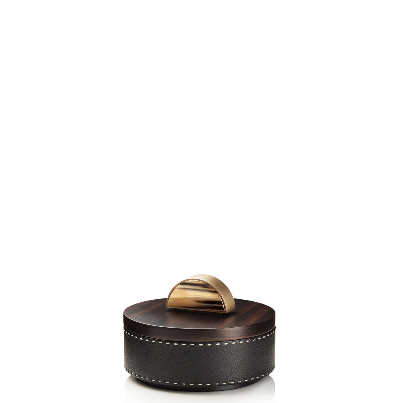 Сочетая в себе вечную привлекательность и утончённую эстетику, шкатулка Agneta станет элегантным акцентом в любом интерьере. Её поверхность обтянута фактурной кожей Aida глубокого оттенка «Onyx», дополненной контрастной ручной прострочкой цвета слоновой кости. Крышка, выполненная из матового шпона амарского эбена, украшена геометрической ручкой из рога и патинированной латуни. Шкатулка представлена в трёх размерах, а также в варианте с кожаной отделкой цвета «Ice-cream» и тёмно-коричневой прострочкой, создавая стильное и изысканное пространство для хранения ваших драгоценных мелочей и памятных вещей.