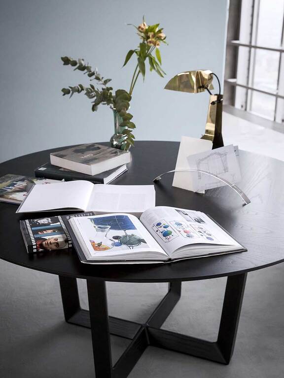 Опорная конструкция столов Bolero выполнена из массива дерева с треугольным сечением. Для основания используется ясень с отделкой под венге или мокко, либо орех Каналетто. Столешница может быть деревянной или мраморной. Деревянная версия покрыта шпоном из ясеня с отделкой под венге или мокко либо шпоном ореха Каналетто, отличающегося характерным инкрустированным рисунком с перекрестной текстурой, гармонирующим с ножками стола. Края столешницы декорированы кантом из массива дерева.
