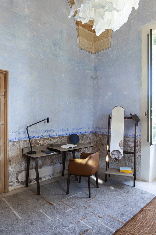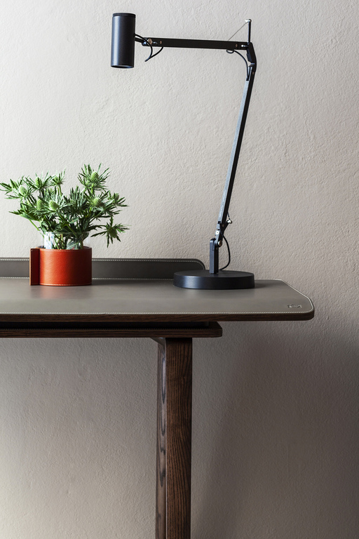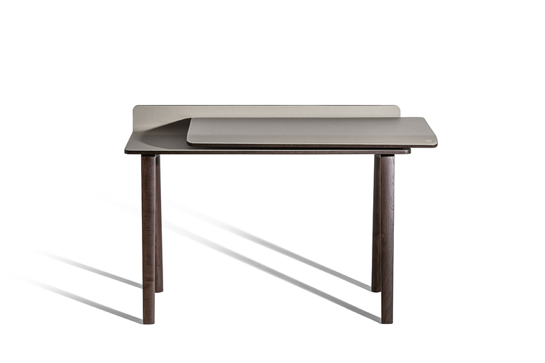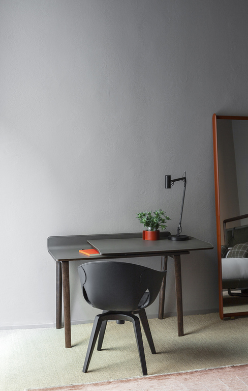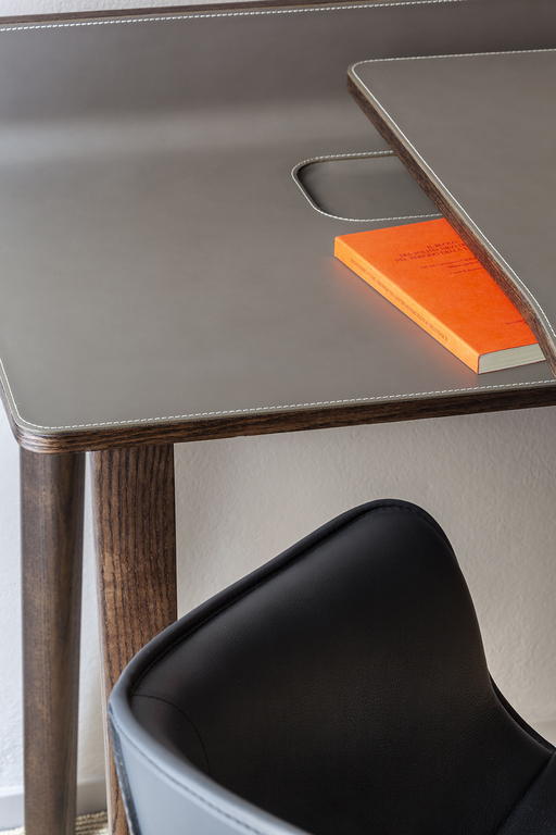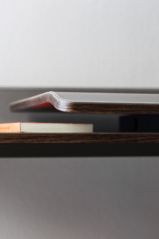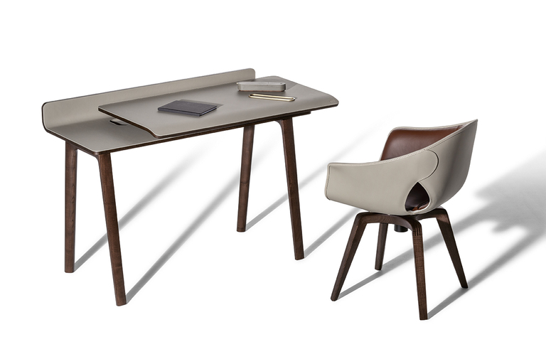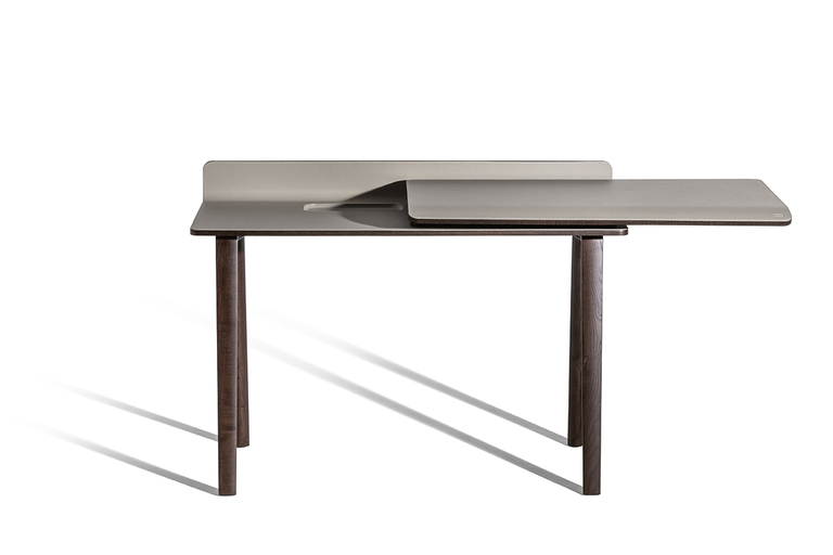 Письменный стол Iren от Poltrona Frau представлен в двух версиях: в напольной, где столешница поддерживается базой из массива ясеня, и настенной, с креплением на кронштейнах. При заказе клиент может выбрать направление скольжения столешницы — влево или вправо.