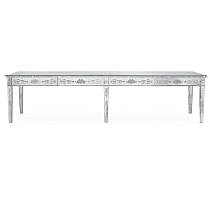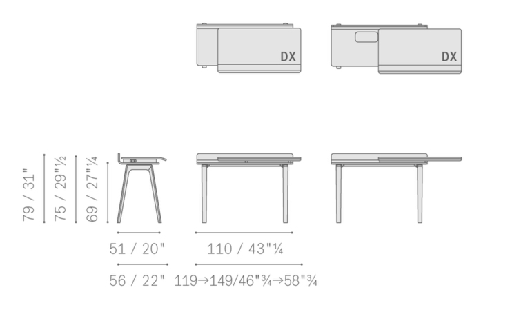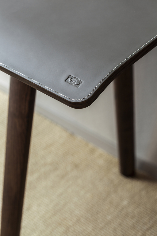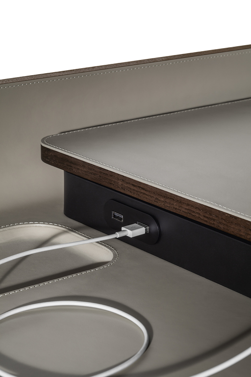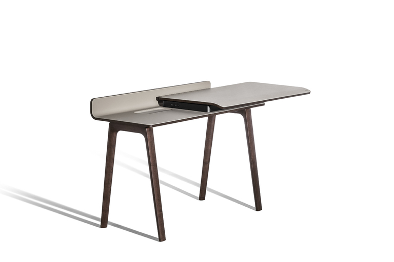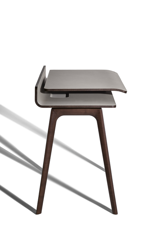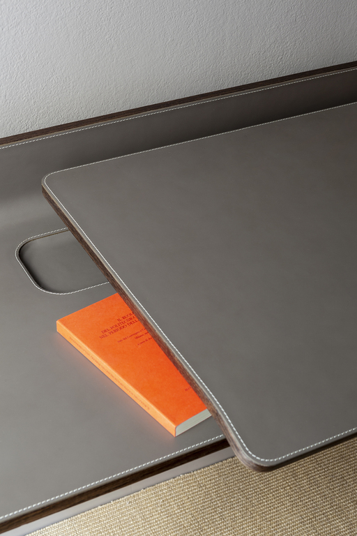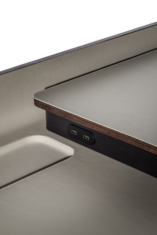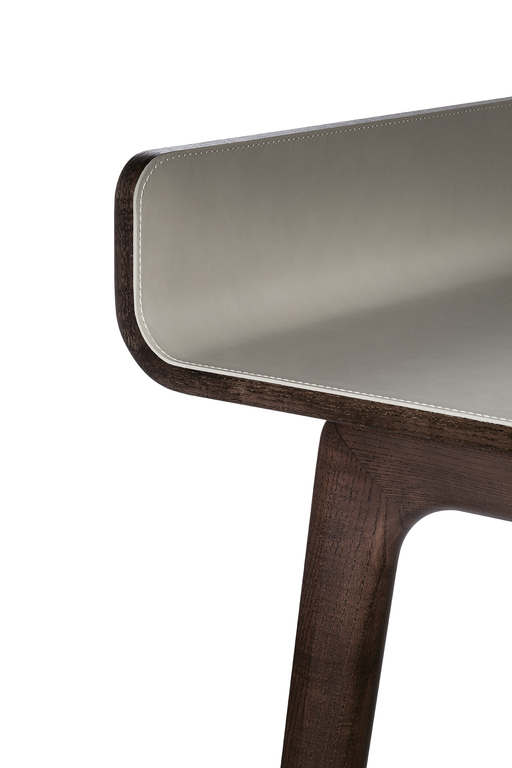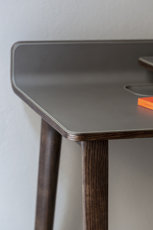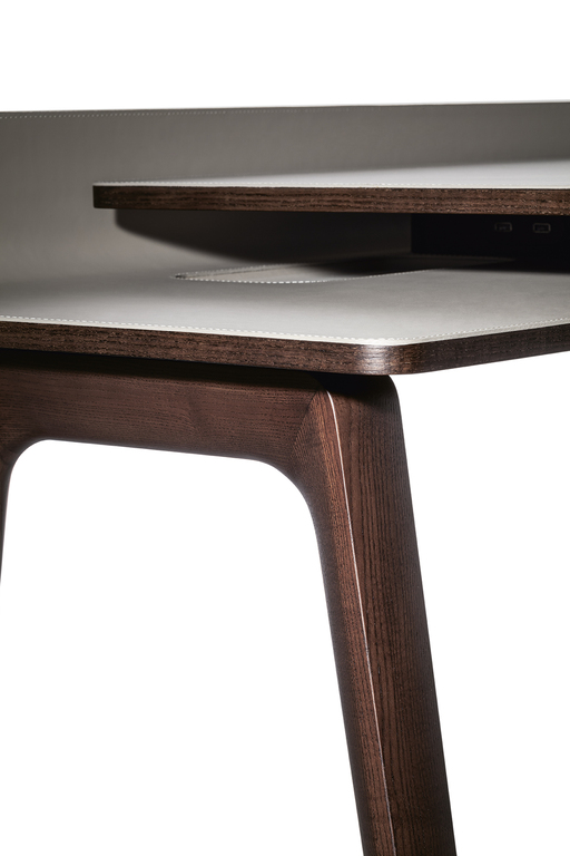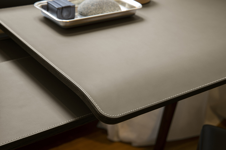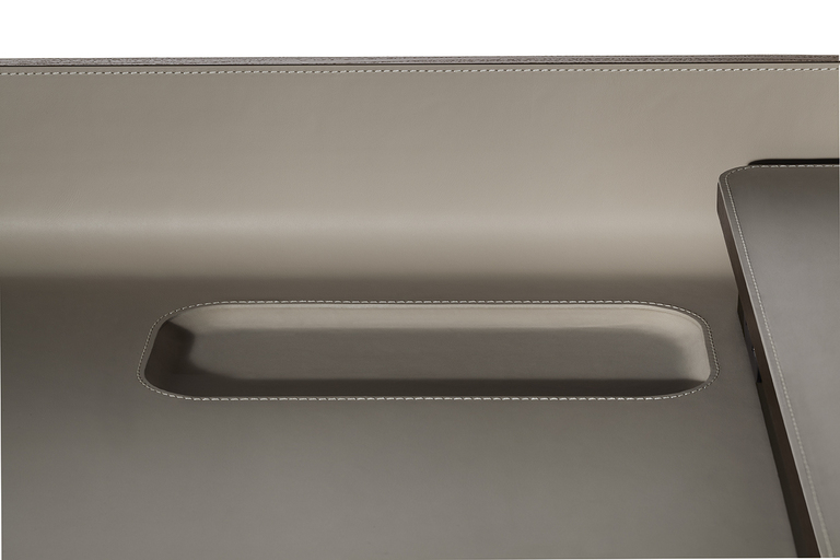 Рабочая поверхность стола Iren увеличивается с 119 см до 149 см при полном выдвижении верхней части. Видимые деревянные элементы выполнены из ясеня с отделкой под мокко или венге. Столешница может быть обтянута кожей или Saddle leather с однотонной или контрастной строчкой по краям. Логотип Poltrona Frau аккуратно размещен в правом нижнем углу выдвижной поверхности.