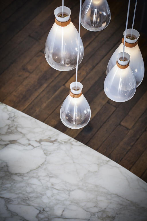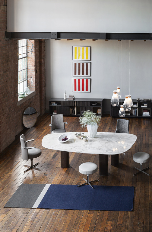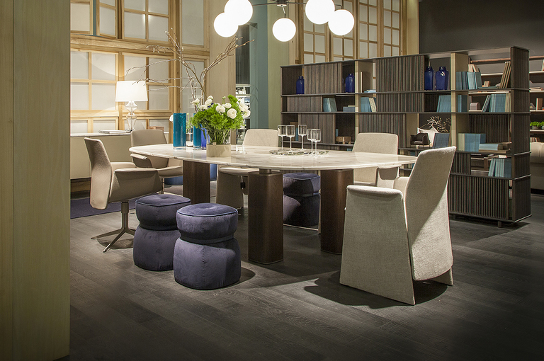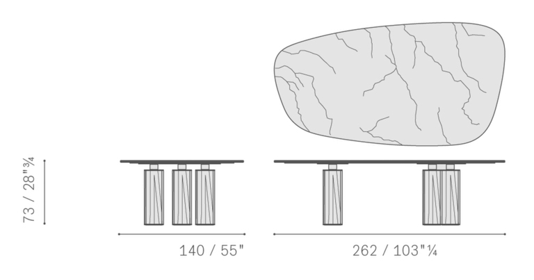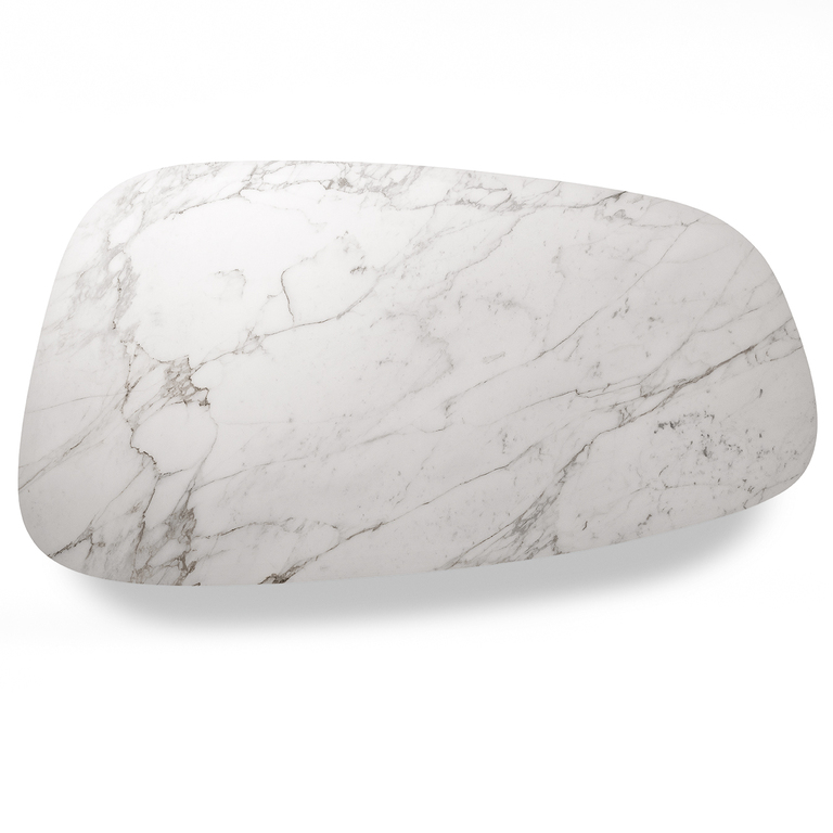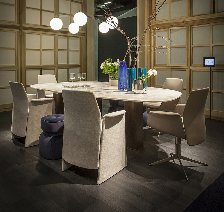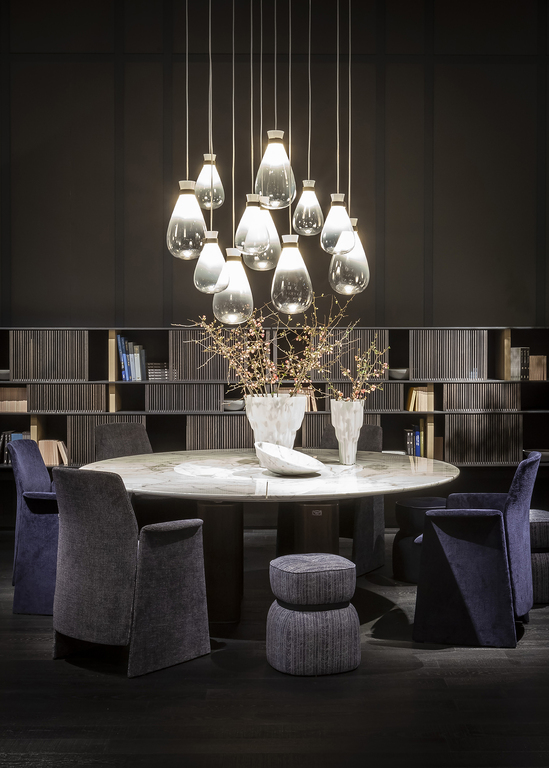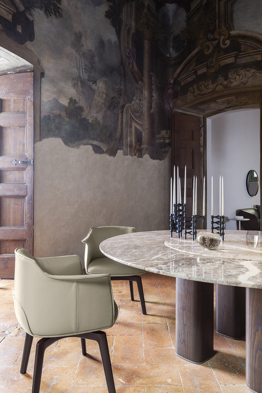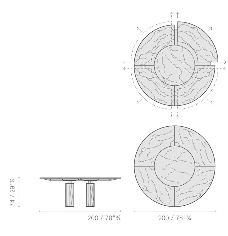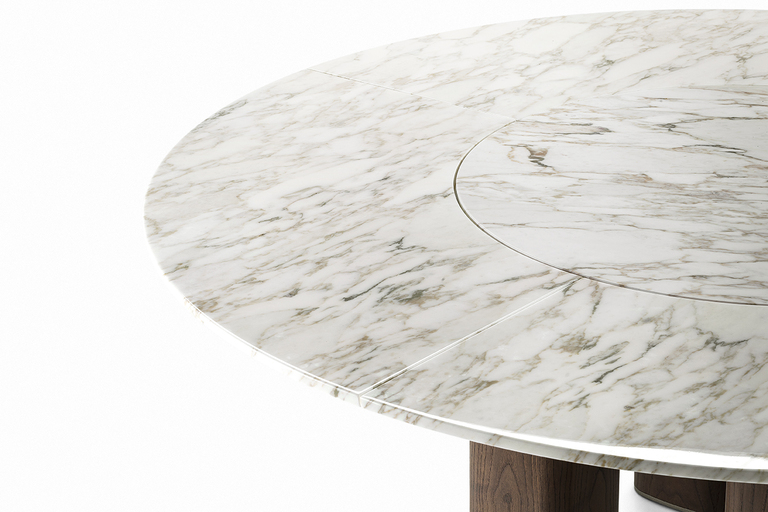Стол Jane также представлен в круглой версии с четырьмя колоннами и мраморной столешницей, состоящей из четырех съемных радиальных секций и круглой центральной пластины, которая может вращаться по запросу (Lazy Susan). Центральная часть столешницы доступна из мрамора Calacatta Gold, Emperador или Fior di Pesco (с глянцевой или полуглянцевой отделкой). Радиальные секции можно выдвигать до 10 см, что облегчает их очистку. Они выполнены из мрамора Calacatta Gold или Emperador с глянцевой отделкой, соответствующей типу отделки, выбранной для центрального диска.