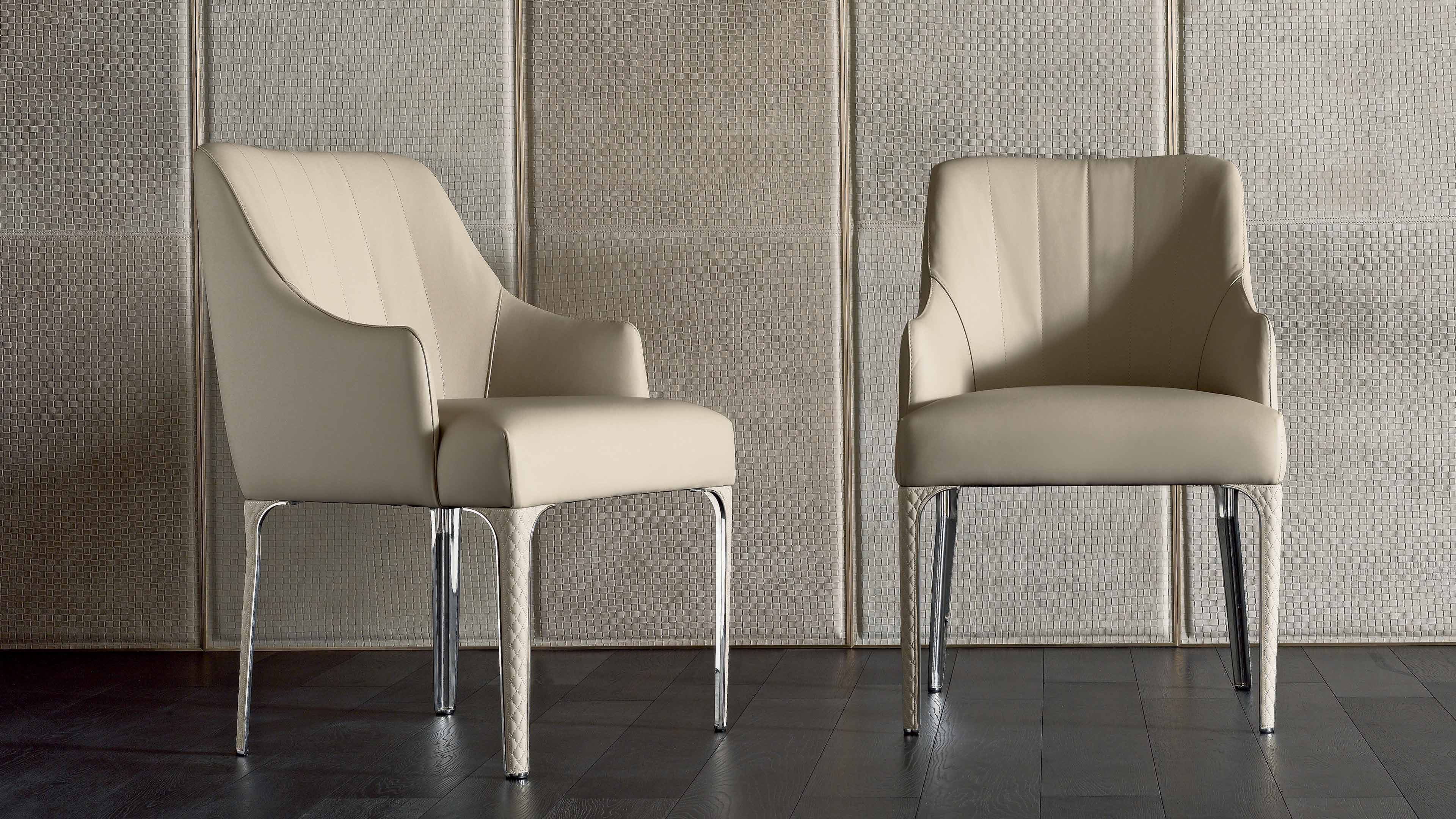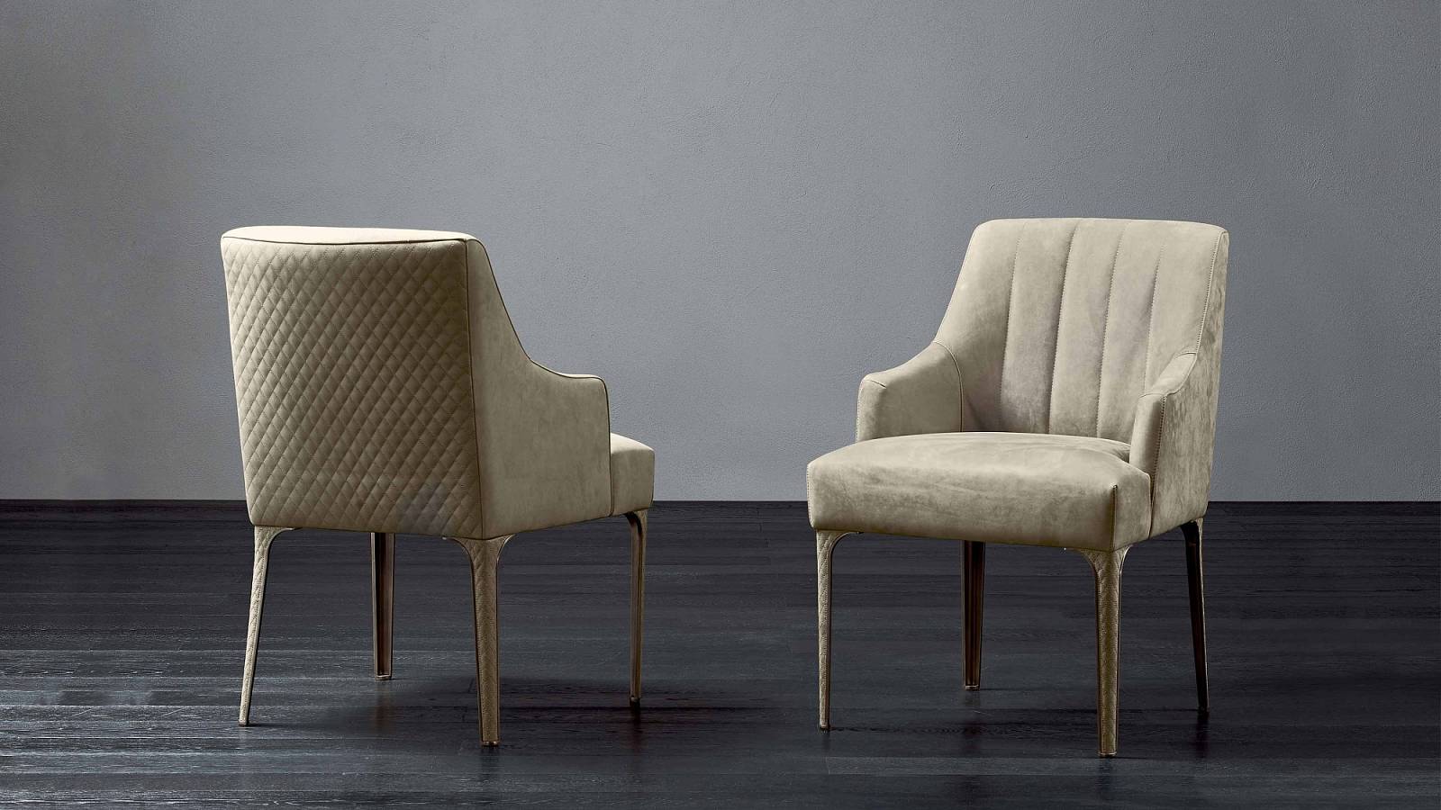 Обивка из ткани или кожи. Спинка может быть выполнена с декоративной прострочкой. Металлические детали ножек в отделке бронзовая латунь или хром.