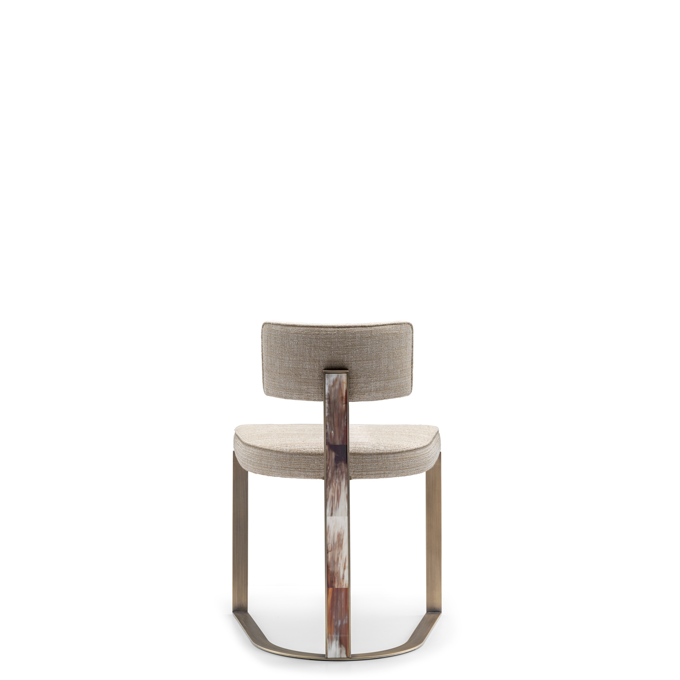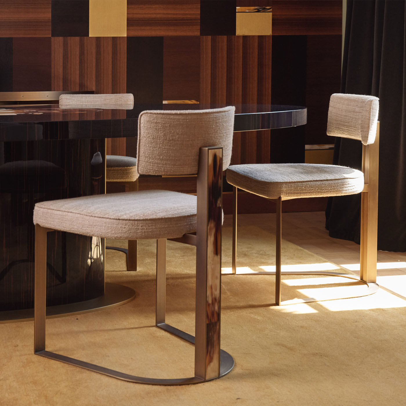 С изящным каркасом из патинированного металла и плавными, элегантными линиями, кресло Sveva поражает своим утонченным дизайном. Ручной работы пластины из рога с глянцевым покрытием придают ему особую эксклюзивность, превращая в эффектный акцент интерьера. Совмещая роскошь и комфорт, модель оснащена глубокой мягкой подушкой сиденья и эргономичной спинкой, создавая стильную и фактурную поверхность.