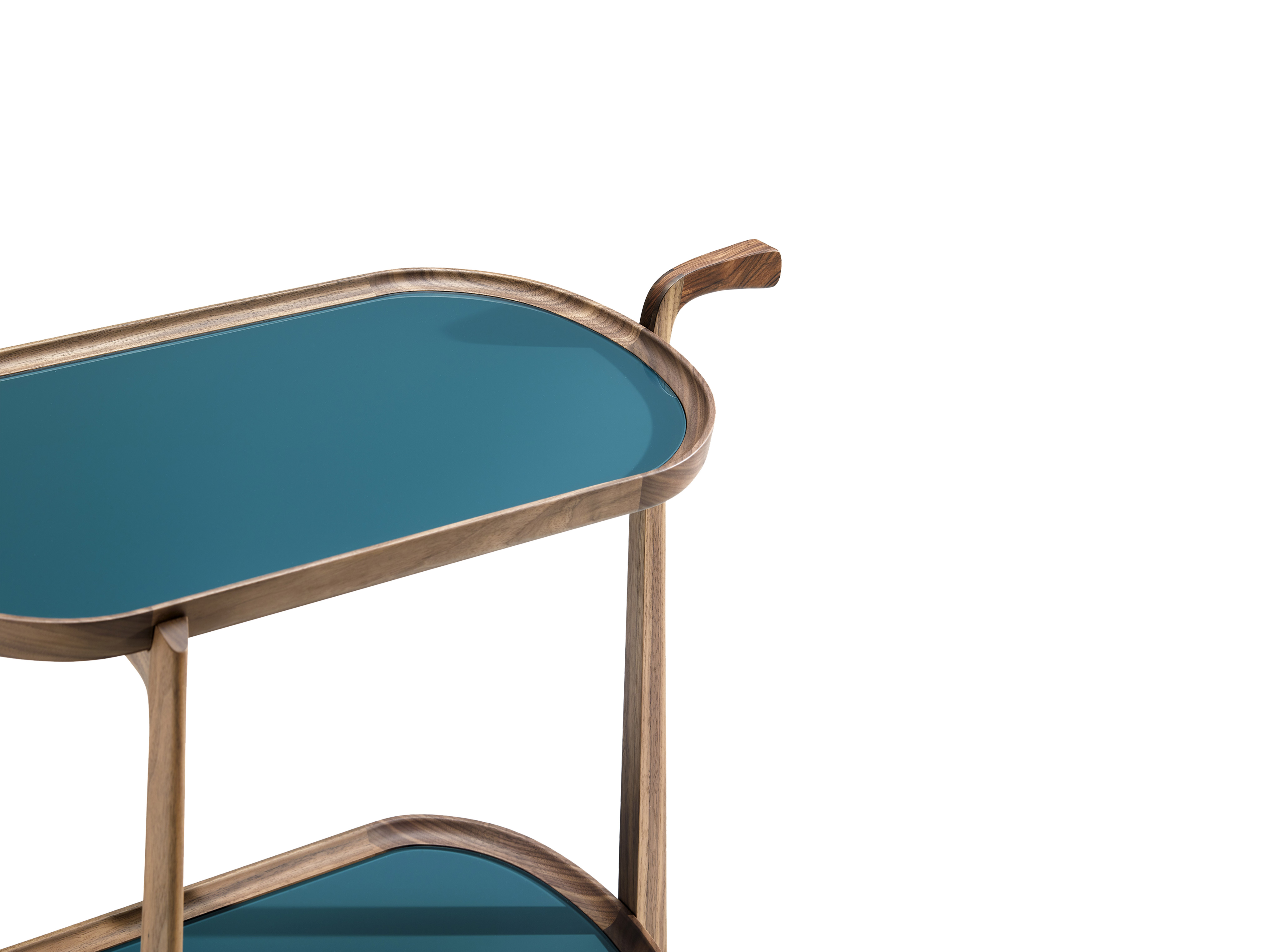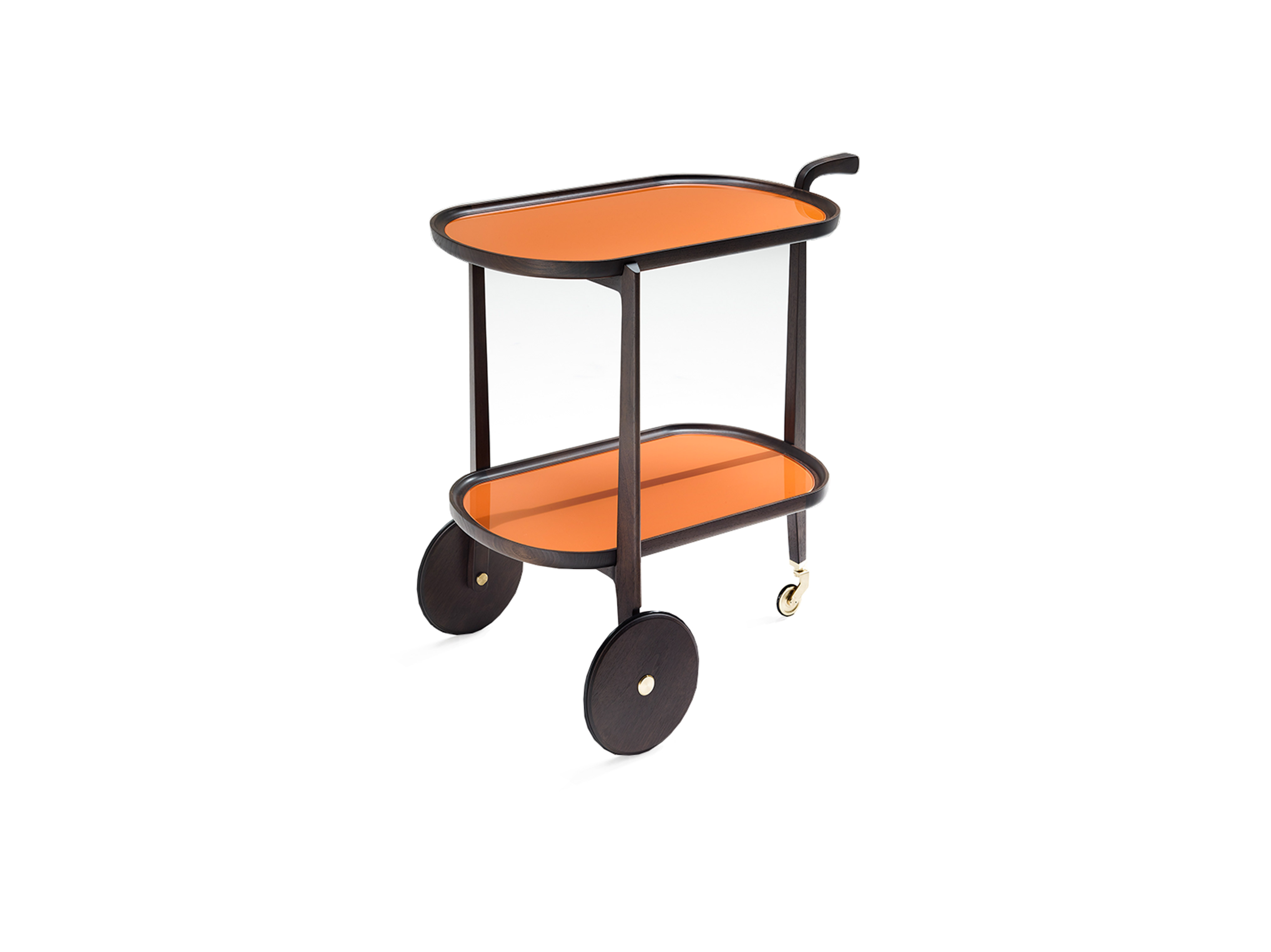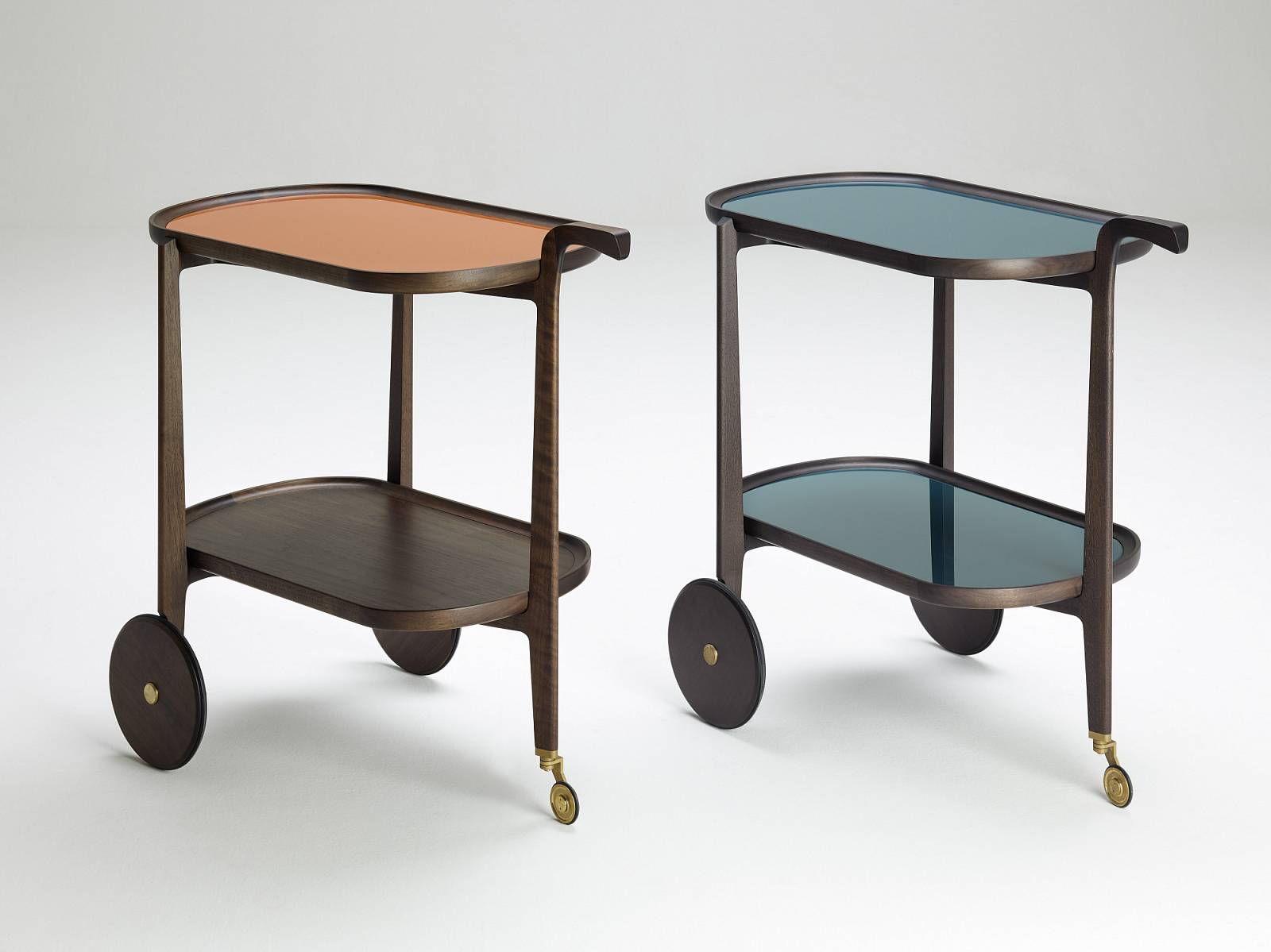 Тележка для бара из массива американского ореха с двумя подносами, верхняя часть из дерева или цветного стекла, фурнитура из латуни. верхний