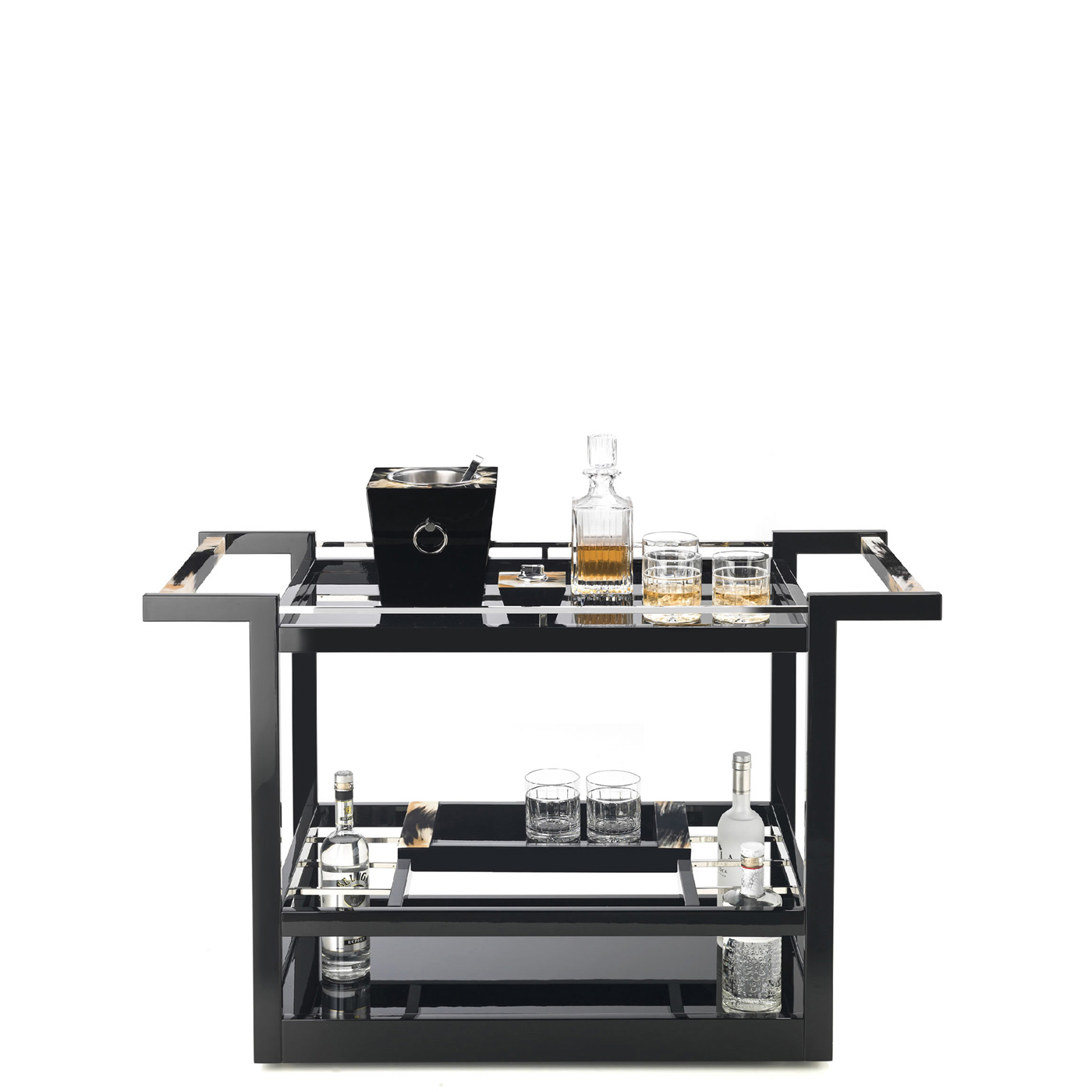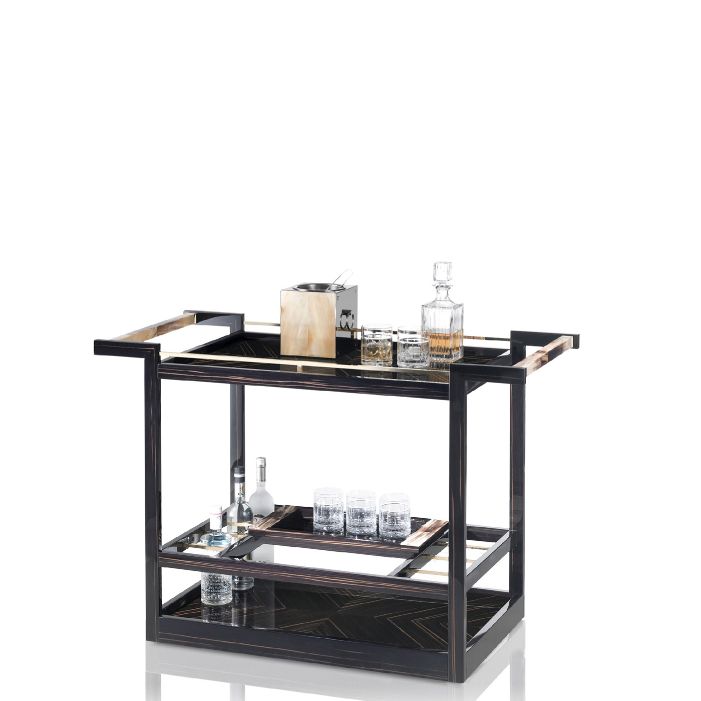 Созданная для комфортного приёма гостей, тележка Elia — идеальный выбор для хранения барных аксессуаров или изысканной сервировки напитков и закусок без ущерба для элегантности. Лаконичный дизайн конструкции из глянцевого эбенового дерева дополнен утонченными деталями из рога, которые придают этой сервировочной тележке эксклюзивный характер.