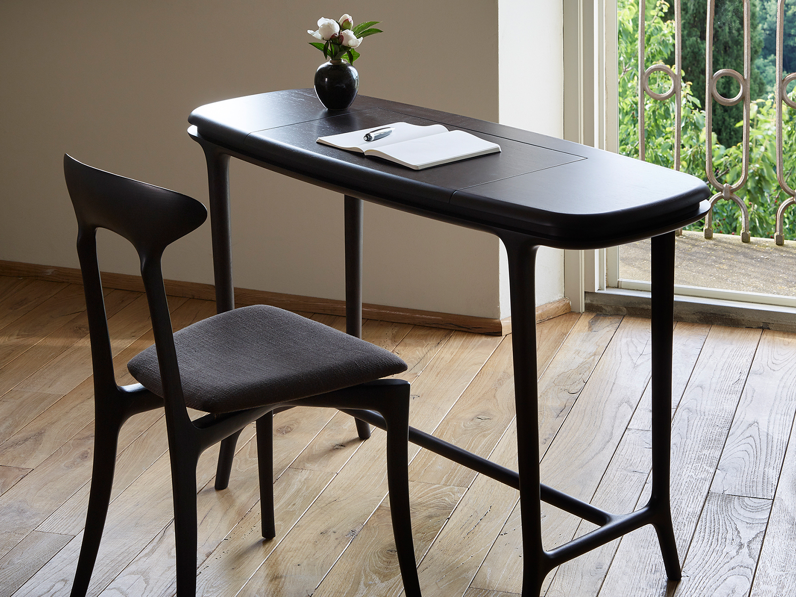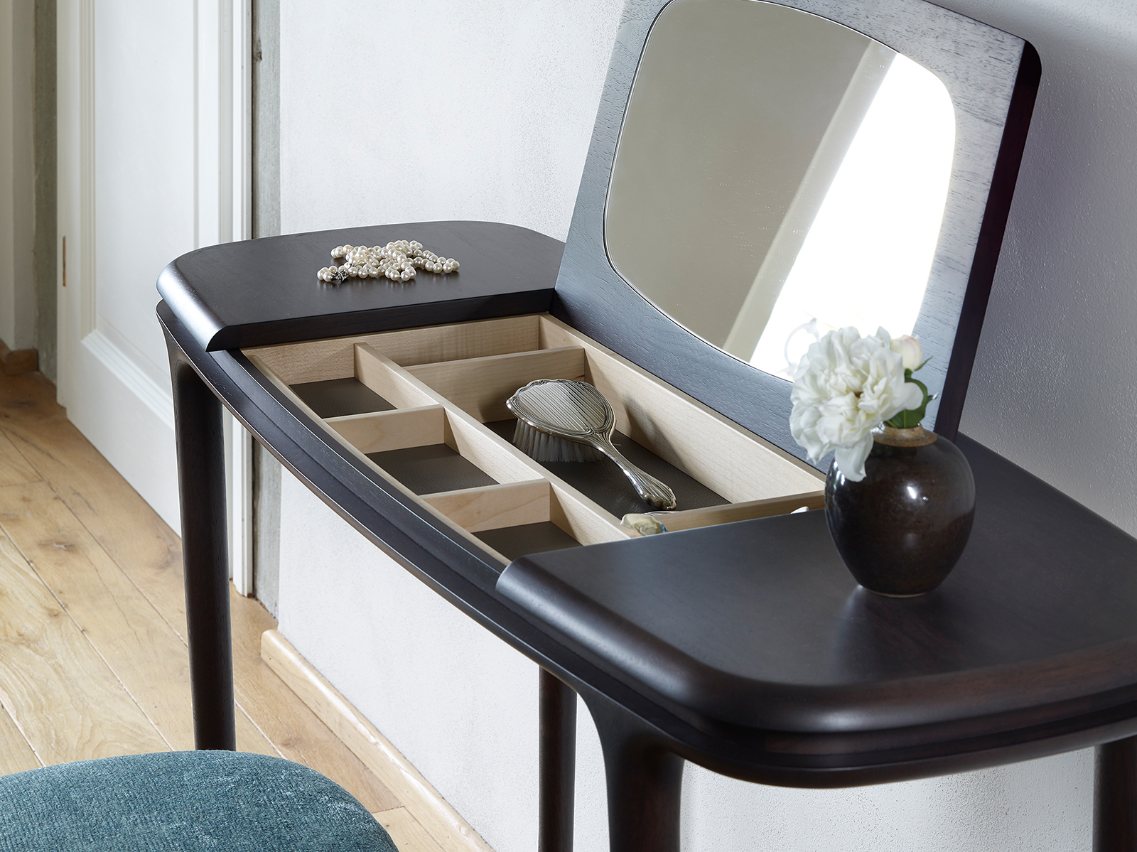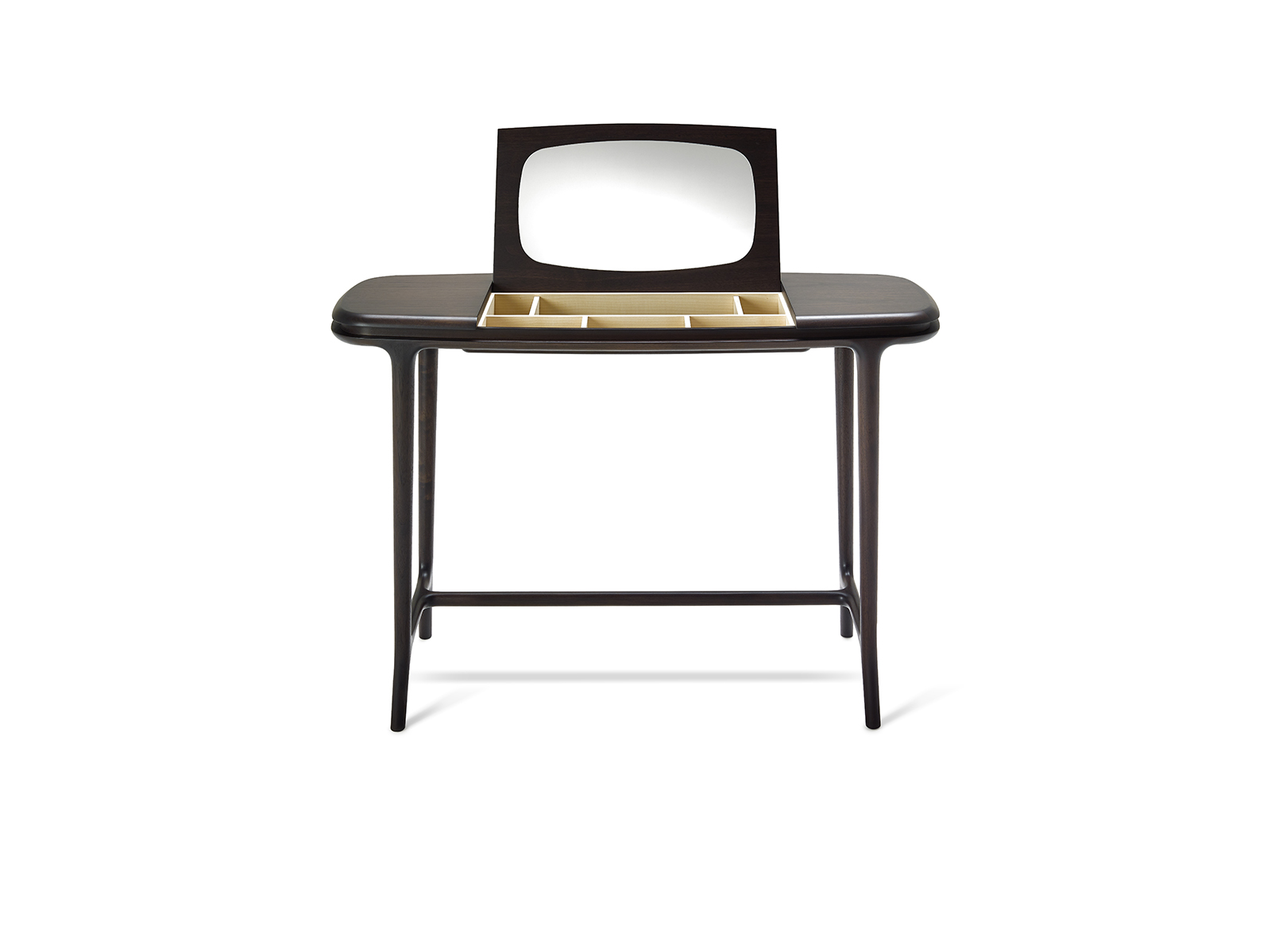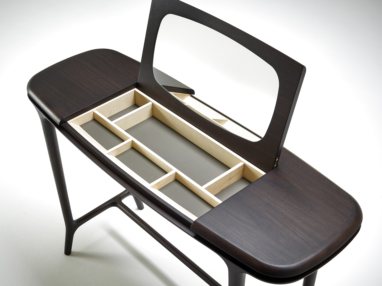 Небольшой письменный стол из массива американского ореха .Туалетный столик Dorotea с центральной откидной столешницей с зеркалом, внутренние перегородки из клена.