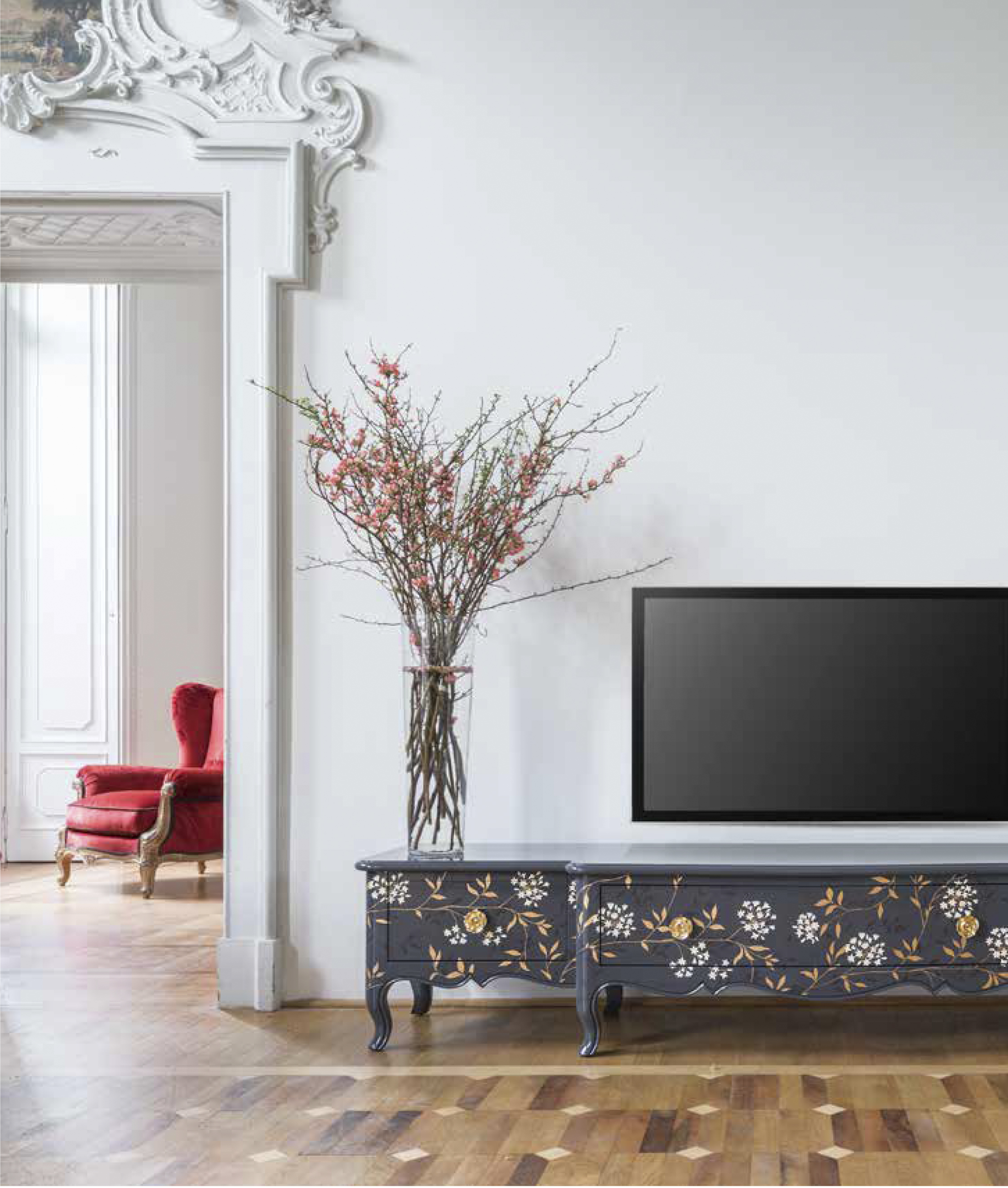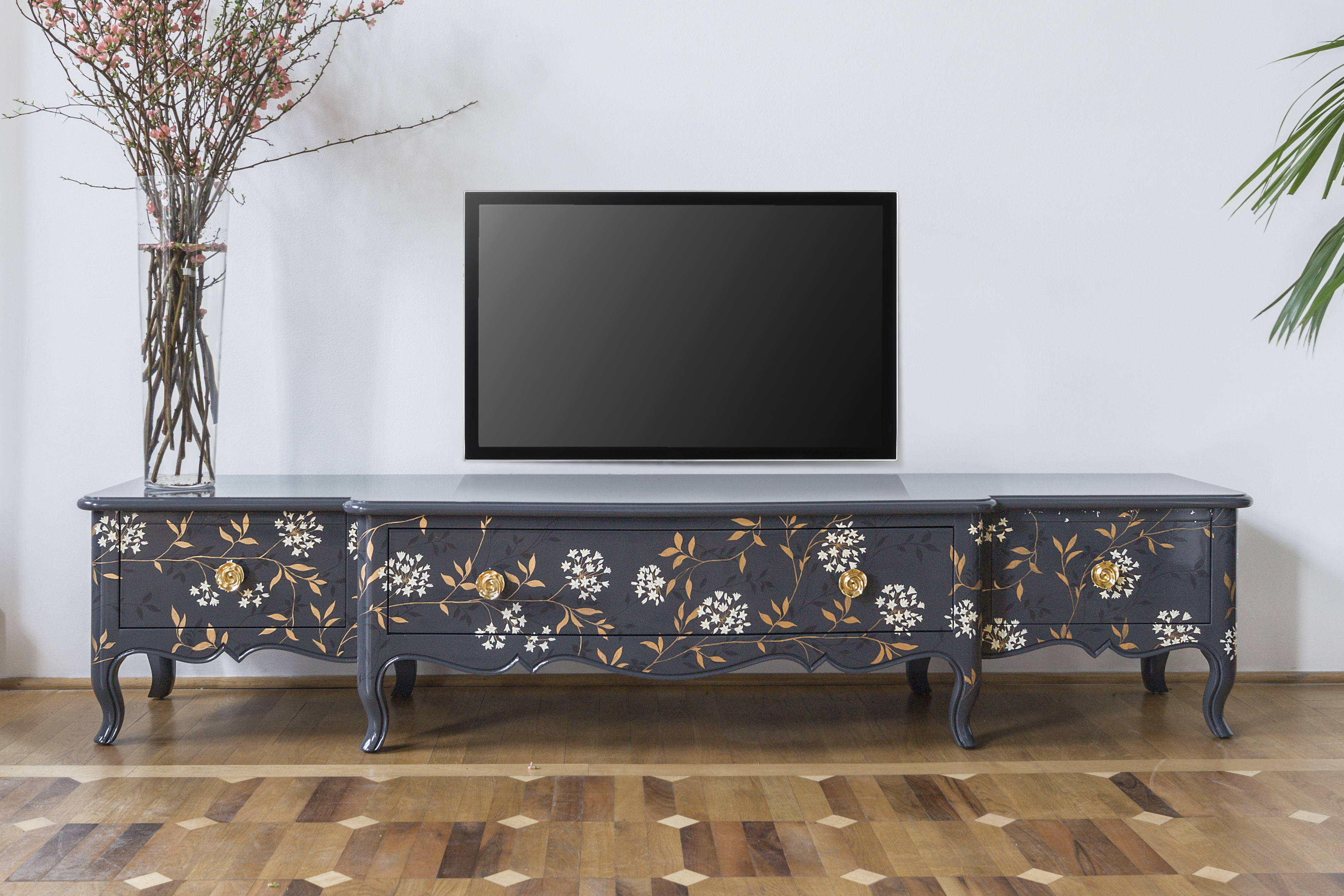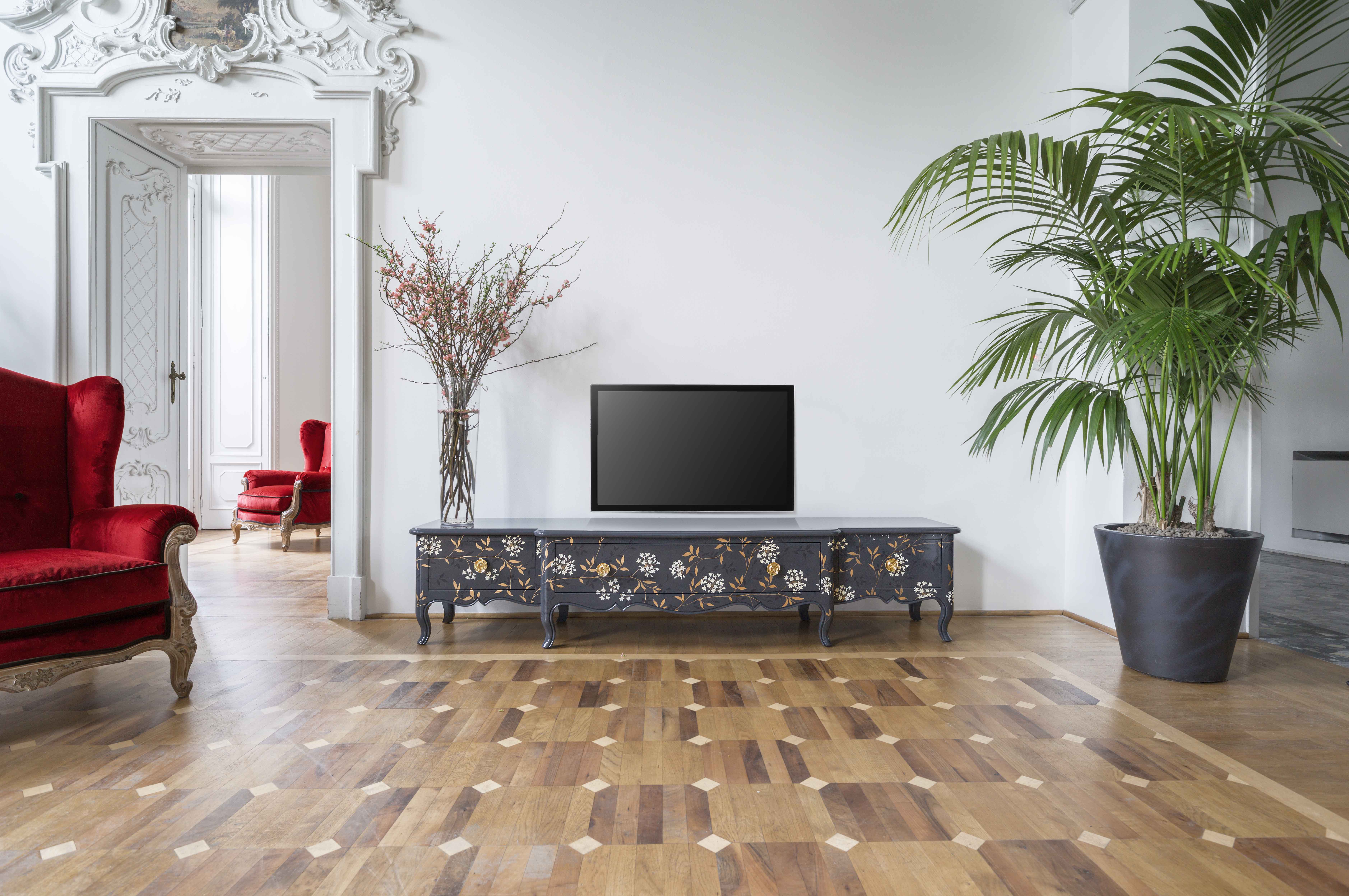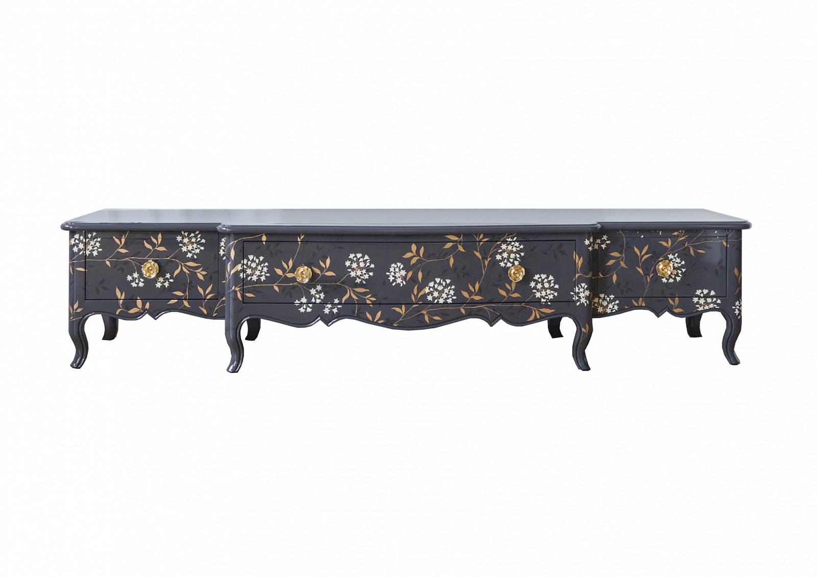 Тумба под телевизор Людовик XV 1 центральный ящик, 2 боковые дверцы, деревянная столешница. Доступен и без украшений. ОТДЕЛКА GL GRIGIO с декором из полихромных цветов, golden brass.