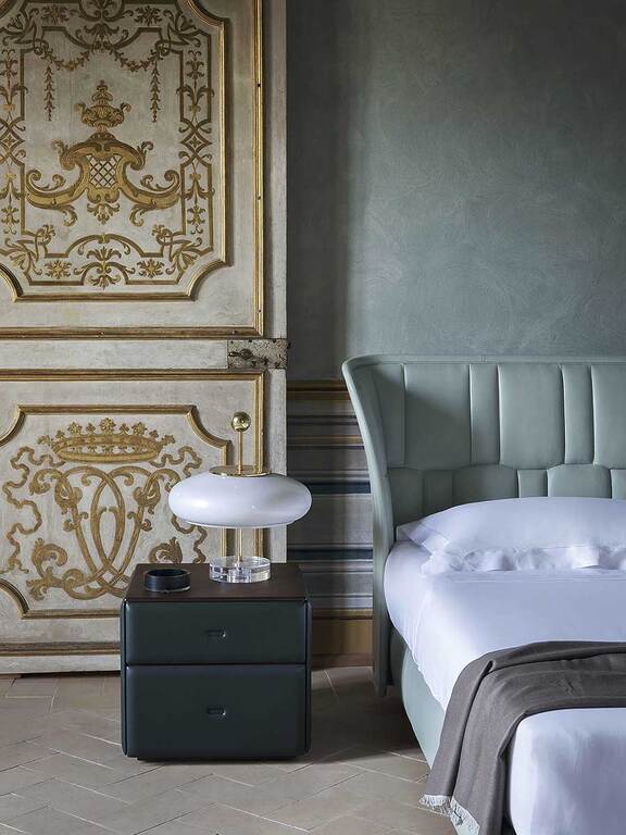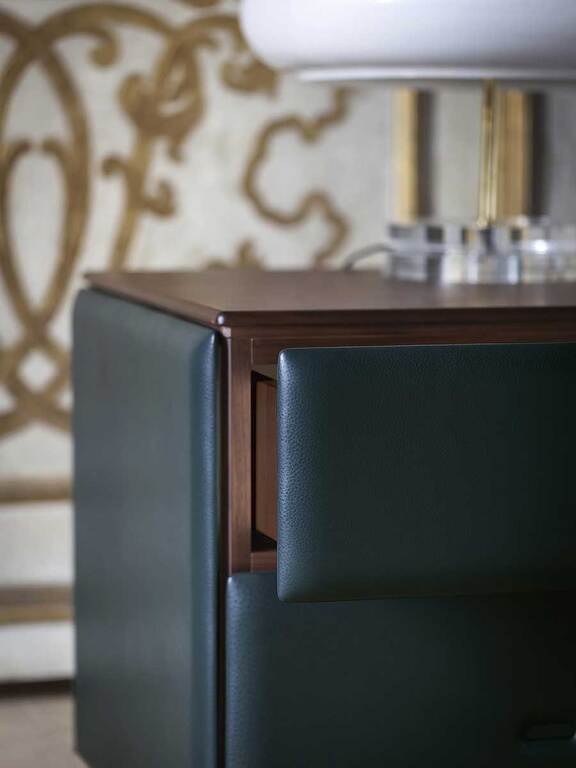 Каждый аксессуар коллекции Moondance изготовлен вручную, словно уникальный шедевр. Полностью обтянутые кожей Pelle Frau®, они дополнены мягкой подкладкой, которая приятна на ощупь и радует глаз. Столешница излучает тепло ореха Каналетто и естественную красоту прожилок мрамора Calacatta Gold с полуглянцевой отделкой.